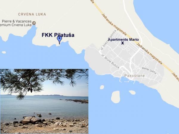 Apartmán Mario se nachází v rodinném domě a je obklopen zelení. Apartmány mají výhled na moře, takže z terasy máte nádherný výhled na Kornati. Díky své ideální poloze jsou 900 metrů od moře a Vranského jezera, což vám dává jedinečnou příležitost zaplavat si v moři nebo v jezeře ve stejný den. Nabízíme výborné ubytování všem naturistickým hostům, kteří se mohou koupat na pláži FKK Pilatuša. Pro naše hosty jsme zajistili velké parkoviště a další vybavení: welcome drink, velký gril, další venkovní sprchy, oplocený dvůr vhodný pro malé děti atd. Pro všechny naše cyklisty je v okolí ideální cyklostezka Vranské jezero. Jsme jen 2,5 km od Fun Parku Mirnovec. , takže vám můžeme poskytnout kvalitní ubytování, když se rozhodnete tento park navštívit
