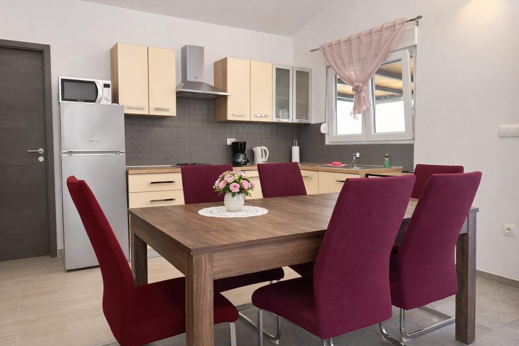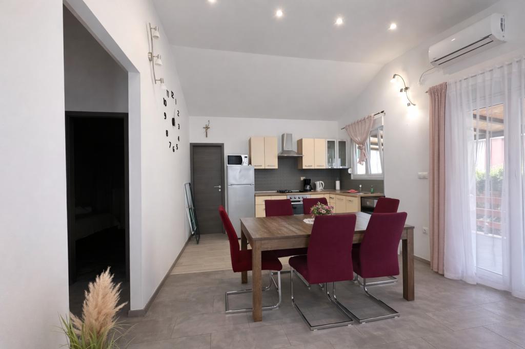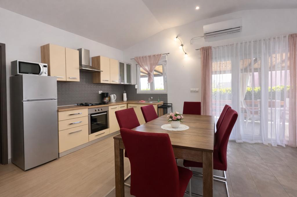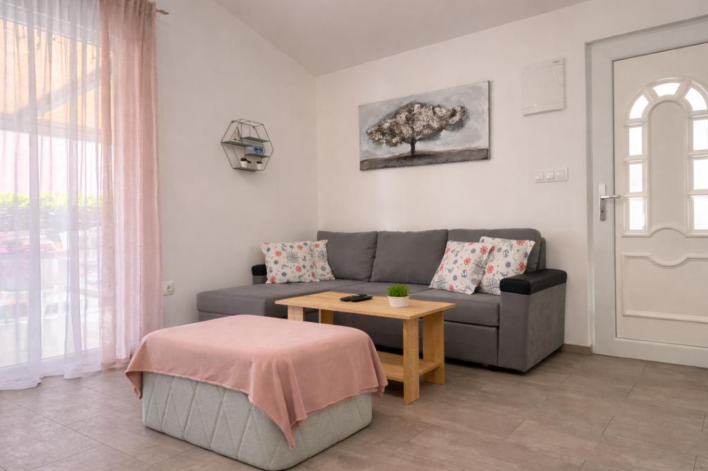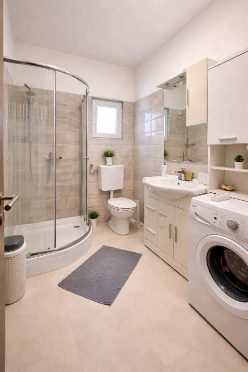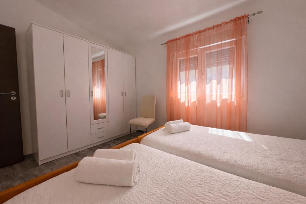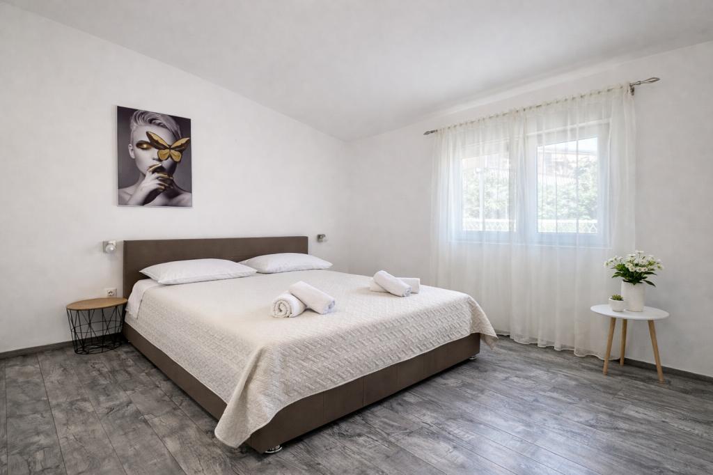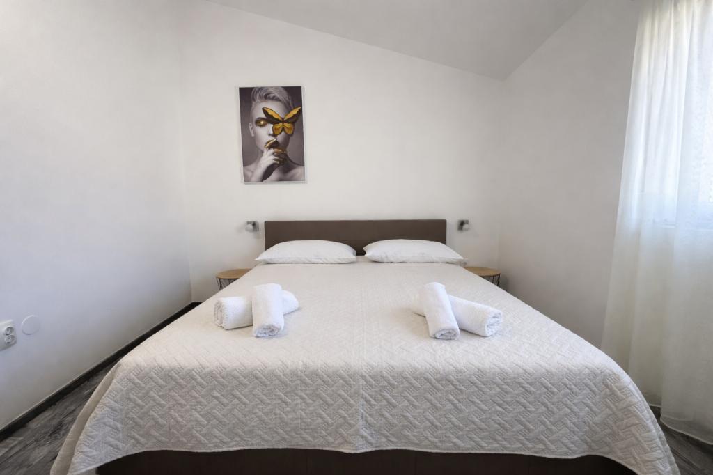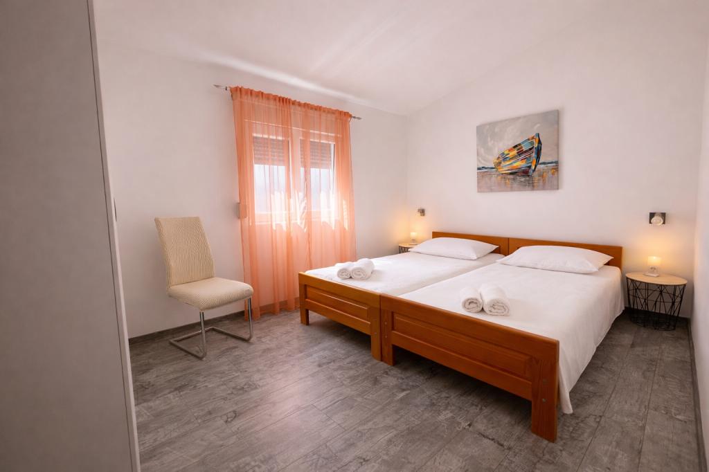 Ubytování pojme až 5 osob a má dvě ložnice s manželskými postelemi (160x200) a přistýlku pro dítě do 12 let v obývacím pokoji. Hosté mají k dispozici ložní prádlo a ručníky, koupelnu se sprchou a pračkou, útulný obývací pokoj s TV a plně vybavenou kuchyň (lednice, sporák, trouba, myčka nádobí, rychlovarná konvice a nádobí). Krytá terasa je ideální pro ranní kávu nebo relaxaci a hosté mají přístup k soukromému parkovacímu místu. Dvůr je oplocený. Ubytování se nachází 800-900 m od nejbližší pláže, zatímco obchod a pekárna jsou vzdáleny pouhých 100 m. Ubytování je snadno dostupné z dálničního sjezdu u Pakoštane, asi 15 minut jízdy autem. Vítejte! :) Pro všechny dotazy prosím použijte kontaktní formulář! DĚKUJEME :) Ceník pro sezónu 2026 byl aktualizován!