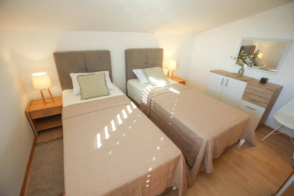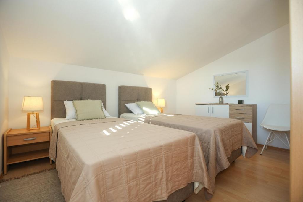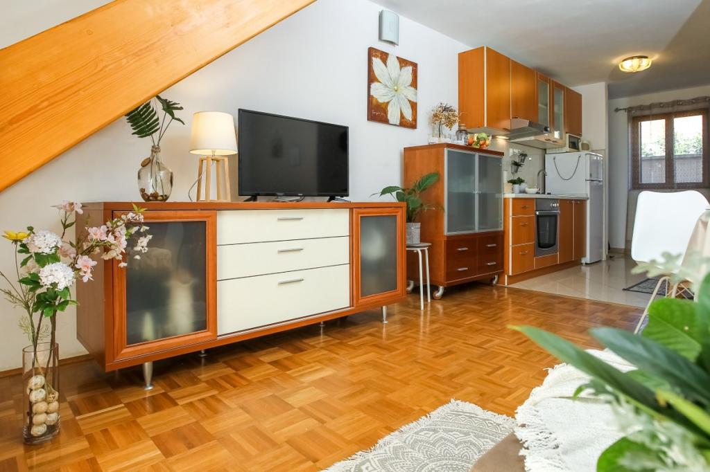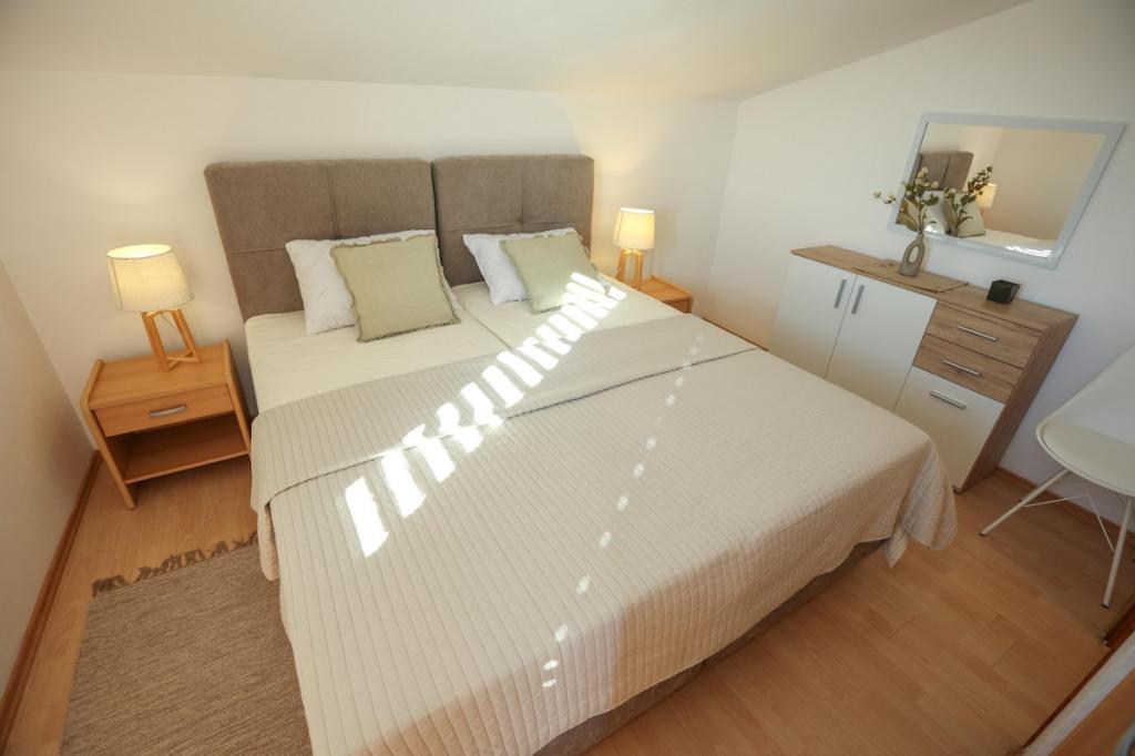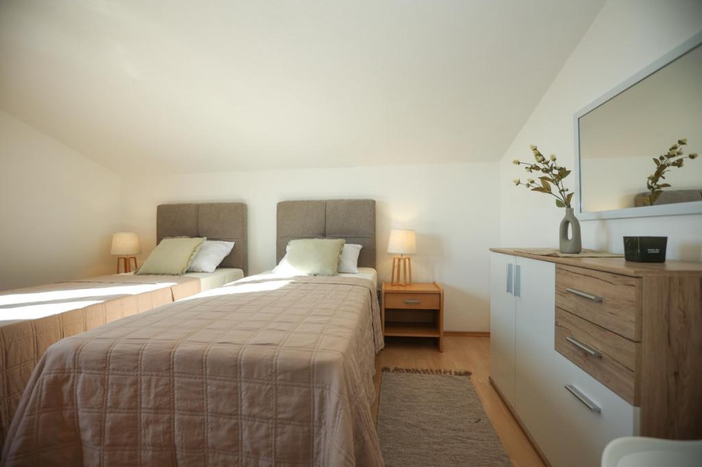 Naše zařízení vyzařuje příjemnou, domáckou atmosféru, kde se hosté mohou cítit uvolněně a skutečně vítáni. Nachází se na výborném místě, pouhých 400 metrů od centra města, přičemž veškerá potřebná občanská vybavenost je v dosahu – nejbližší obchod je vzdálený pouhých 30 metrů. Dům se skládá ze tří ubytovacích jednotek, každá s vlastním balkonem, kde si můžete vychutnat ranní kávu nebo pohodové večery. Největší apartmán má navíc tři prostorné terasy, které poskytují ještě více prostoru pro venkovní pobyt a společné chvíle. Hosté mají také přístup do společného venkovního prostoru, který zahrnuje prosklený altán s kuchyní, vnitřním krbem a velkým stolem, ideálním pro společenské setkání a venkovní stolování. Tento teplý a útulný prostor se nachází uprostřed zeleně a poskytuje klidné prostředí pro relaxaci, konverzaci a vytváření krásných vzpomínek. Ubytování je vhodné pro různé typy hostů, a je obzvláště příjemné pro rodiny s dětmi, které si mohou bezstarostně hrát v bezpečném a prostorném prostředí. Každý apartmán má také vlastní venkovní parkovací místo, aby byl váš pobyt co nejjednodušší a bezstarostnější. Jako hostitelé jsme vždy k dispozici, abychom vám poskytli rady, doporučení nebo pomohli s organizací vašeho pobytu - chceme, abyste se cítili jako doma a z Pakoštane si odvezli jen krásné vzpomínky.