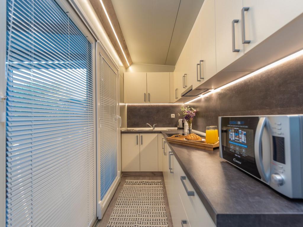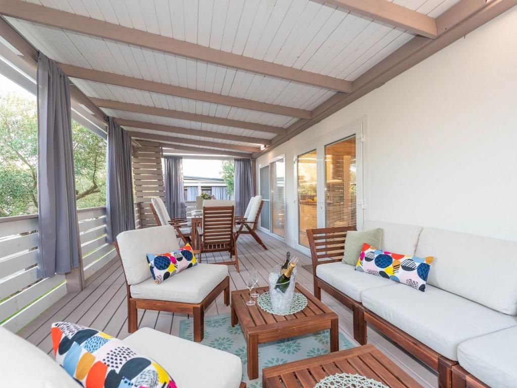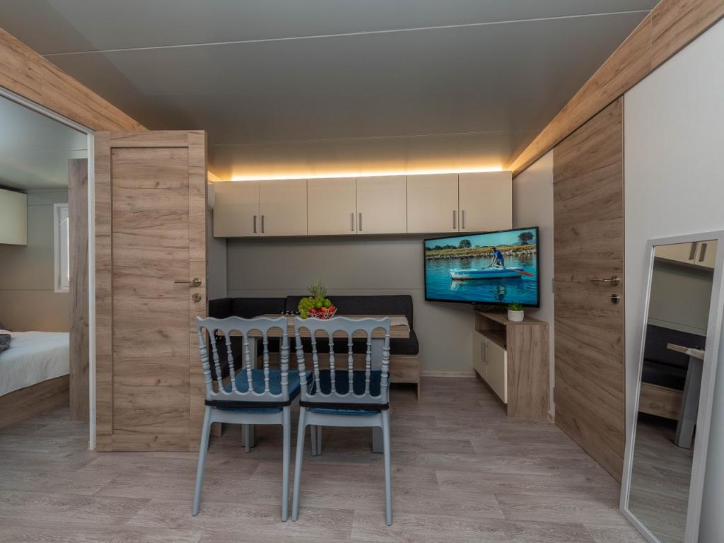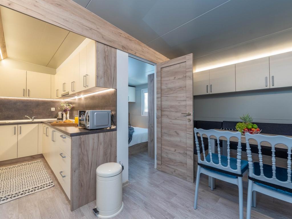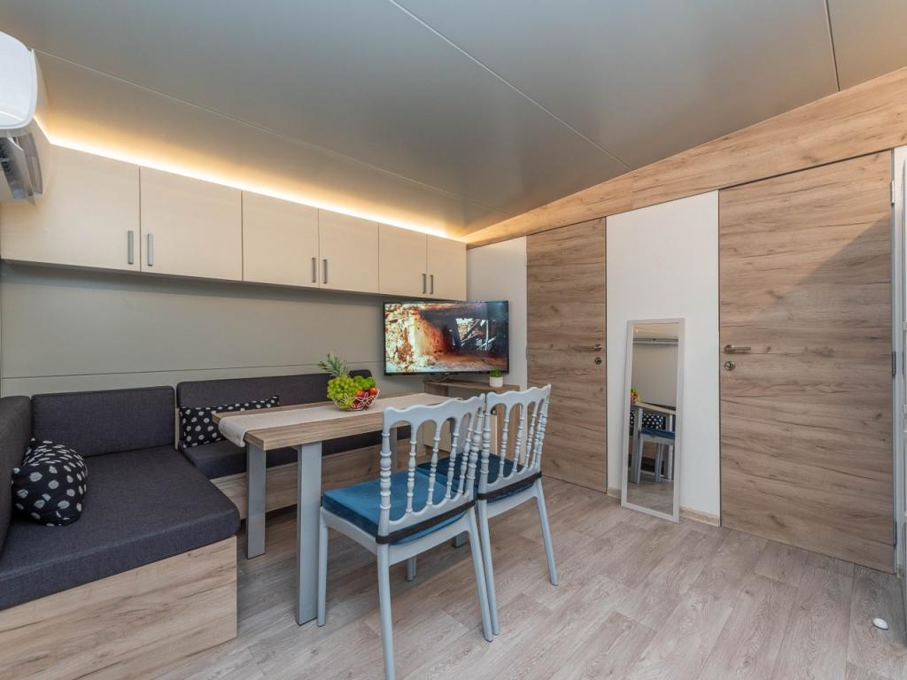 Náš nově otevřený kemp v klidné části Pakostane je ideální pro každou dovolenou. V rozsáhlém terénu u moře máme v provozu 2017/18 dvanáct zcela nových mobilních domů. ročně. V tichu nedotčené přírody jsme se ubytovali jako jeviště, kde můžete pozorovat nádherné dalmatské moře, slunce a ostrovy. Domy jsou obklopeny olivovníky, které se v noci zdají fantastické. Každá chata má prostornou terasu o rozloze 24 m2, na které se nachází jídelní stůl a rohový stůl pro odpočinek po celou dobu dne. Interiér chaty byl zrekonstruován a nebude mít nedostatek komfortu a relaxace ve středomořském stylu. Kemp je vzdálen od centra 10 minut pěšky. Je také ideální pro cykloturistické skupiny díky velkému počtu ubytovacích zařízení a blízkosti cyklostezek. Možnost uspořádání večeře pro skupiny.