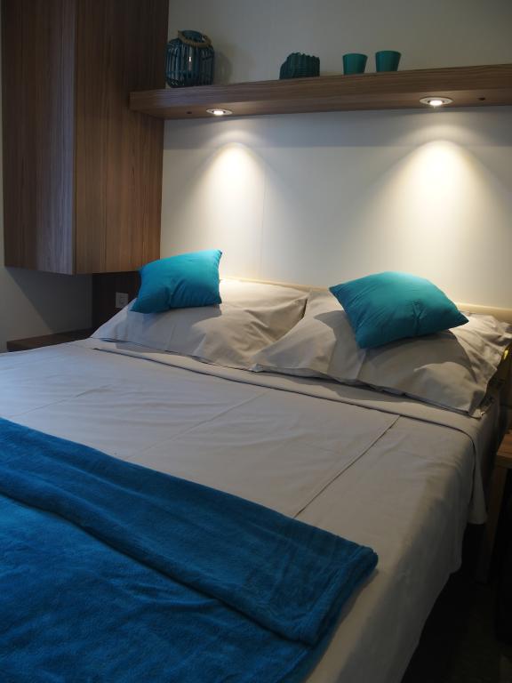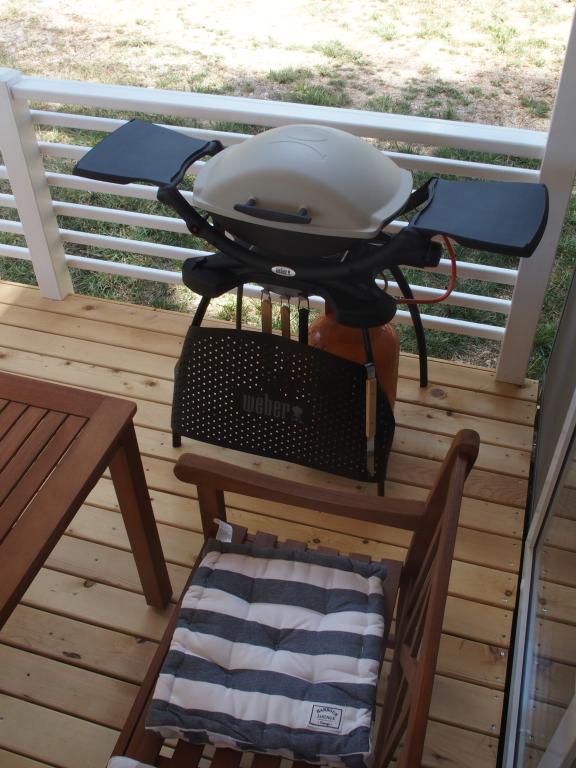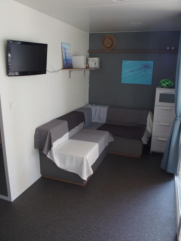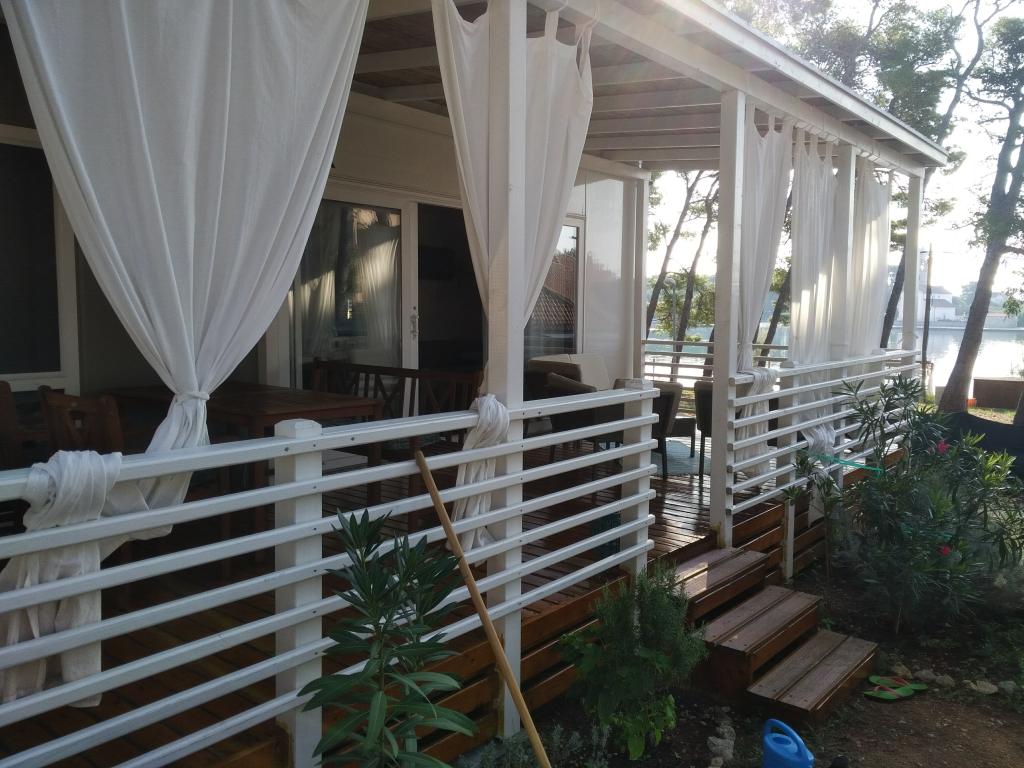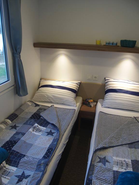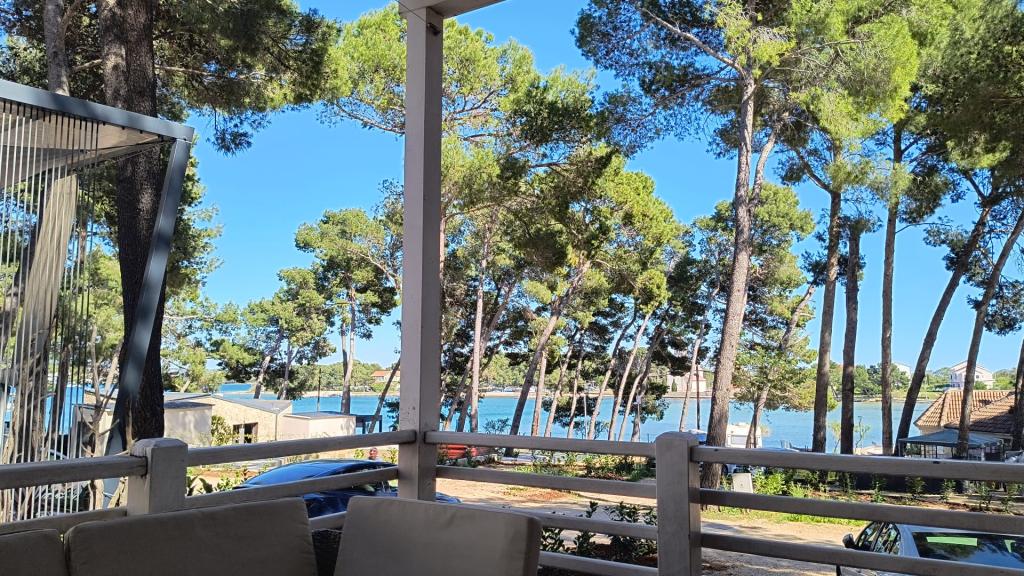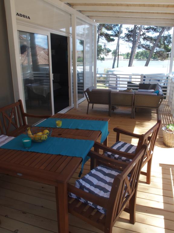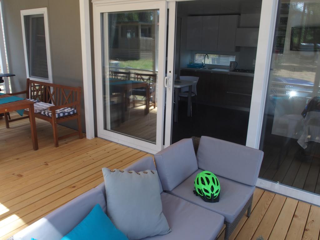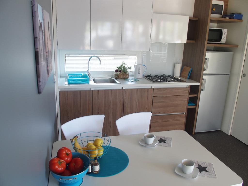 Luxusní mobilní dům se nachází v přírodním „hlubokém stínu“ borového lesa, pouhých 20 m od písečné pláže. S velkou otevřenou terasou s výhledem na moře, 2 ložnicemi, plně vybavenou kuchyní a koupelnou a velkým obývacím pokojem s další rozkládací pohovkou je tento rekreační dům ideální volbou pro relaxační rodinnou dovolenou. Poskytuje pohodlné ubytování pro 4 osoby, maximální kapacita je 4 + 1 osoba. Terasa má posezení pro relaxaci, jídelní stůl až pro 6 osob a také plynový gril. Pouhých 20 m odtud se nachází krásná a bezpečná pláž s písečným mořským dnem, která se táhne od jednoho konce zálivu k druhému. Podél pobřeží, několik kilometrů v obou směrech, se nacházejí další pláže různých typů, které můžete prozkoumat. Uvnitř kempu mají hosté přístup k bazénu se zařízenou opalovací plochou s bezplatnými lehátky a také k kavárně s barem. Terasa domu je umístěna tak, že máte otevřený výhled na celý záliv a bazén.