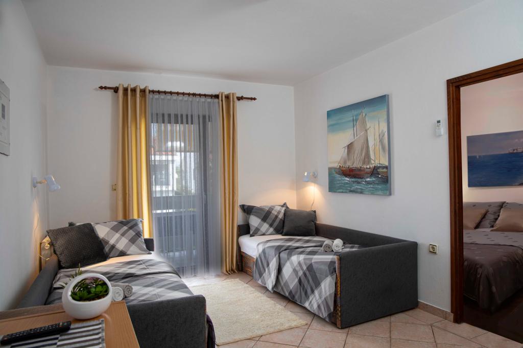 Apartmány jsou čisté a čisté a vybavené vším, co potřebujete pro krátkodobý nebo dlouhodobý pobyt. Majitel je přátelský, přístupný a ochotný se vším pomoci. Pláže jsou doslova na dosah ruky, minutu chůze (s malým dítětem), ať se vydáte kterýmkoli směrem. Téměř vždy se dá najít ochlazovač a pro děti je tu i jemná písečná pláž s mělkým mořem, kde jsou místa v kteroukoli denní dobu. V místě je dostatek kaváren, restaurací, pizzerií, obchodů se suvenýry... Auto je doslova zbytečné (a můžete ho nechat na vyhrazeném parkovišti ve stínu u apartmánu), protože vše je v dosahu pár minut chůze. Jakékoliv doporučení na byt.
