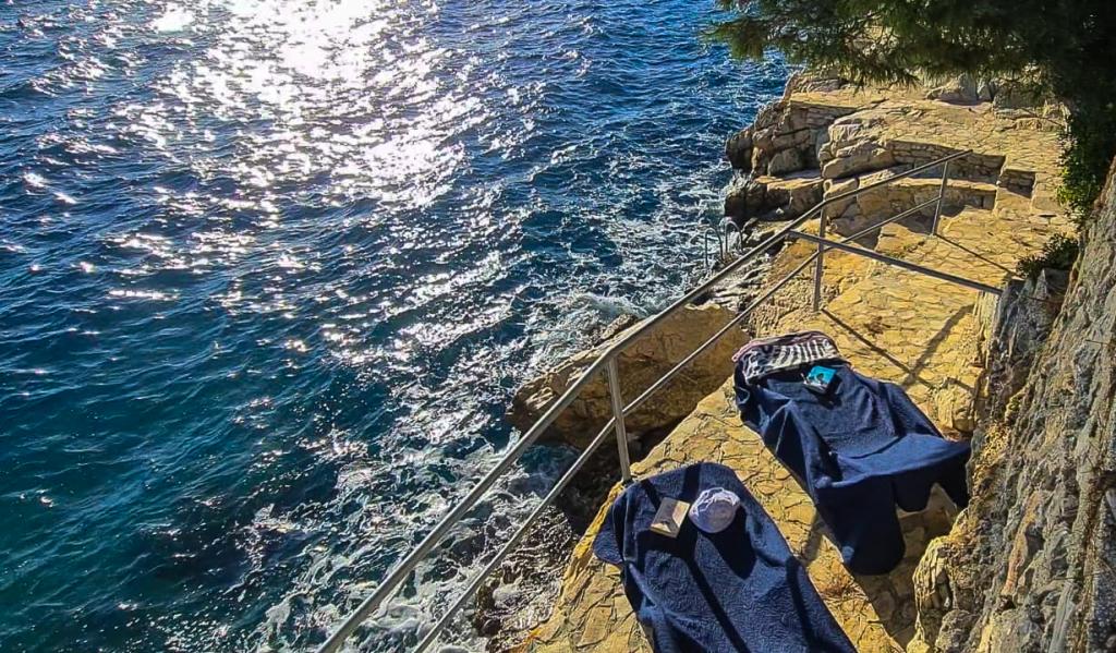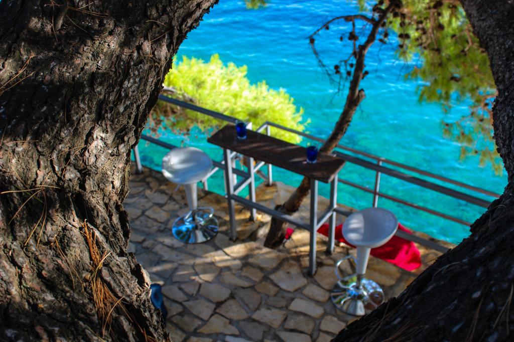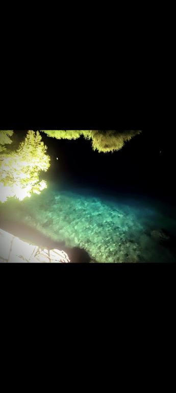 Garantovaná dvě lehátka na apartmán ve stínu borovic. Na pláži je také venkovní sprcha. Bodové světlo na pláži pro noční koupání pod domem.