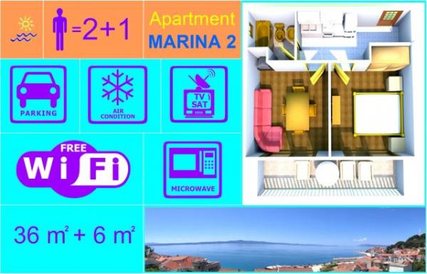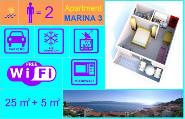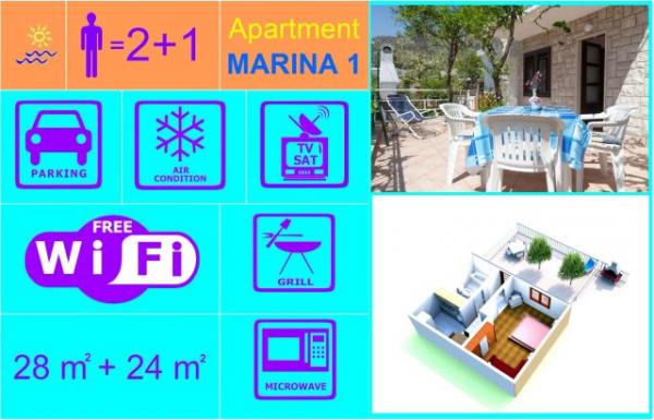 Apartmán MARINA 1 (2 1) se nachází v přízemí. Celková plocha bytu je 28 m2 s přilehlá zahradní terasa má plochu 24 m2. Apartmán se nachází na jižní straně domu s částečným výhledem na moře. Apartmán je ideální pro rodiny s malými dětmi. Apartmán MARINA 2 (2 1) se nachází v druhém patře. Celková plocha bytu je 36 m2 a balkón 6 m2. Apartmán má úplný výhled na moře a na jih (180 °). Apartmán je ideální pro ty, kteří si chtějí vychutnat nerušený výhled na moře, ostrovy a krásné západy slunce. Apartmán MARINA 3 (2) se nachízí ve třetím patře. Celková plocha apartmánu je 25m2 a balkón 5m2. Apartmán je plně směřován k moři a nabízí dechberoucí výhled na moře (180°). Apartmán je ideální pro ty, kteří si chtějí vychutnat nerušený výhled na moře, ostrovy a krásné západy slunce.