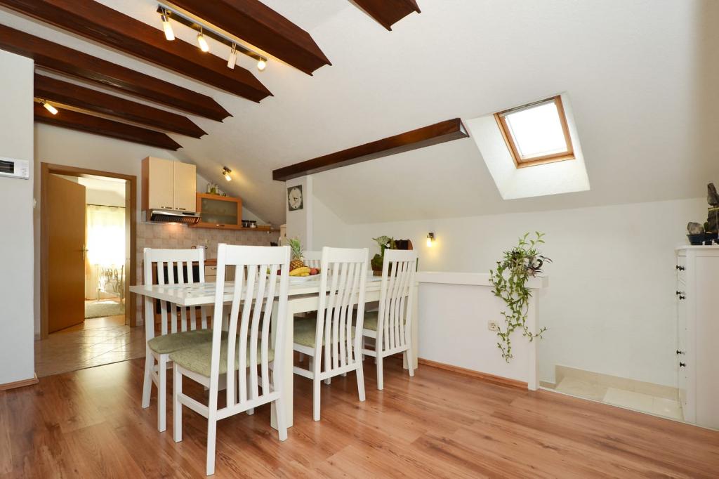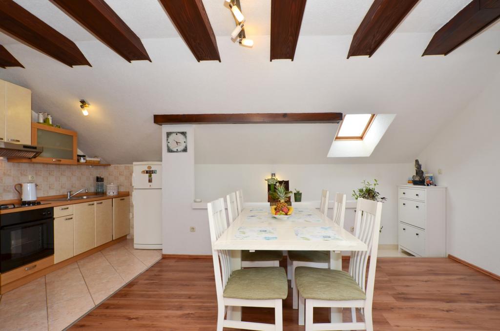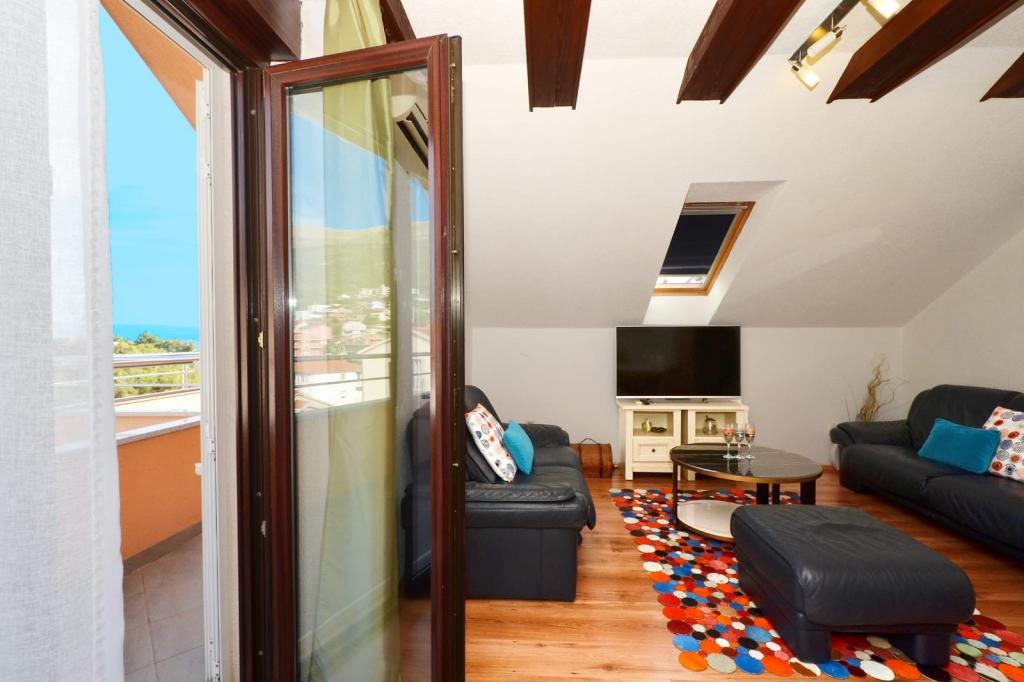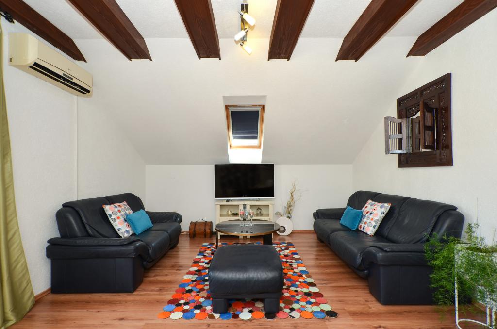 Ahoj. Byt 90 m2. 2 koupelny, velký obývací pokoj, nová TV, klimatizace, plně vybavené (od vidličky, hrnce atd. Po myčku, pračku, žehličku, prkno). Velká terasa s výhledem na hory a moře. Slušné v blízkosti pláže a dalších obchodů, pekáren. Skvělí majitelé od začátku do konce. Upřímně doporučujeme. Pokud se někdy vrátím do Chorvatska, místo bude u Toma a Aniky. Zdravím majitele.