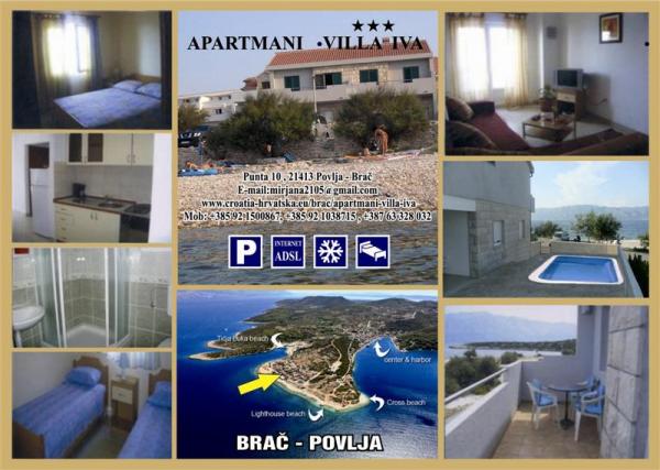 Vila Iva s apartmány je na kraji krásného, malého a klidného letoviska Povlja. Mimo ruch městečka, dochodově 5-6min, s krásným výhledem na moře. Vila Iva je můj návrat k Chorvatsku - vše odpovídá fotografiím. DVA plnohodnotné pokoje, žádné 2+2 v kuchyni! Opravdu skvělí, a ochotní majitelé. Možnost vyjížděk na kole, pěších tůr, koupání u domu i na blízkých městských plážích. K dispozici, všem je venku pračka zabudovaná pod schody a nově i letní kuchyň. Jedním slovem: SUPER. A domluvíte se tu anglicky