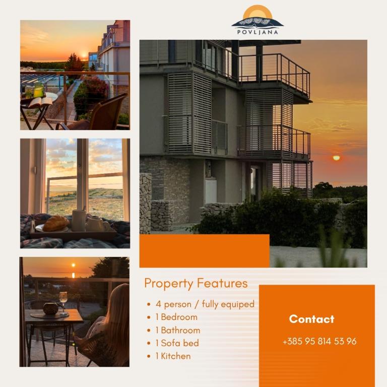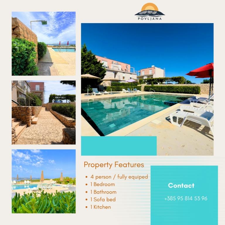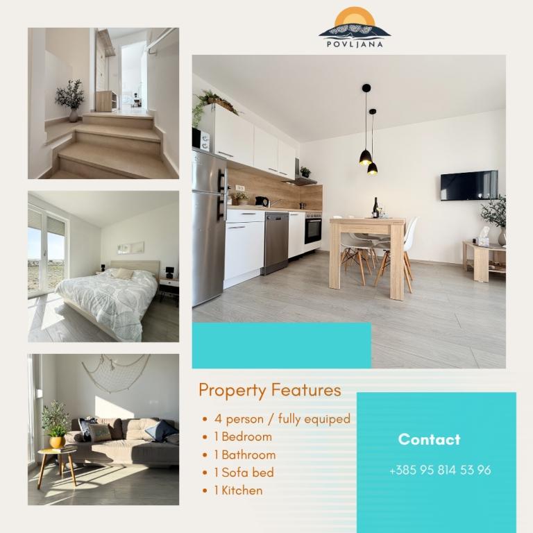 Moderně vybavený apartmán na poloostrově Rastavac s výhledem na Povljanu a Velebit v komplexu Lijepi otok. Apartmán je plně vybaven pro pohodlný pobyt. Skládá se z 1 ložnice s manželskou postelí a přistýlky pro 2 osoby v obývacím pokoji. Pro hosty apartmánu je k dispozici bezplatné parkování, bazén, gril a společné hřiště (houpačky, stolní tenis). Klidná písečná pláž se nachází hned pod komplexem, 150 m daleko. Oblázkové a další veřejné písečné pláže jsou vzdálené 2 až 4 km. V bezprostřední blízkosti (200 m) se nachází nově otevřený kemp Amines Avalon, vstup do kempu je zdarma (k dispozici: obchod, posilovna, pekárna, restaurace, aquapark). Centrum Povljany je vzdálené 4 km. Pokud hledáte klidnou dovolenou, východy a západy slunce, které vám vyrazí dech, čisté moře a nedotčenou přírodu - Povljana je pro vás tou správnou volbou.