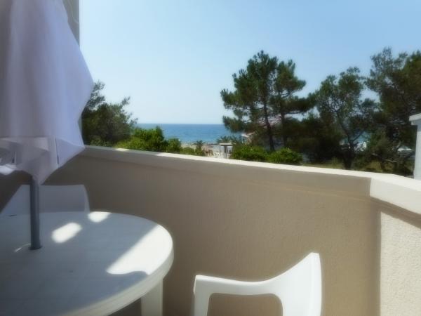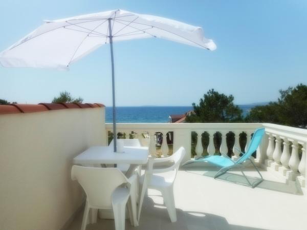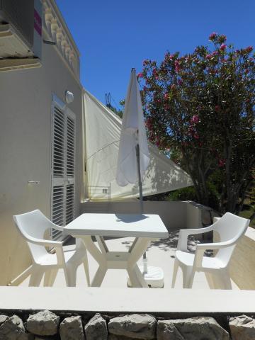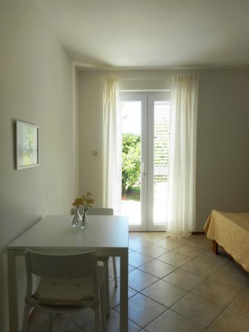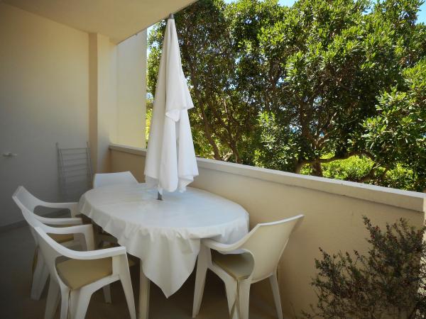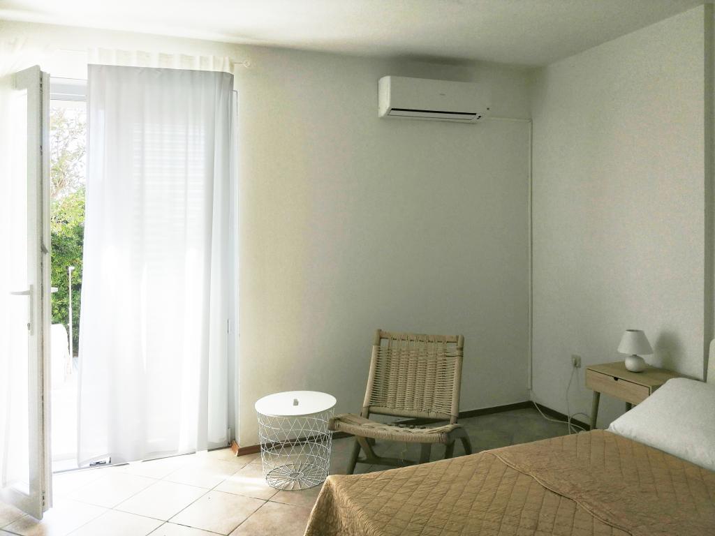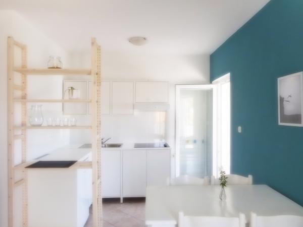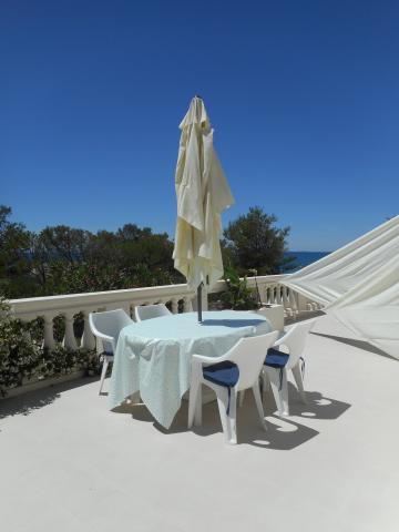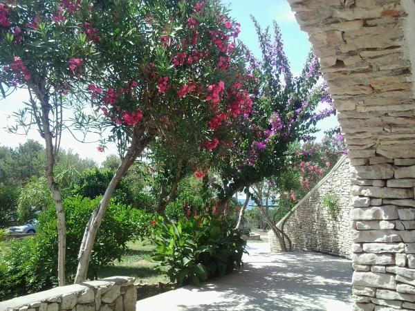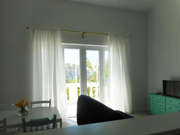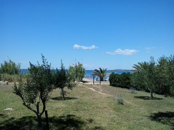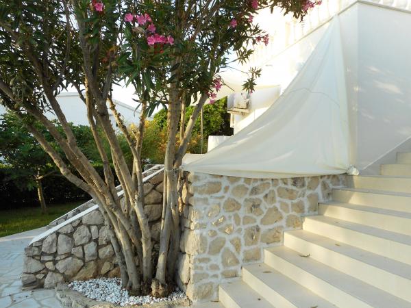 Apartmán je součástí krásně zařízeného domu s velkou zahradou. Vše v samotném apartmánu je zařízeno střídmě a je vhodné pro dovolenou. Velká terasa je přístupná z obou pokojů a má výhled na západ slunce. Je ve stínu celé dopoledne, ideální pro kávu s výhledem na moře. Zahrada je nádherný středomořský prostor plný borovic, olivovníků a nesmrtelných stromů s k dispozici lehátky a zahradním nábytkem a táhne se od domu až k pláži. Na pozemku je dostatek parkovacích míst. Fotografie nedokážou popsat pohodlí, čistotu, světlo a všechny ostatní vlastnosti tohoto ubytování. Hostitelka je mimořádně milá.