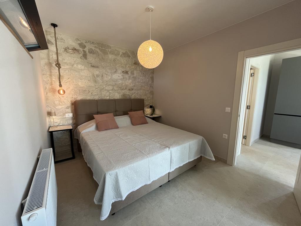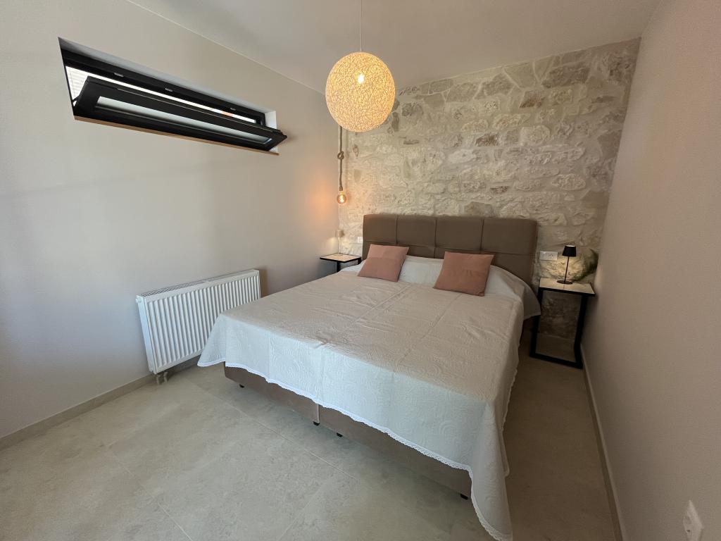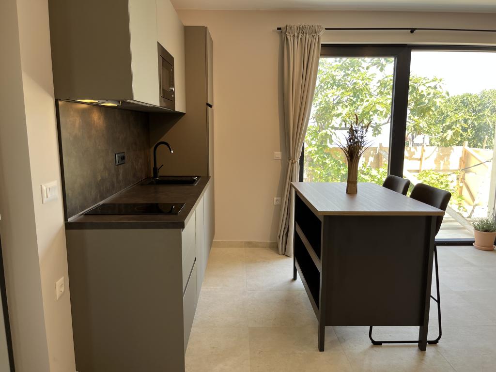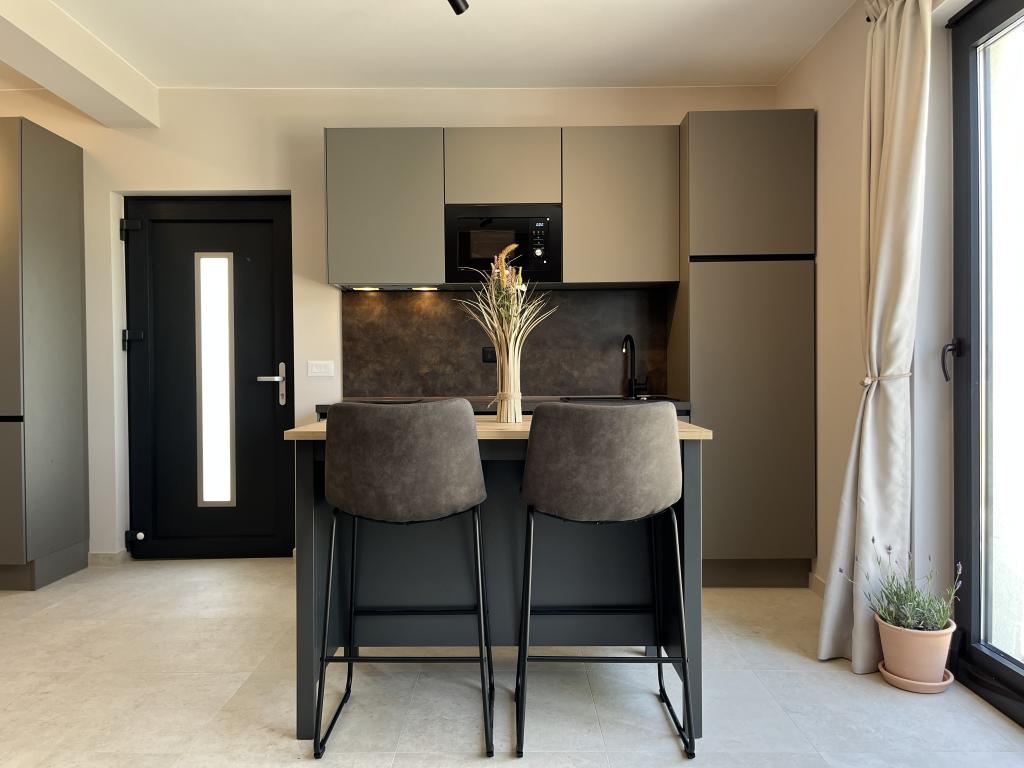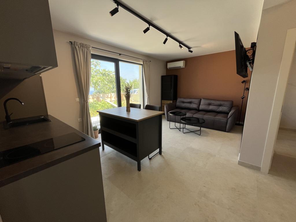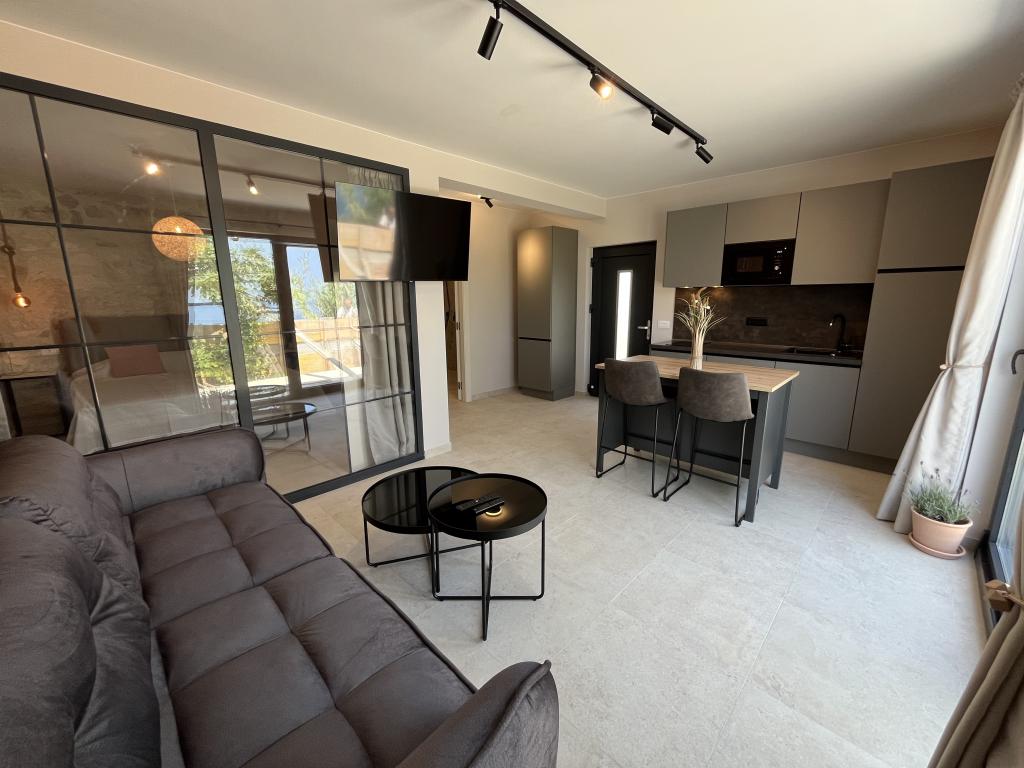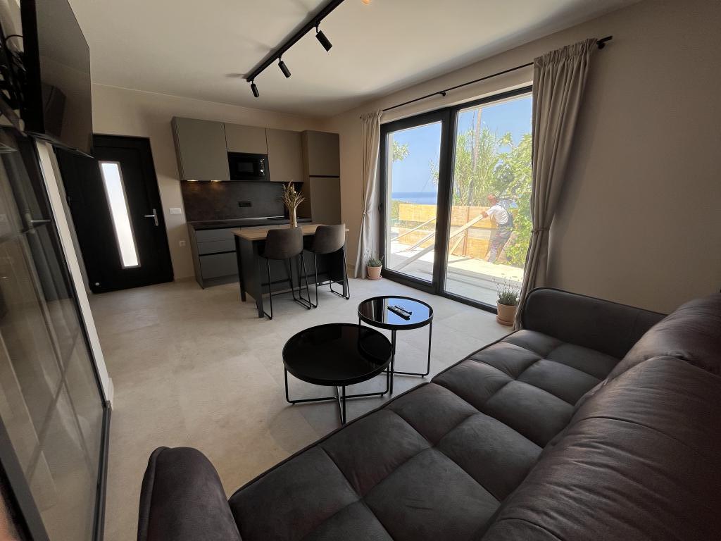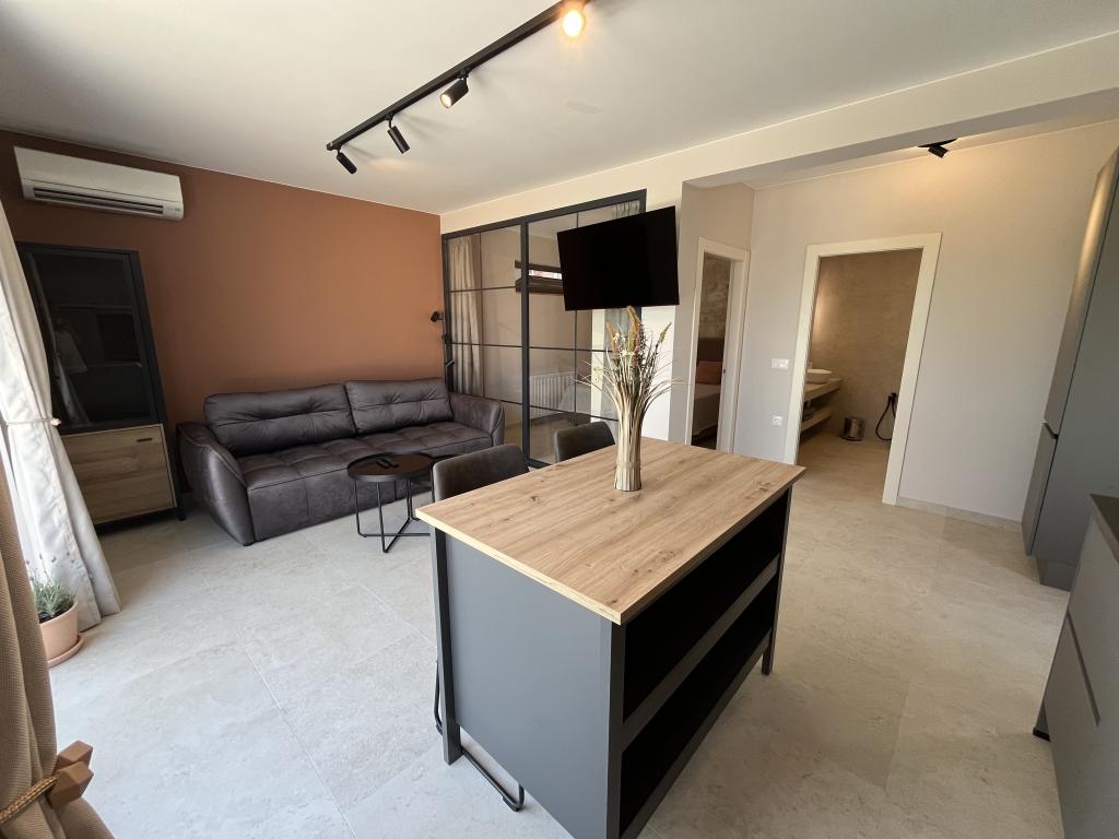 Jednoložnicový apartmán o rozloze 45 m² je vhodný pro páry, rodiny nebo jakoukoli jinou skupinu 2-4 osob s možností přistýlky pro dvě osoby nebo dětské postýlky na vyžádání. K nemovitosti patří dvě soukromá parkovací místa a terasa v přízemí orientovaná na východ a západ, kde si můžete vychutnat slunečná rána a kávu venku, stejně jako příjemné západy slunce a večery v intimní atmosféře. Interiér apartmánu je nově vybaven všemi spotřebiči, které byste mohli během svého pobytu potřebovat, jako je klimatizace, Wi-Fi, satelitní TV, kávovar, myčka nádobí, pračka, přenosná trouba, žehlička, fén a mnoho dalšího. Ložnice s pohodlnou novou manželskou postelí velikosti King má prosklenou stěnu, která vám umožní vychutnat si výhled i z postele, ale také úplné soukromí zatažením závěsů. Koupelna je vybavena dvojitým umyvadlem, toaletou, bidetem a prostorným sprchovým koutem.