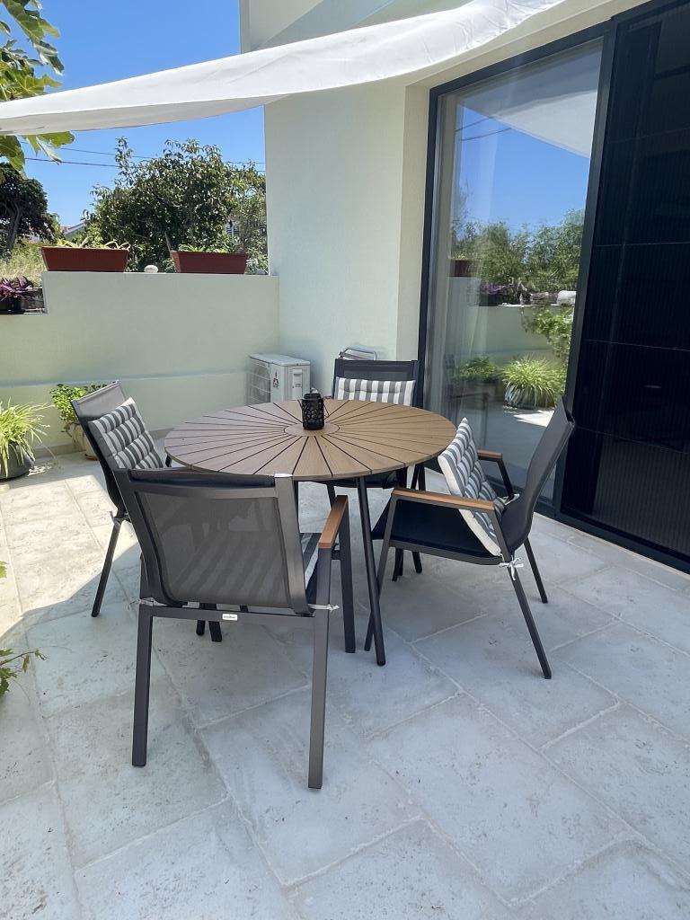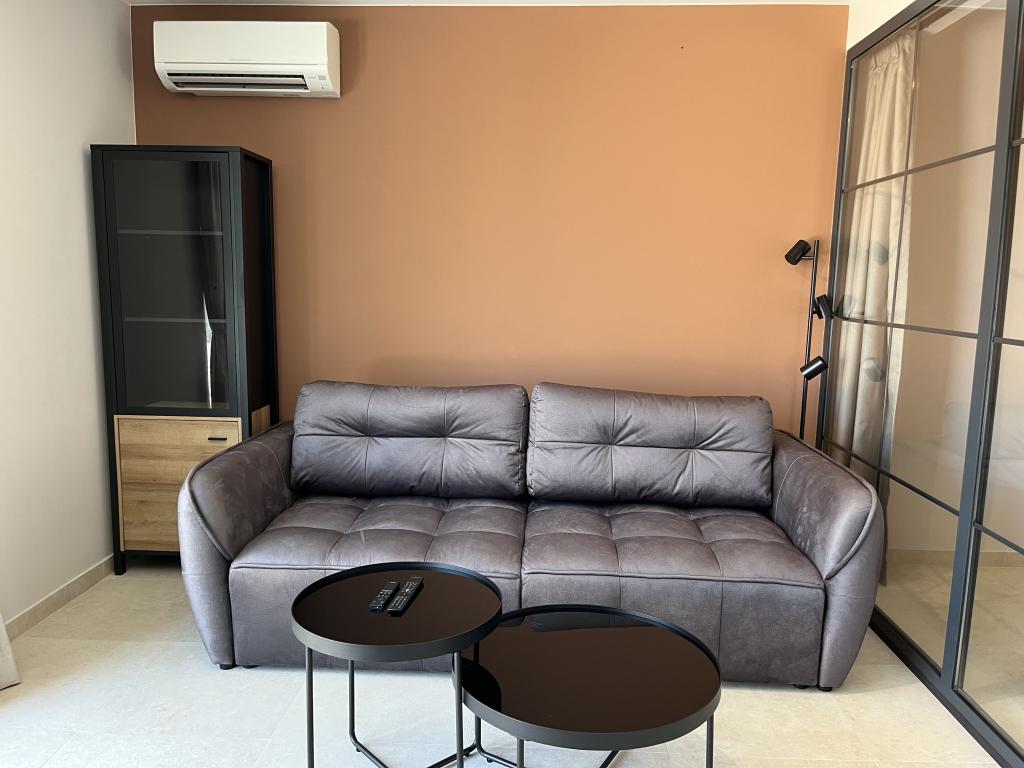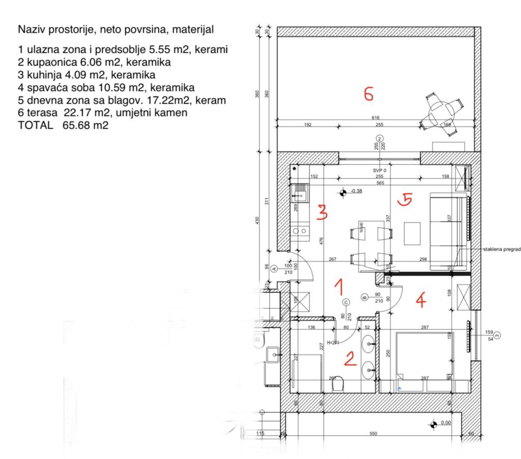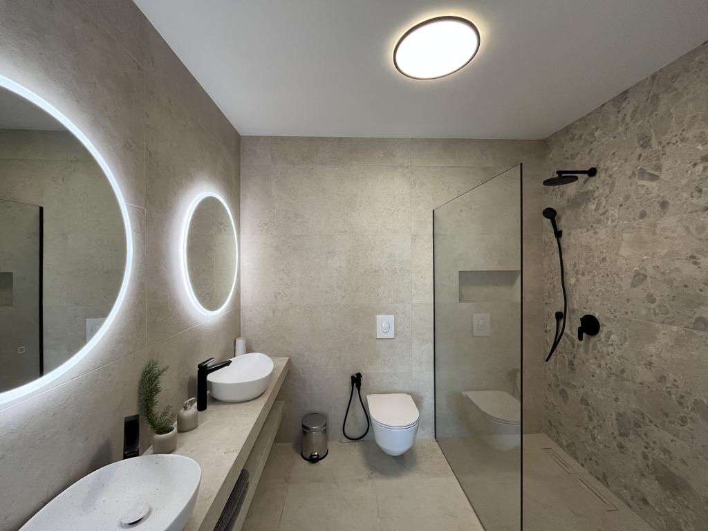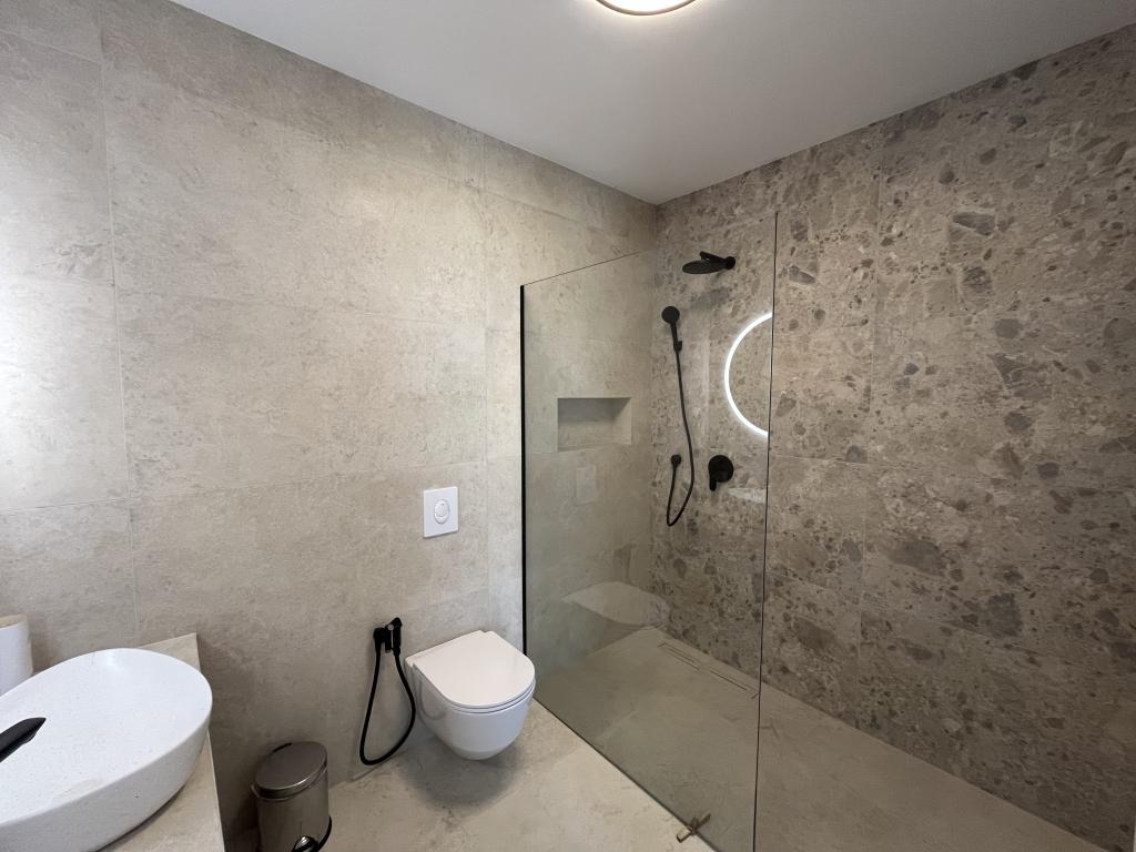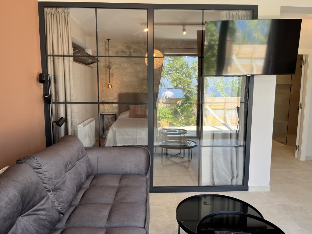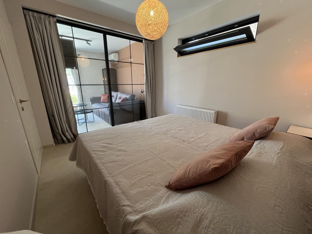 Jednoložnicový apartmán o rozloze 45 m² je vhodný pro páry, rodiny nebo jakoukoli jinou skupinu 2-4 osob s možností přistýlky pro dvě osoby nebo dětské postýlky na vyžádání. K nemovitosti patří dvě soukromá parkovací místa a terasa v přízemí orientovaná na východ a západ, kde si můžete vychutnat slunečná rána a kávu venku, stejně jako příjemné západy slunce a večery v intimní atmosféře. Interiér apartmánu je nově vybaven všemi spotřebiči, které byste mohli během svého pobytu potřebovat, jako je klimatizace, Wi-Fi, satelitní TV, kávovar, myčka nádobí, pračka, přenosná trouba, žehlička, fén a mnoho dalšího. Ložnice s pohodlnou novou manželskou postelí velikosti King má prosklenou stěnu, která vám umožní vychutnat si výhled i z postele, ale také úplné soukromí zatažením závěsů. Koupelna je vybavena dvojitým umyvadlem, toaletou, bidetem a prostorným sprchovým koutem.