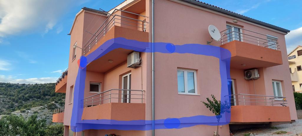 "Byt" (i když by bylo vhodnější použít slovo nora) nevypadá jako na obrázcích. První a nejsilnější dojem – je to prostě velký nepořádek, protože to nikdo neuklízí. Počínaje vchodovými dveřmi, lepícími klikami a podlahou, přes ručníky, roky nenatřené stěny až po rozbité žaluzie. Výhled z okna je především na zeď vedlejší budovy, tato část „k moři“ je z velké části zakryta nově postavenou budovou. Vstupní dveře do bytu jsou obvyklé, nejlevnější dveře od Castoramy, které nanejvýš dokážou od schodiště oddělit pokoje, nikoliv byt. Můžete slyšet všechno a všechny. Na příjezdové cestě je vrak Renaultu 4 a na chodbě několik řad palivových dřevěných pelet. Masakr. Hned po příjezdu jsme odtud utekli. Záloha 100 € samozřejmě šla vniveč, pán se najednou neovládl a rozhodl se už nemluvit. Možná to bývalo pěkné místo, ale pravděpodobně před lety. Teď dno a metr bahna se vyhnout!