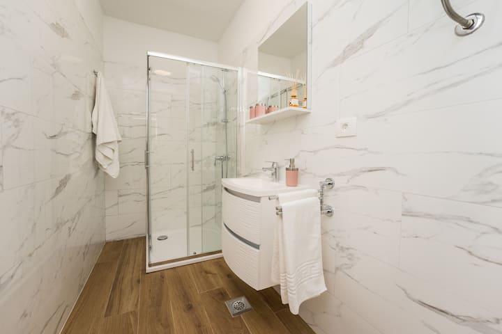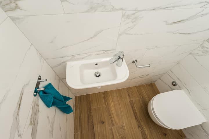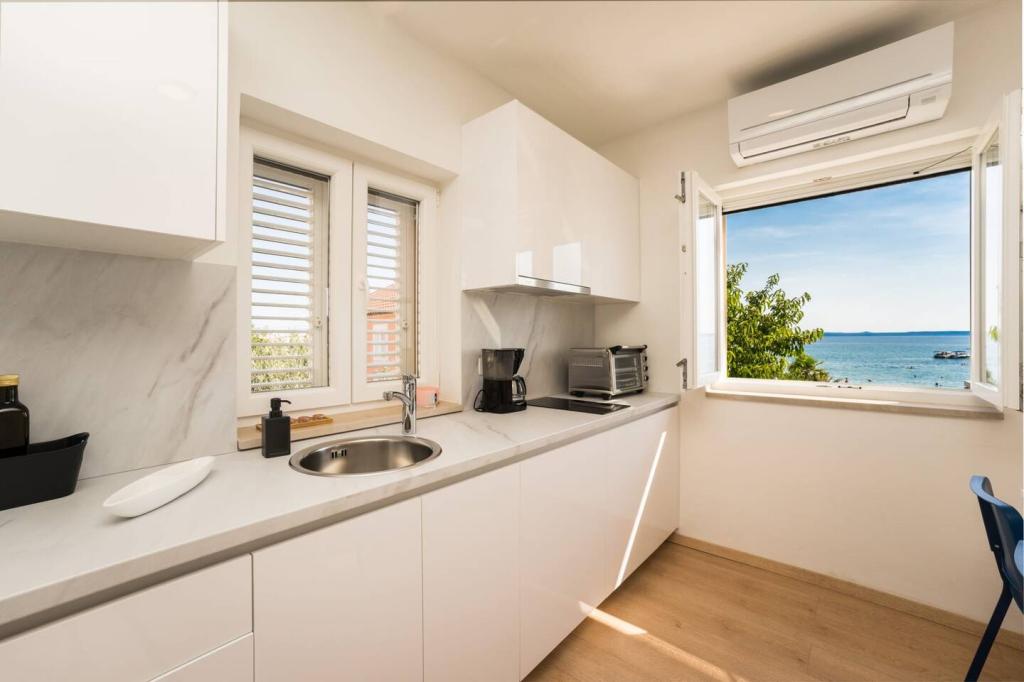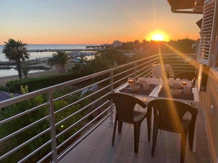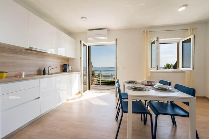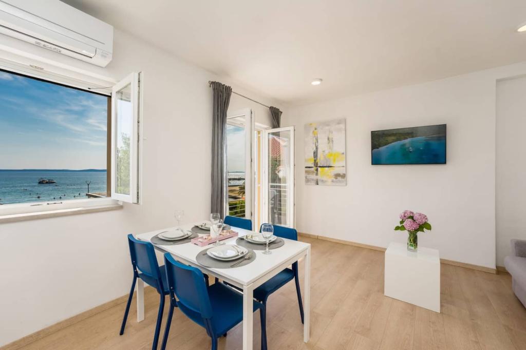 Nové a moderní apartmány v domě v bezprostřední blízkosti moře, s krásným výhledem na moře. Písečná pláž je nedaleko a můžete se koupat před domem. K dispozici je bezplatné Wi-Fi, klimatizace ve 2 pokojích a parkování je možné za nebo před domem. V blízkosti jsou obchody, kavárny a restaurace. Každý apartmán má 1 ložnici a pohovku v obývacím pokoji. Obývací pokoj je propojen s kuchyní. Má koupelnu a samostatné WC. K dispozici je pěkná terasa s mimořádným výhledem na moře a malý stůl, kde si ráno nebo večer se západem slunce můžete vychutnat snídani. Užijte si odpočinkovou dovolenou v těchto krásných apartmánech.