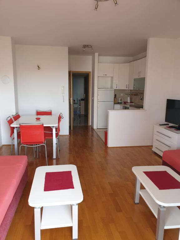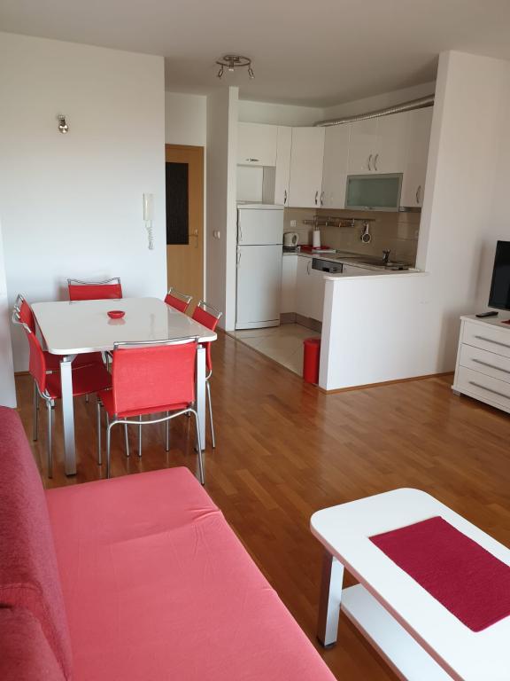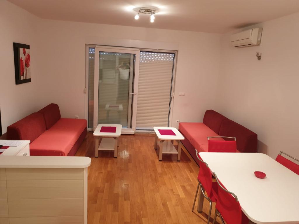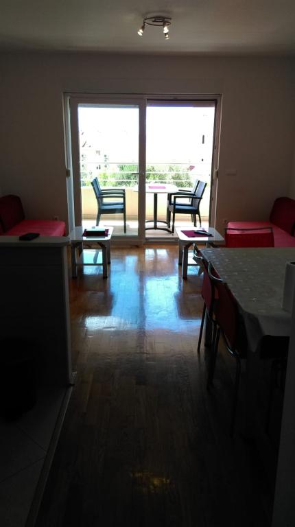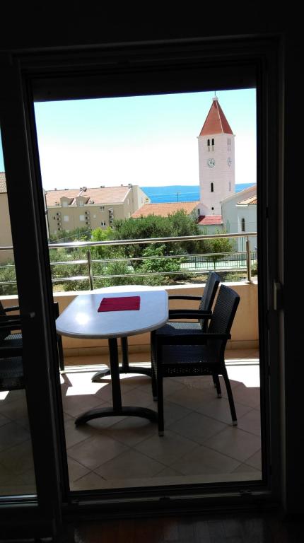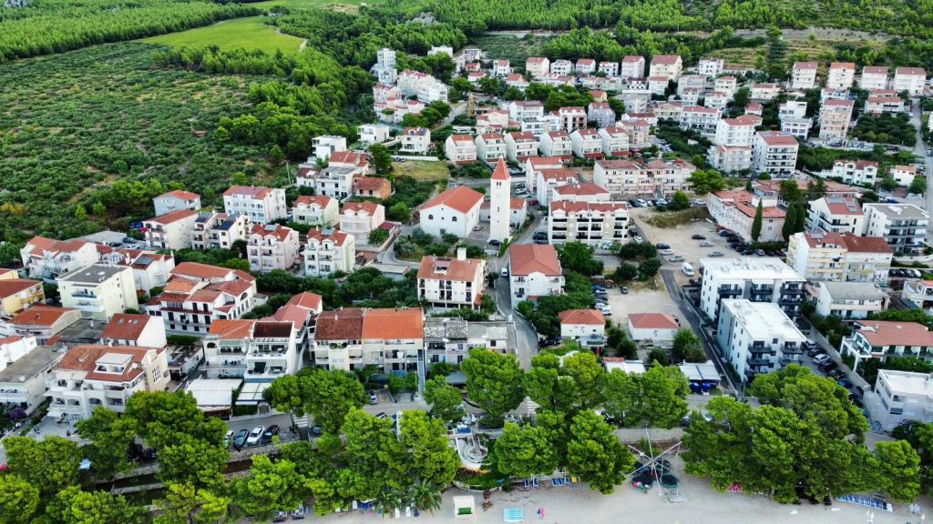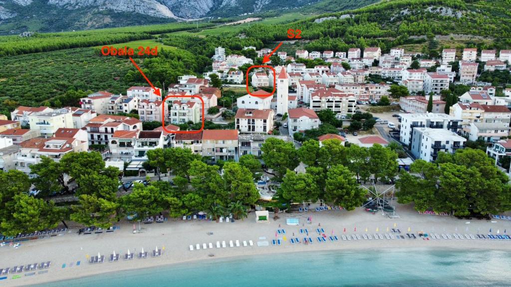 Apartmán S2 (2+2) se nachází v městečku Promajna, v centru města, těsně nad (severně) kostelem - cca 100 m od hlavní pláže, na adrese Prilaz obali 24. Parkování pro jedno auto je vedle apartmánu.