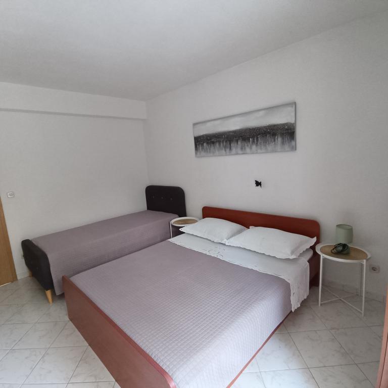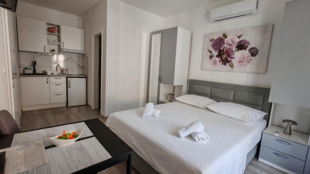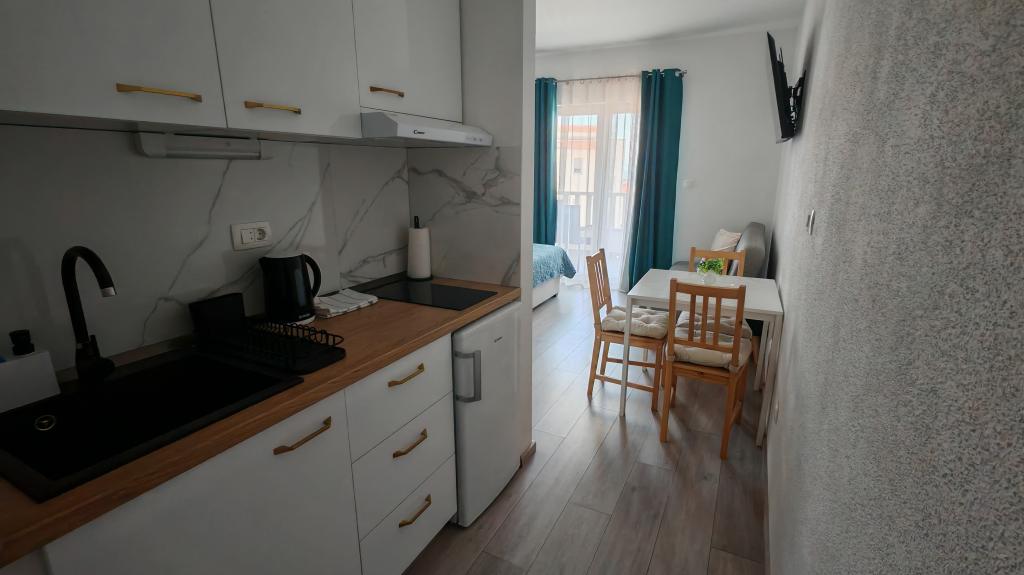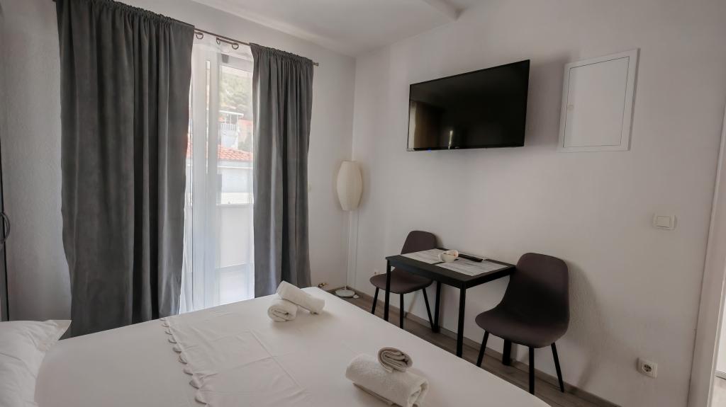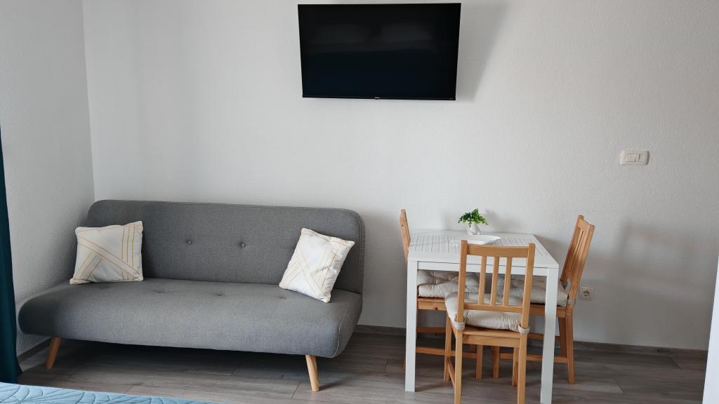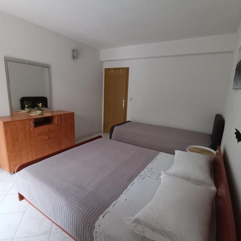 Bydleli jsme ve dvoulůžkovém pokoji s koupelnou, plně vybavenou kuchyní a balkonem s bočním výhledem jak na moře, tak na hory. Pokoj byl velmi čistý a uklizený, bez výhrad. Majitel byl k dispozici na místě, velmi komunikativní a ochotný nejen v otázkách ubytování, ale také poradil, kde se dobře a levně najíst, kde koupit nejlepší domácí olivový olej atd. Příští rok se tentokrát určitě s přáteli navštívíme.