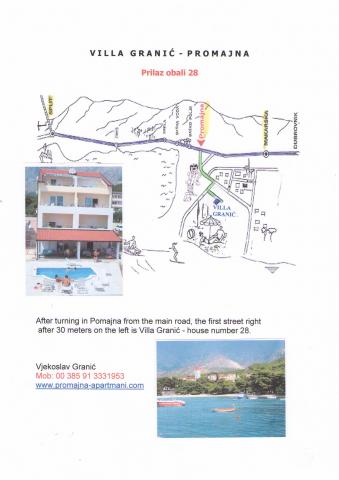 Vila Granić se nachází v turistickém městečku Promajna v krásně upraveném prostředí, pouhých 100 metrů od písečné pláže s borovicovým lesem, a je vhodná pro rodiny s dětmi. Vila má vlastní bazén, velkou zahradu a uzavřené parkoviště. Každý apartmán má velkou terasu s výhledem na moře s prostorným stolem a židlemi. V blízkosti se nachází 6 restaurací, obchody a dětská hřiště. Vedle domu se nachází sportovní hřiště na basketbal a mini fotbal, které je možné využívat zdarma.