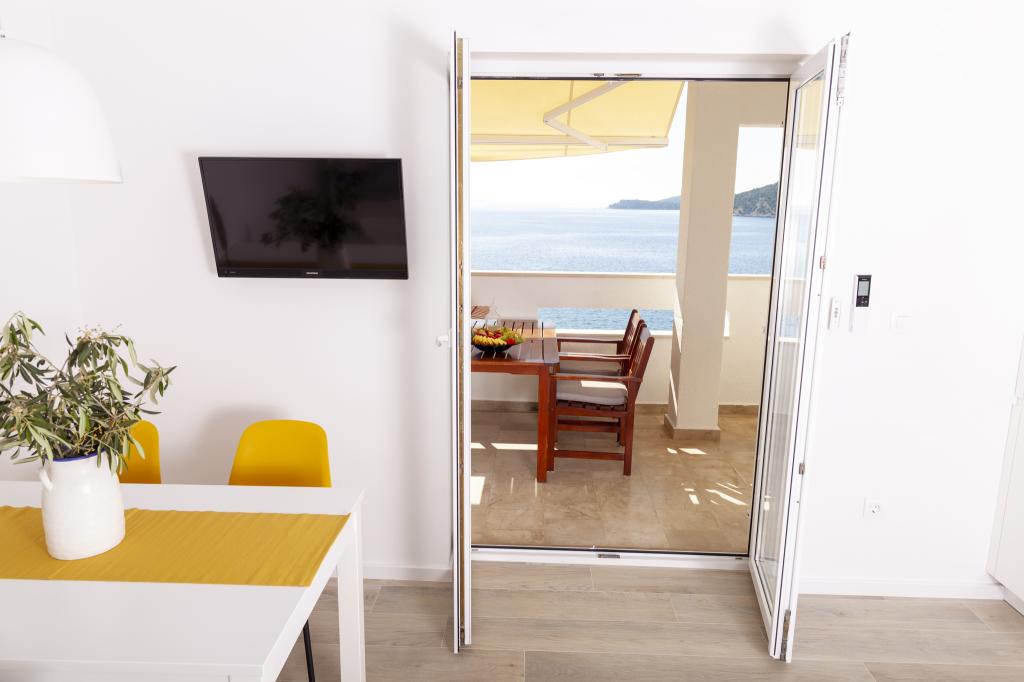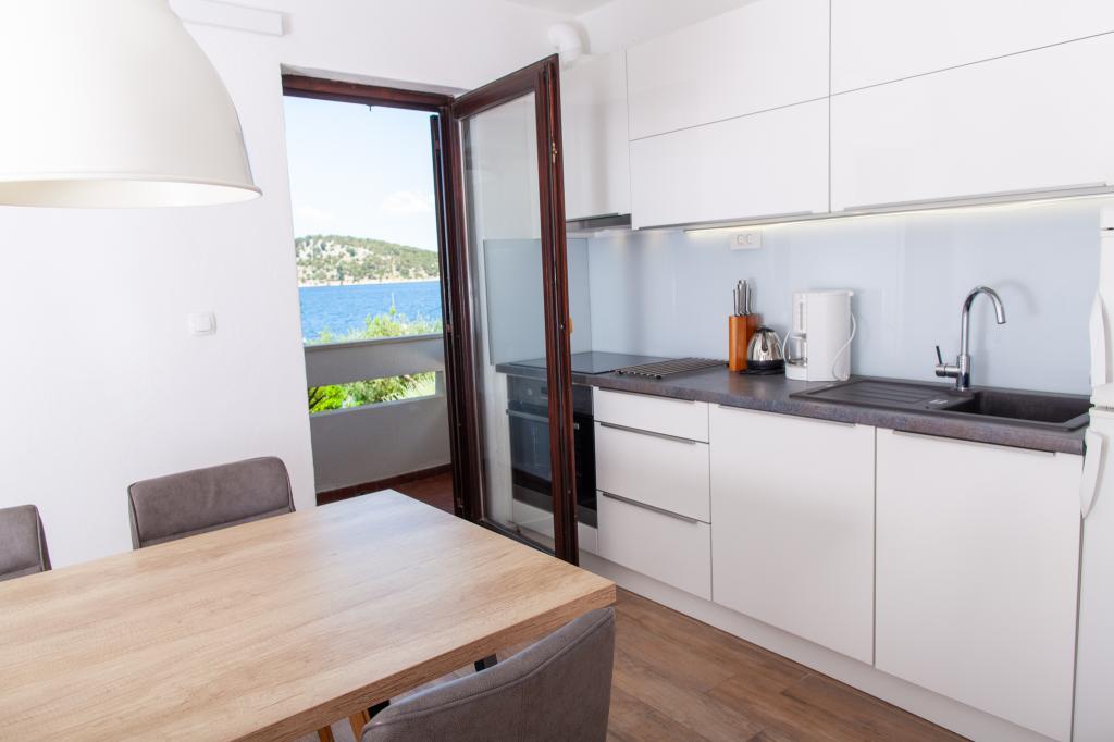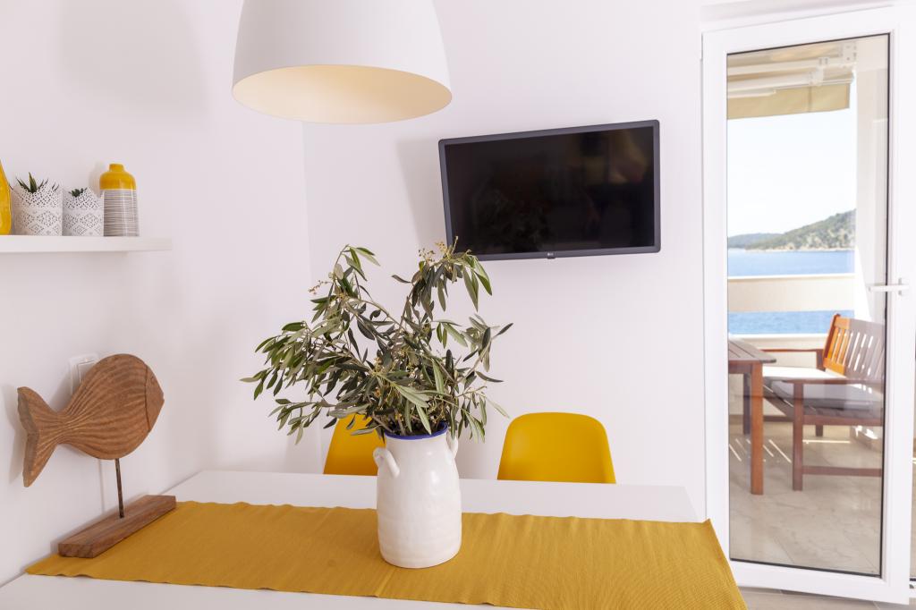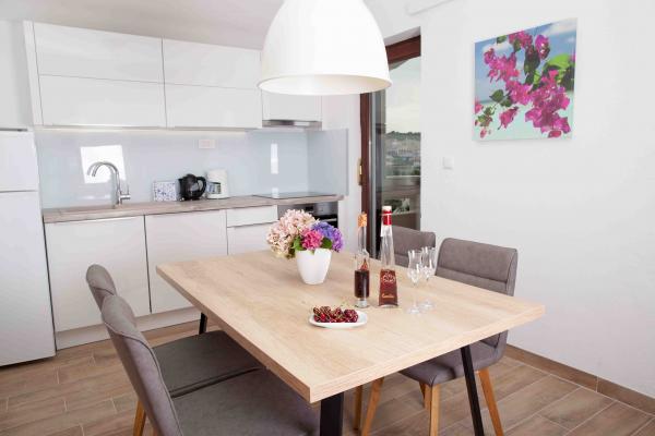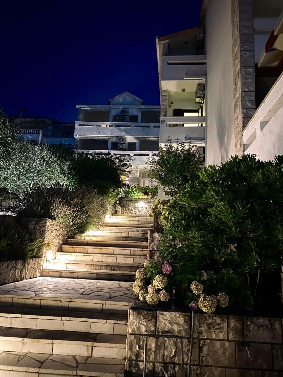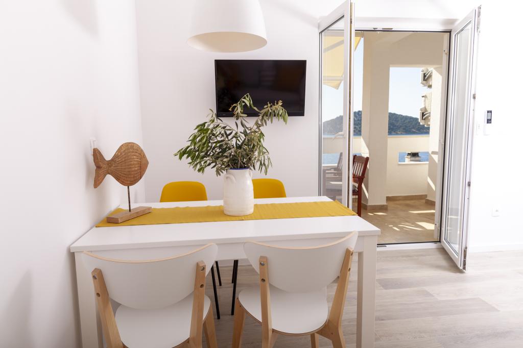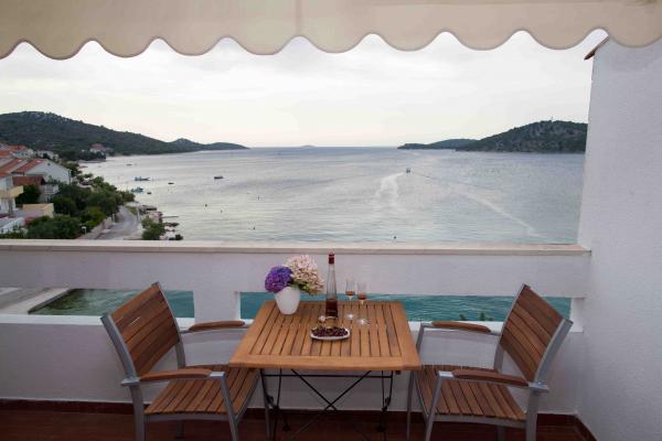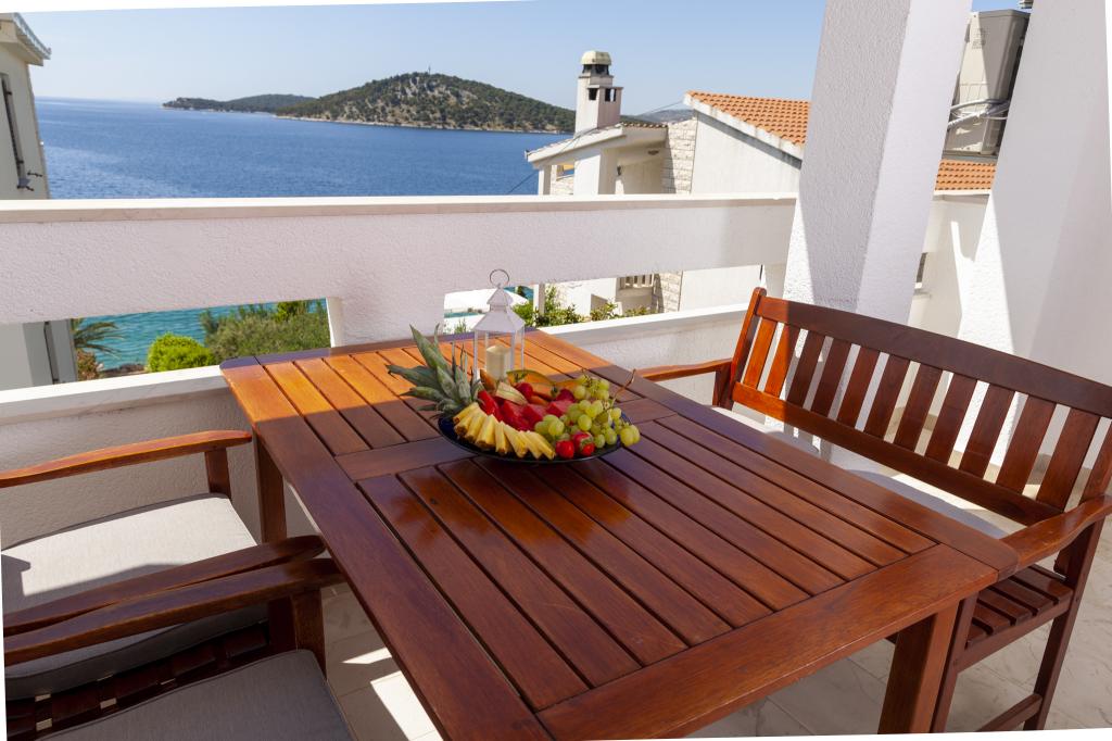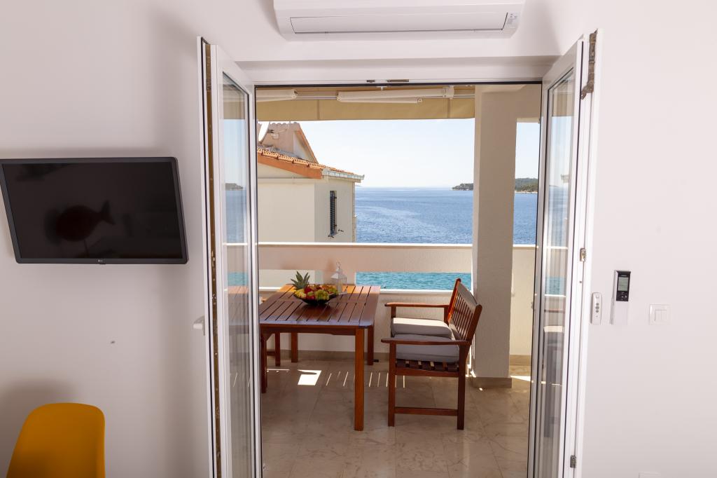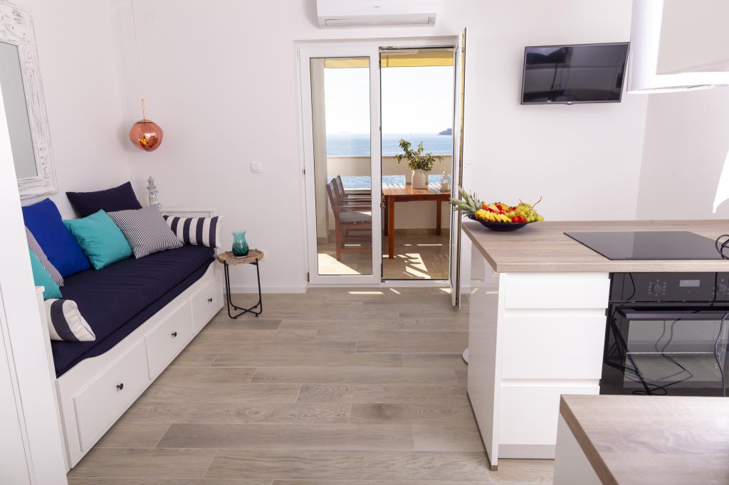 Apartmany se nachazeji v první řadě od moře cize doslova projdete po schodech a jste na plazi. Hned při apartmanu je obchod nad nim restaurace. Apartman se nachazi v klidne oblasti takze ma plazi se vzdy najde místo. Je zde i strk pro děti. Domaci lidé jsou velmi přátelsky. I proto sem chodíme každý rok po dobu 15 let.
