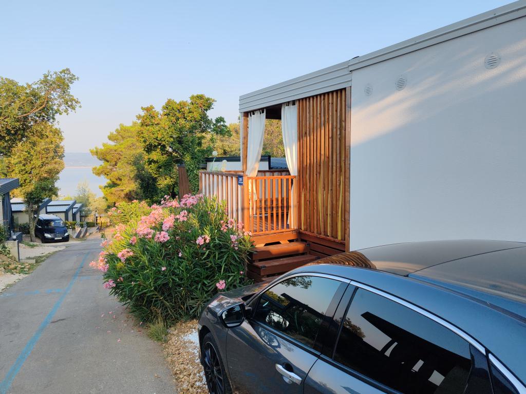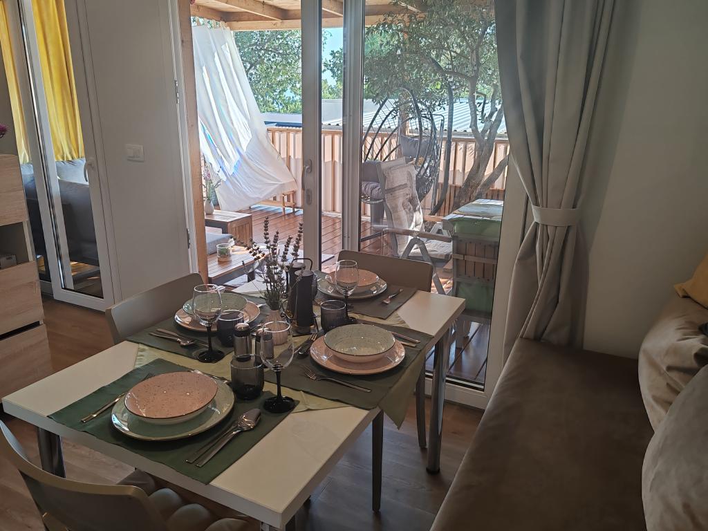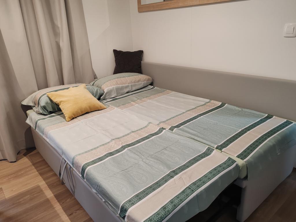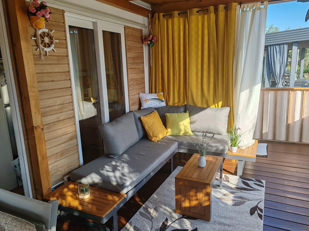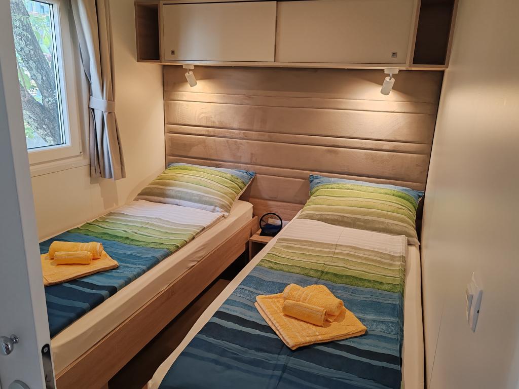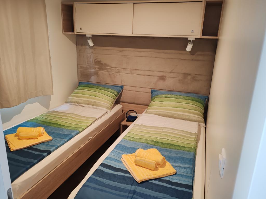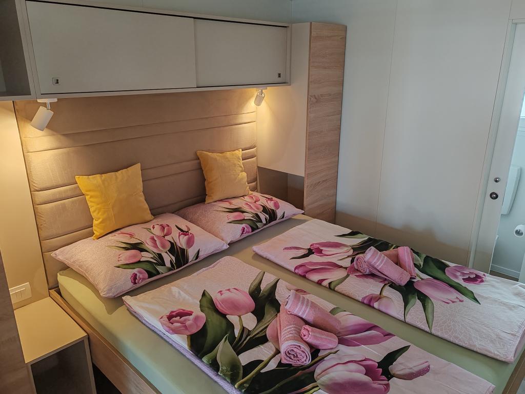 Plně vybavený a moderní mobilní dům na výborném místě ve známém a vybaveném kempu, který nabízí spoustu vybavení, zejména pro rodiny s dětmi. Dům má rozlohu 32 m2 a skládá se ze 2 ložnic, obývacího pokoje a plně vybavené kuchyně se vším potřebným, myčkou nádobí, mikrovlnnou troubou, toustovačem, kávovarem Dolce Gusto a varnou konvicí. K dispozici jsou také dvě toalety se sprchami. Jeden pokoj má manželskou postel 160 × 200 cm a vlastní koupelnu. Druhý pokoj má 2 samostatné postele 80 × 200 cm. V obývacím pokoji je rozkládací pohovka, kterou lze rozložit pro dvě osoby. Terasa má rozlohu 29 m2, na které se nachází vyhřívaná masážní vířivka a posezení. Nemovitost je plně vybavena vším potřebným (od ložního prádla, ručníků, toaletních potřeb atd.). K dispozici je venkovní plynový gril. Bazénový komplex je vzdálený pouhých 100 m a pláž cca 250 m. Centrum Selc je vzdálené pouhých 13 minut chůze. Bezplatné soukromé parkování a internet s chytrou TV (Netflix, YouTube atd.)