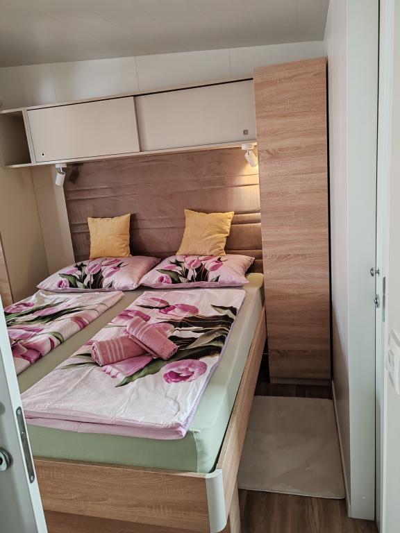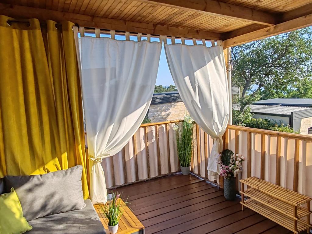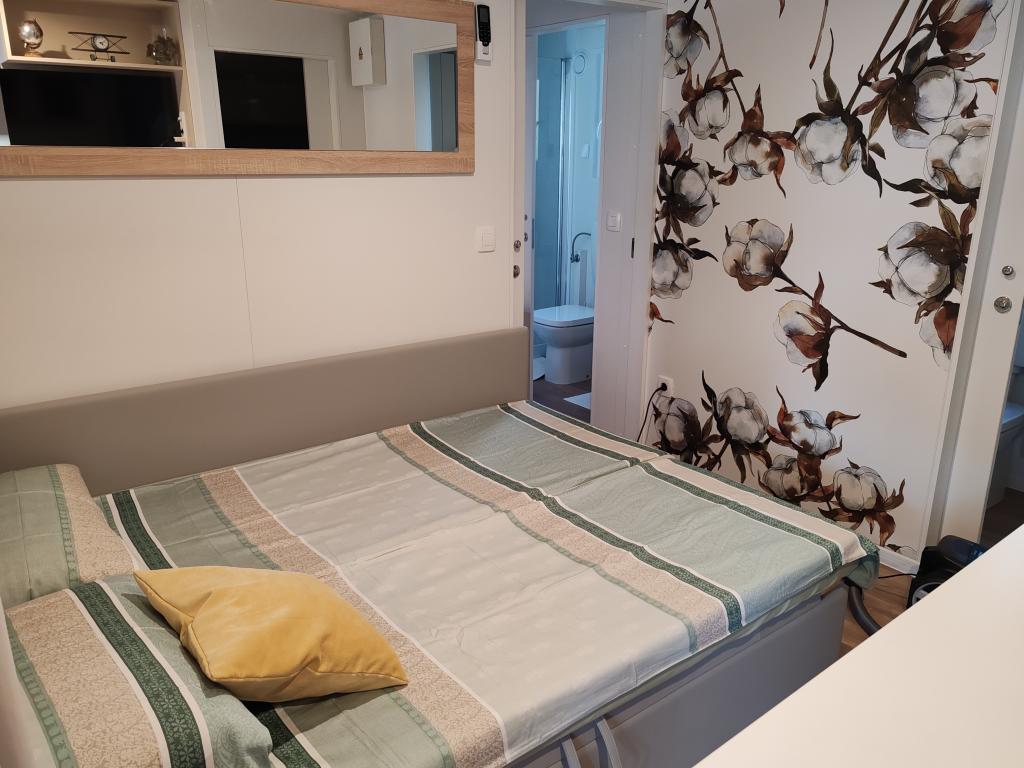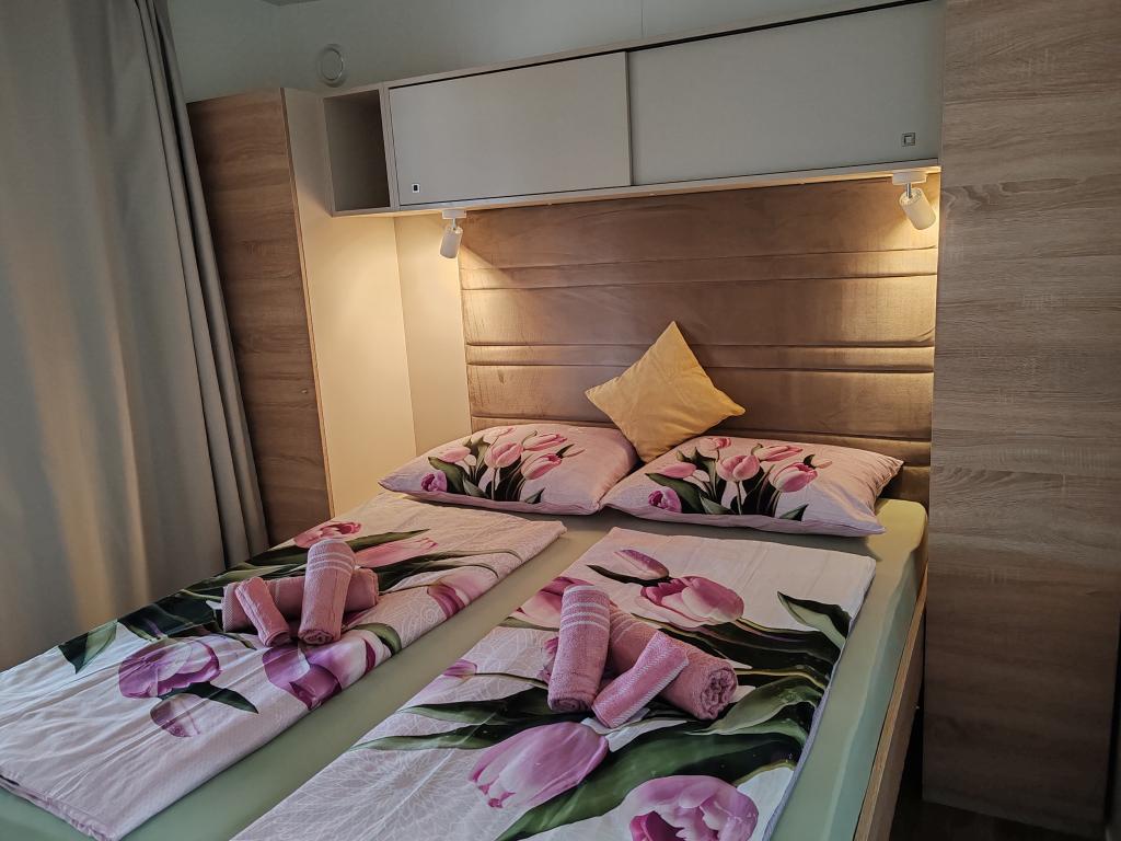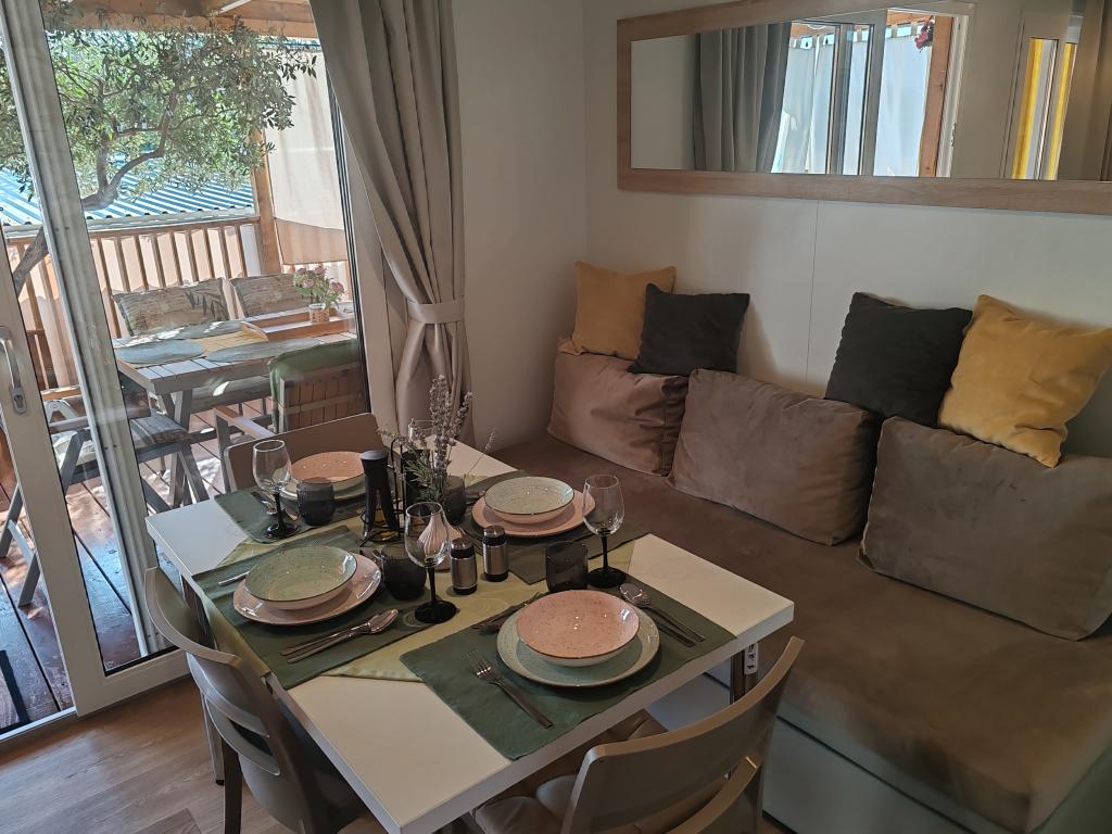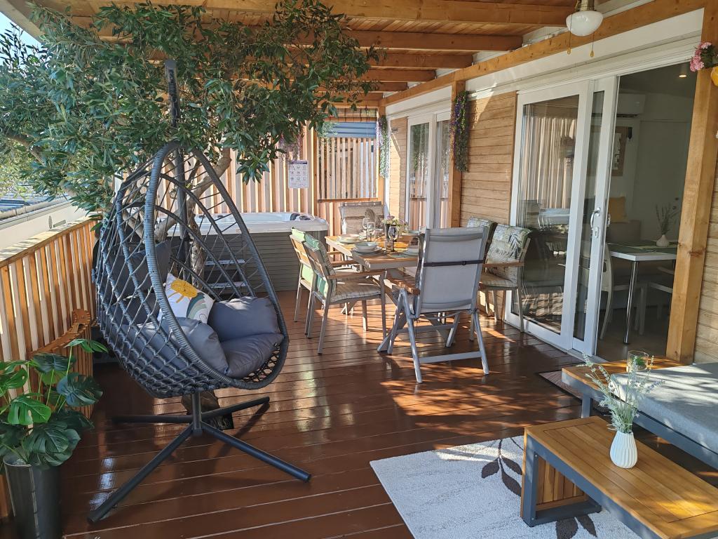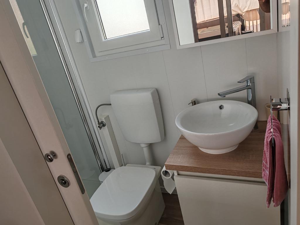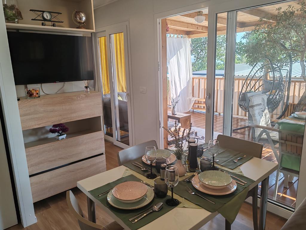 Plně vybavený a moderní mobilní dům na výborném místě ve známém a vybaveném kempu, který nabízí spoustu vybavení, zejména pro rodiny s dětmi. Dům má rozlohu 32 m2 a skládá se ze 2 ložnic, obývacího pokoje a plně vybavené kuchyně se vším potřebným, myčkou nádobí, mikrovlnnou troubou, toustovačem, kávovarem Dolce Gusto a varnou konvicí. K dispozici jsou také dvě toalety se sprchami. Jeden pokoj má manželskou postel 160 × 200 cm a vlastní koupelnu. Druhý pokoj má 2 samostatné postele 80 × 200 cm. V obývacím pokoji je rozkládací pohovka, kterou lze rozložit pro dvě osoby. Terasa má rozlohu 29 m2, na které se nachází vyhřívaná masážní vířivka a posezení. Nemovitost je plně vybavena vším potřebným (od ložního prádla, ručníků, toaletních potřeb atd.). K dispozici je venkovní plynový gril. Bazénový komplex je vzdálený pouhých 100 m a pláž cca 250 m. Centrum Selc je vzdálené pouhých 13 minut chůze. Bezplatné soukromé parkování a internet s chytrou TV (Netflix, YouTube atd.)