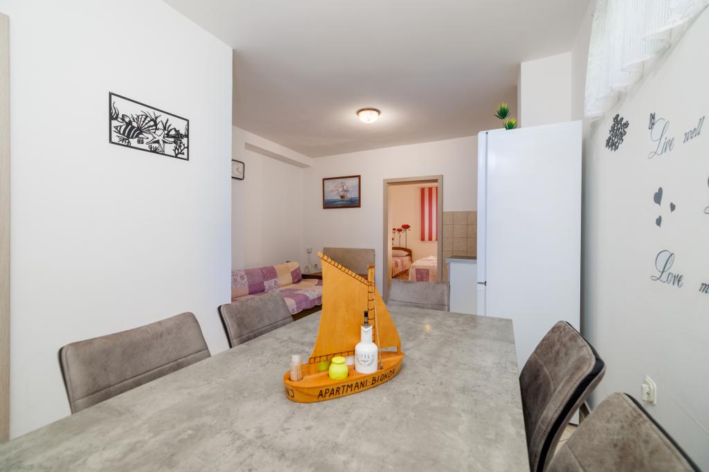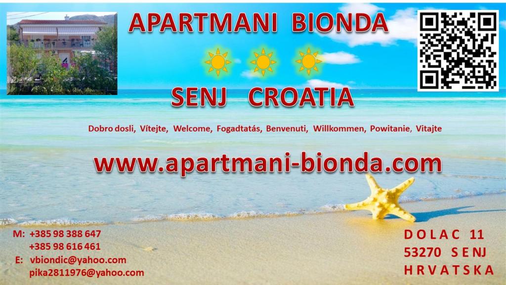 Apartmány BIONDA jsou nově postavené, plně a moderně vybavené v klidné části města Senj. Nacházejí se v samostatné budově, tj. v rodinném domě. Každý apartmán má samostatný vchod, vlastní balkon nebo terasu, k dispozici je stůl a židle na balkon, SAT-TV, bezdrátový internet, WI-FI, minibar, klimatizace, elektrické topné panely a parkování pro vaše auto je zajištěno. V bezprostřední blízkosti města Senj se nachází Národní park Plitvická jezera, přírodní parky Velebit, Zavratnica, ostrovy Goli, Grgur, Prvić, Krk a Rab. Apartmány se pronajímají celoročně.