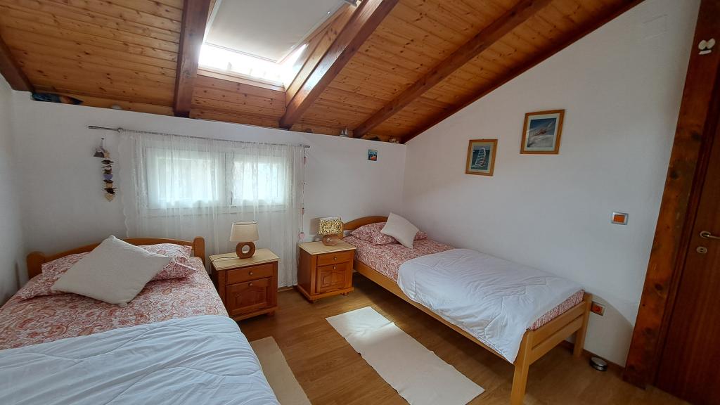 Prostorný apartmán se dvěma ložnicemi v 1. patře s velkým obývacím pokojem a balkonem s výhledem na moře (10 m) a celý záliv. Nachází se v samém centru města, které je oázou klidu a rodinné relaxace. V blízkosti se nachází restaurace, kavárna a obchod. Pro příjemný pobyt je k dispozici klimatizace, wifi a satelitní TV. Před apartmánem se nachází betonová pláž s křišťálově čistým mořem, slunečníky a lehátky a oblázková pláž je vzdálená 150 m.