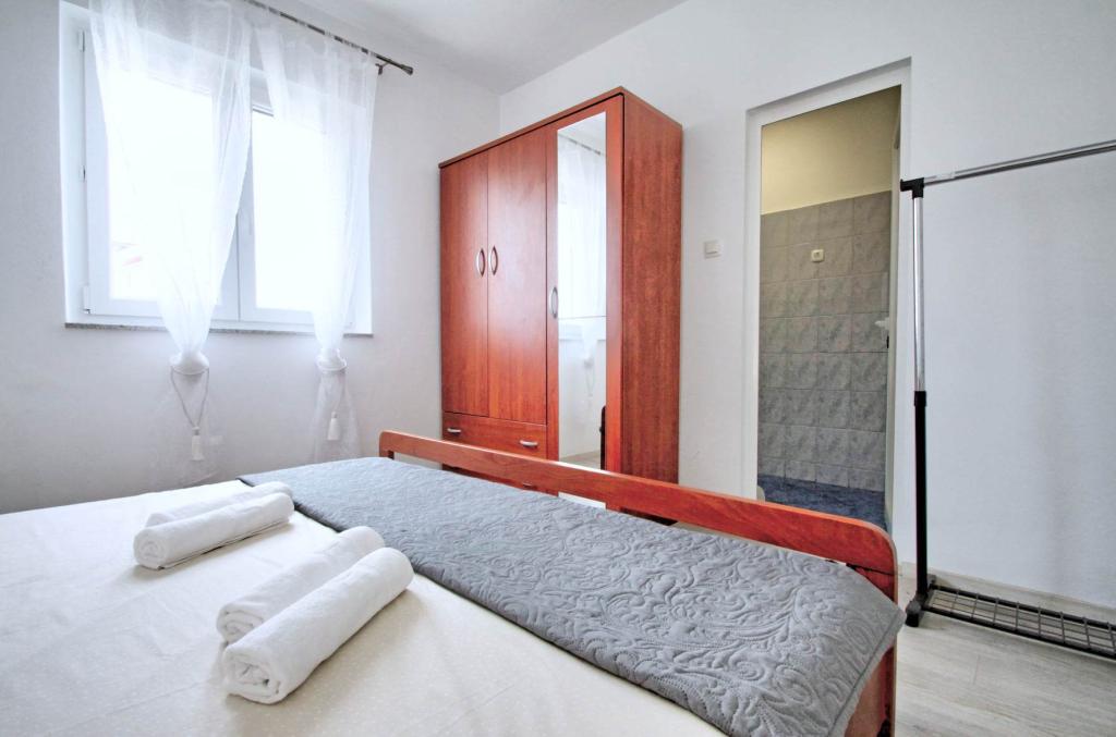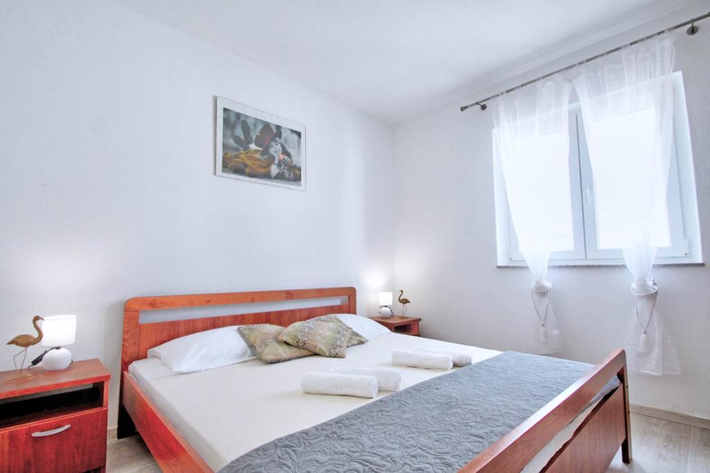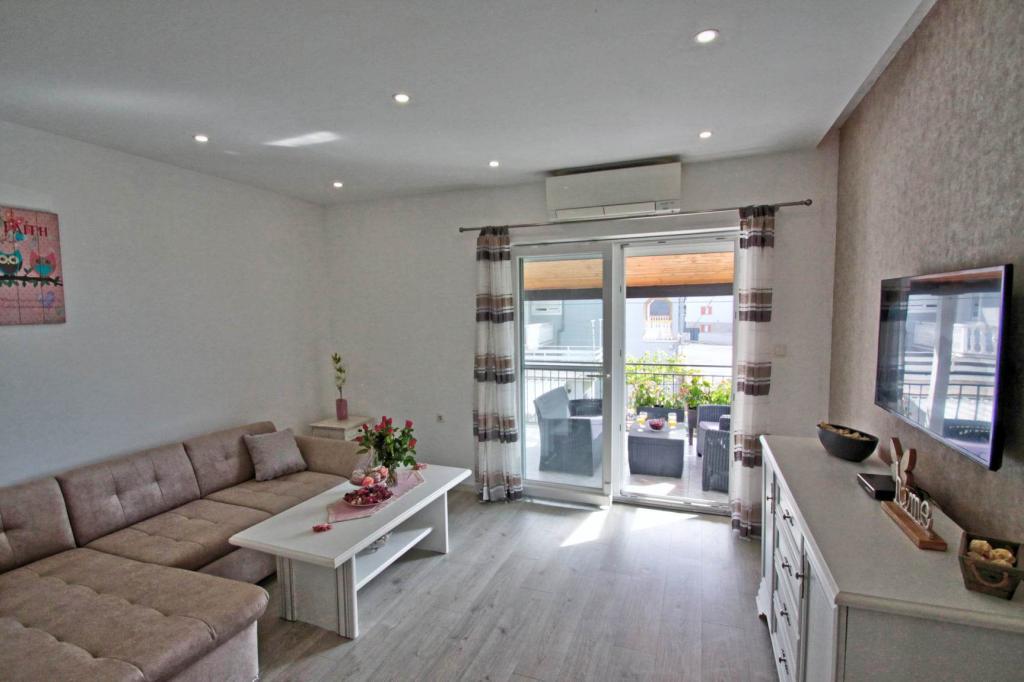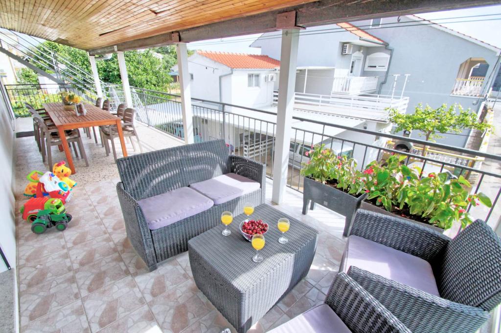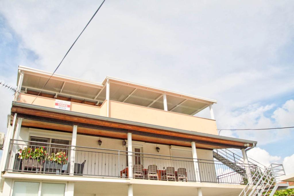 Plně vybavený apartmán v 1. patře pro 6+2 osoby. Samostatný vchod. Velká, samostatná a krytá terasa s přímým výhledem na moře. Byt má 3 ložnice, 2 toalety, z toho jedna je propojená s ložnicí. Pláž je 40 m od apartmánu, má přírodní stín a písečné hřiště na volejbal. Centrum je vzdáleno 300 m a vše ostatní do 100 m.