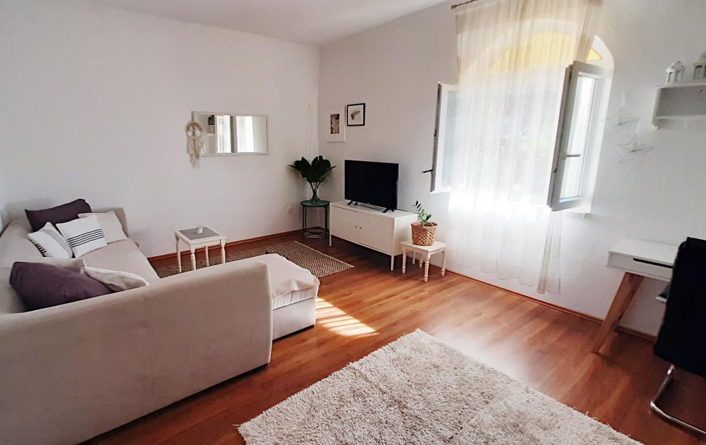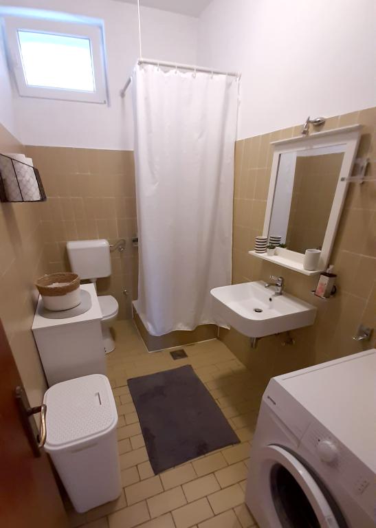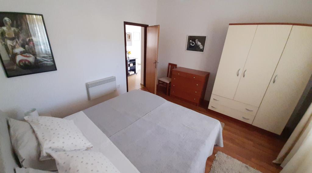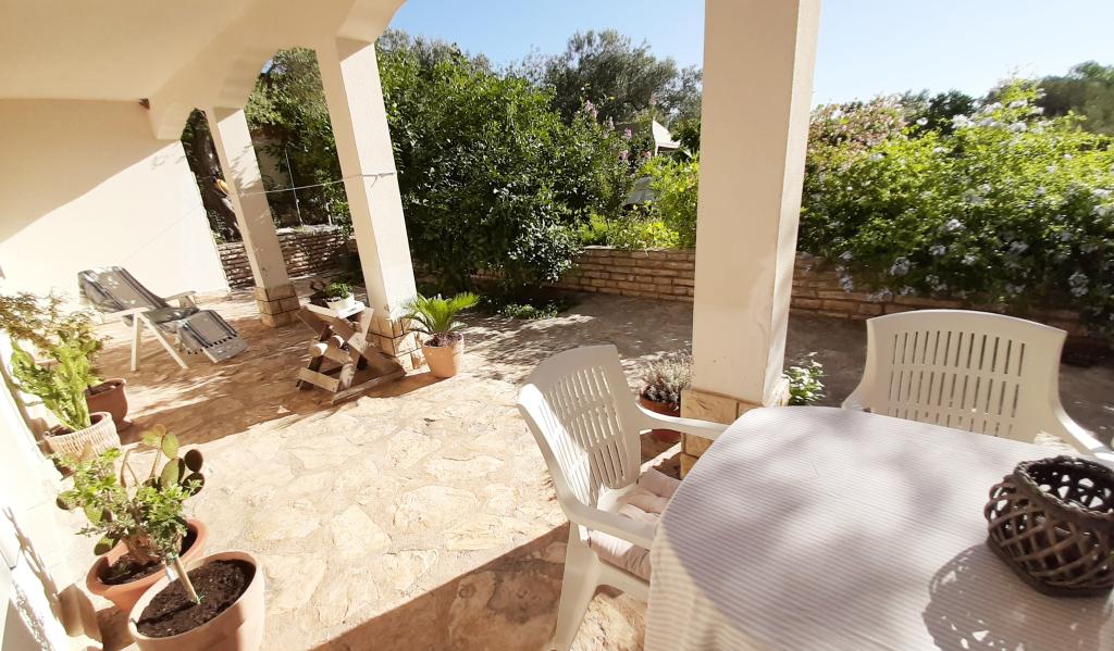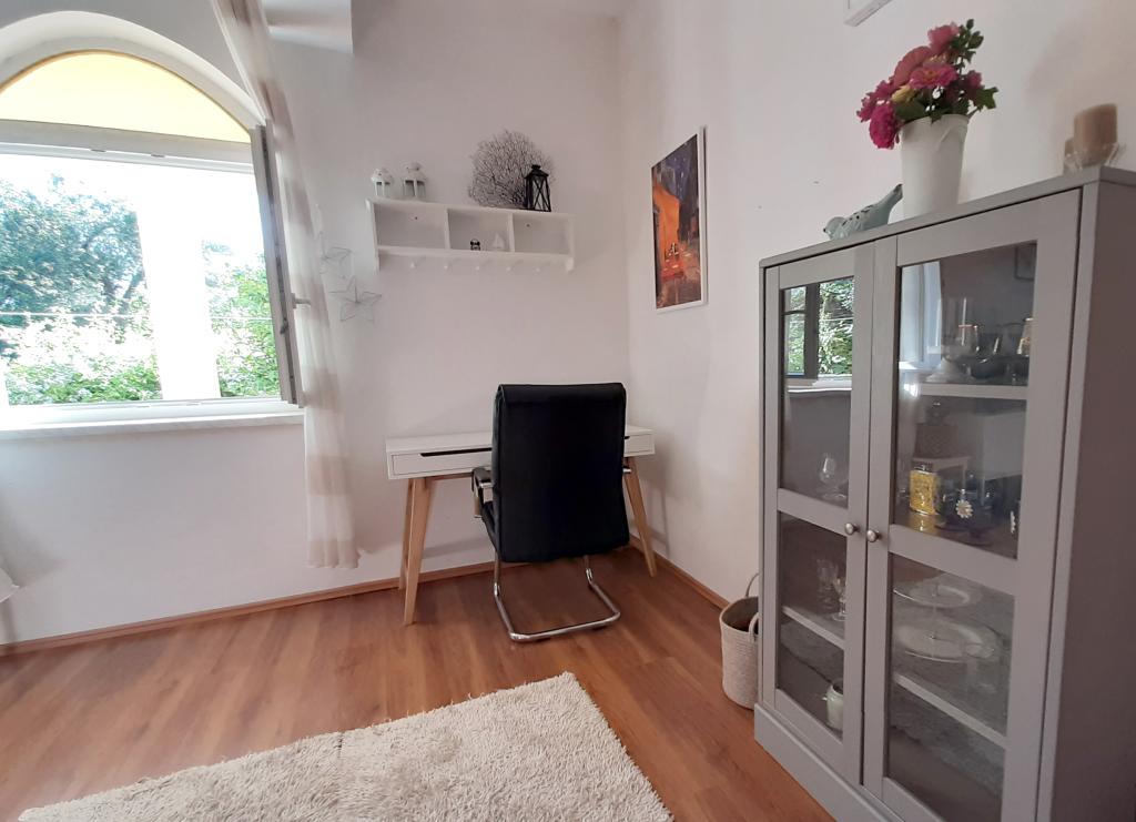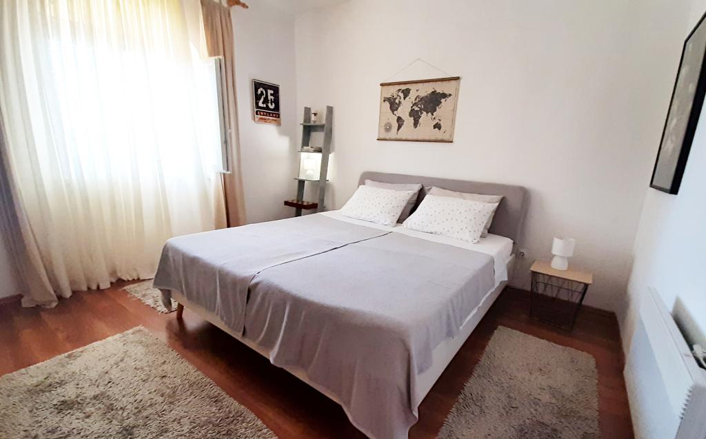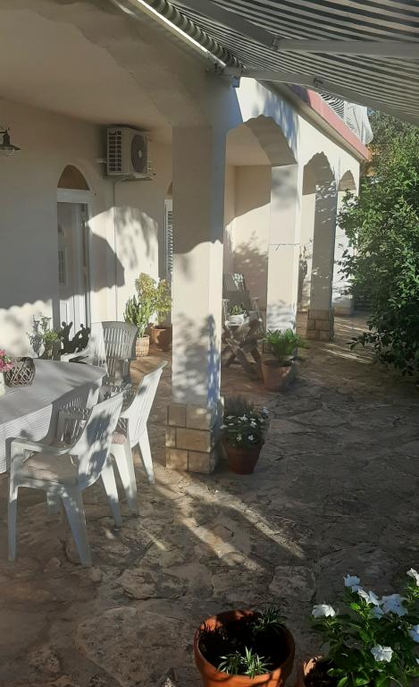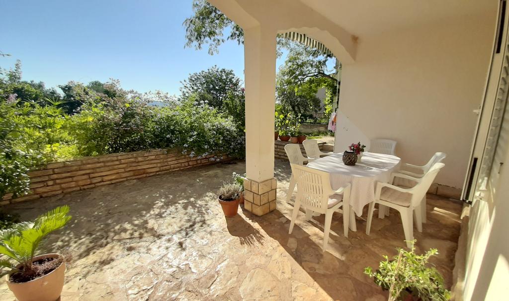 Byt se nachází v přízemí rodinného domu, který je v první řadě k moři, pouhých 100 m od pláže. Má 2 ložnice s manželskou postelí, koupelnu, prostorný obývací pokoj a dobře vybavenou kuchyň. Byt má 100m2. K dispozici je také velká a příjemná terasa s posezením a venkovní sprchou s krásným výhledem do zahrady a olivového háje. Byt je klimatizovaný, má zajištěné parkovací místo pro 1-2 auta, wi-fi a má možnost využití grilu. Pobytová taxa a klimatizace jsou zahrnuty v ceně.