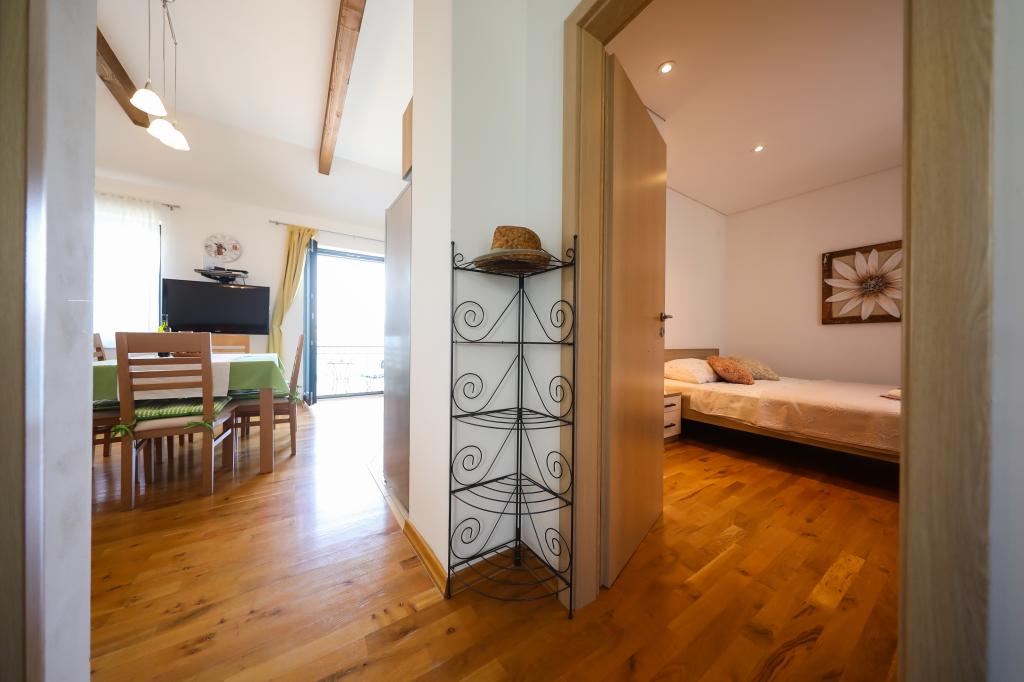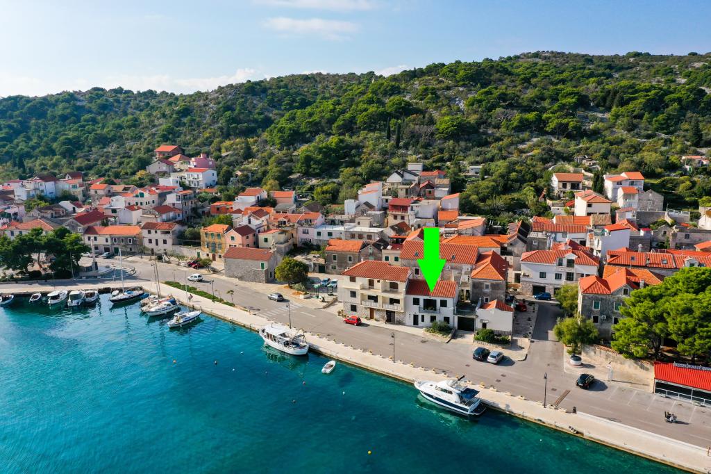 Apartmán se nachází v první řadě u moře ve starém městě Tisno. Je kompletně nově zařízený a vybavený s krásným výhledem na moře, vesnici a blízké ostrovy a pobřeží. Apartmán má dva balkony, jeden s výhledem na moře a jeden v zadní části domu. Nachází se v 1. patře budovy a nabízí vynikající podmínky a atmosféru pro velmi příjemnou dovolenou. V přízemí domu se nachází malá, uzavřená zahrada s grilem, která je hostům k dispozici. Před domem je jedno parkovací místo zdarma a kotviště pro lodě. Apartmán je moderně zařízený, vybavený kuchyní s troubou, sporákem, lednicí, myčkou nádobí, kávovarem a varnou konvicí. Koupelna je vybavena sprchovým koutem, pračkou a fénem. Apartmán má žehličku, satelitní TV, WiFi, rádio a každý pokoj má vlastní klimatizaci.