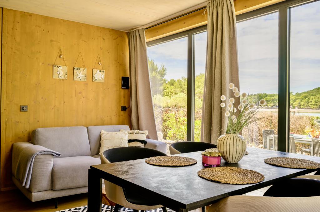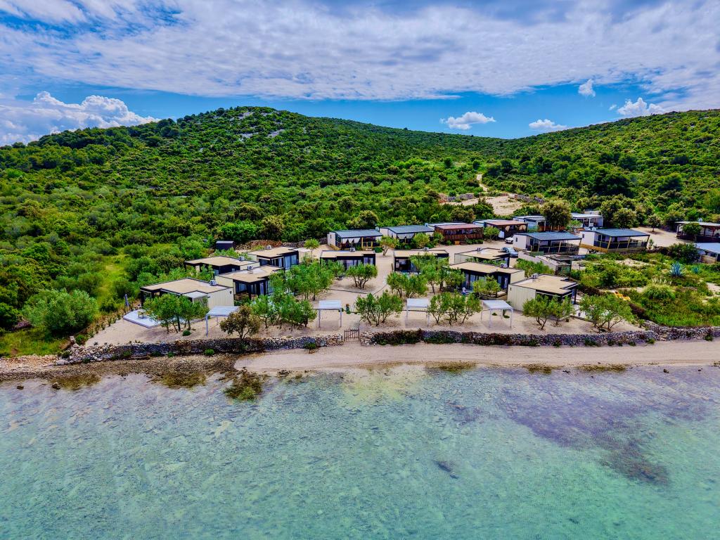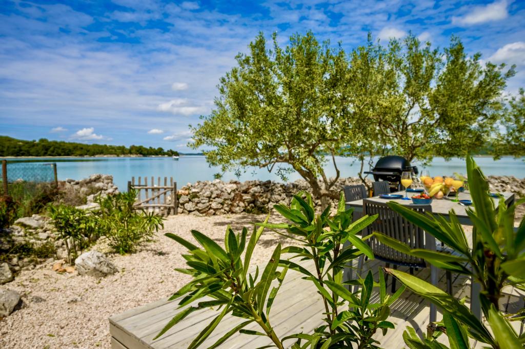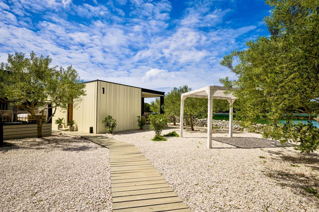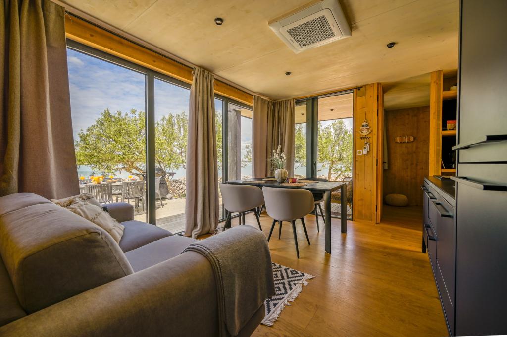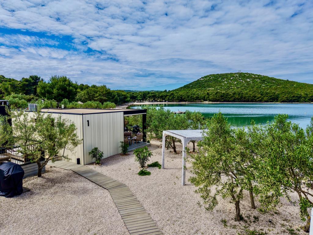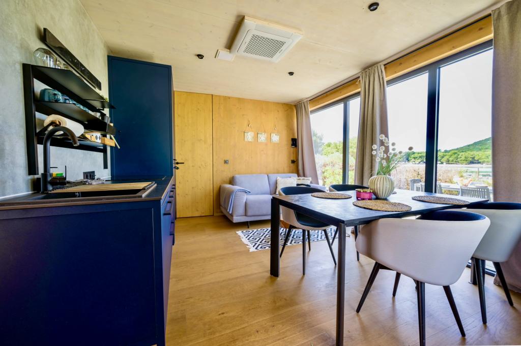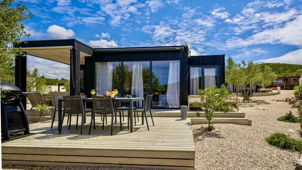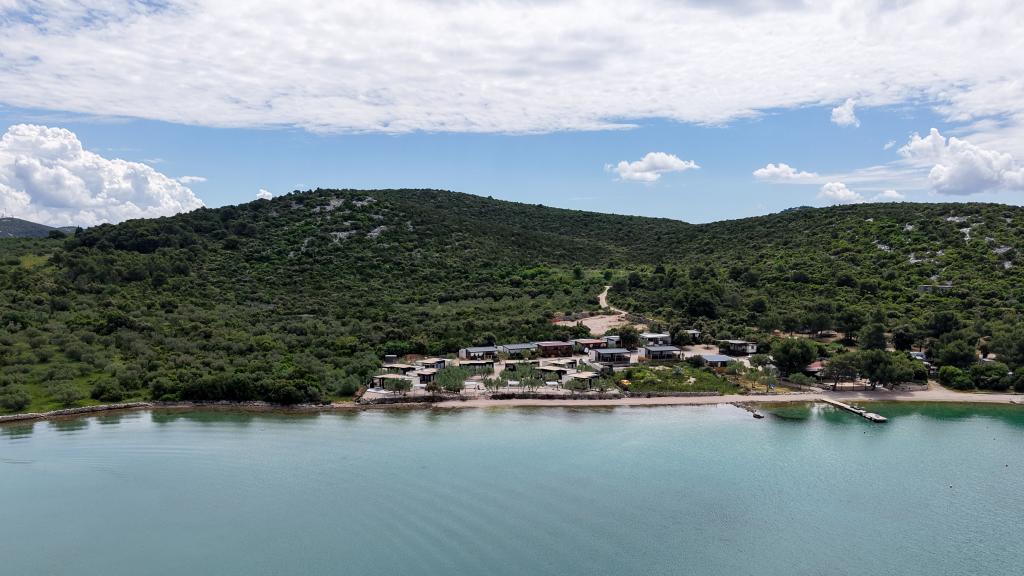 Mobilní dům je jen pár kroků od moře. Moderní interiér apartmánu se snoubí s typickou Dalmáciou. Obklopen bílými oblázky a zelenými olivovníky a před ním je jen nekonečná modř. Moře, slunce a vítr vytvářejí nepopsatelnou hru, která potěší všechny smysly. Ať už spíte v jedné ze dvou ložnic, můžete si ráno užívat modř moře a záři slunce. A z plně vybavené kuchyně se vším potřebným (včetně myčky nádobí a mrazáku) a prostorného jídelního stolu se nabízí nepopsatelný výhled na terasu a všechna kouzla, která slunce a moře nabízí. Ať už si připravujete jídlo v kuchyni nebo grilujete na terase, máte zaručen naprostý klid a soukromí. Cílem každé dovolené je nechat za sebou všední den a rutinu, a přesně to naše zařízení nabízí. Přestože je obklopen 8 podobnými budovami, budete si užívat naprosté soukromí a klid, protože se o vás všichni postarají. Jediným limitem před vámi je nebe a moře.