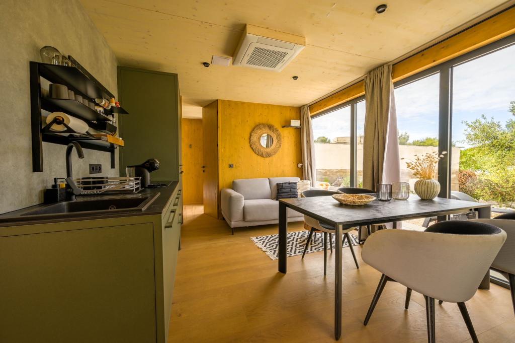 Mobilní dům je jen pár kroků od moře. Moderní interiér apartmánu se snoubí s typickou Dalmáciou. Obklopeni bílými oblázky a zelenými olivovníky a před vámi je jen nekonečná modř. Moře, slunce a vítr vytvářejí nepopsatelnou hru, která potěší všechny smysly. Ať už spíte v jedné ze dvou ložnic, můžete si ráno užívat modř moře a záři slunce. A z plně vybavené kuchyně se vším potřebným (včetně myčky nádobí a mrazáku) a prostorného jídelního stolu se nabízí nepopsatelný výhled na terasu a všechna kouzla, která slunce a moře nabízí. Ať už si připravujete jídlo v kuchyni nebo grilujete na terase, máte zaručen naprostý klid a soukromí. Cílem každé dovolené je nechat za sebou všední den a rutinu, a přesně to naše zařízení nabízí. Přestože je obklopen 8 podobnými budovami, budete si užívat naprosté soukromí a klid, protože se o vás všichni postarají. Jediným limitem před vámi je nebe a moře.