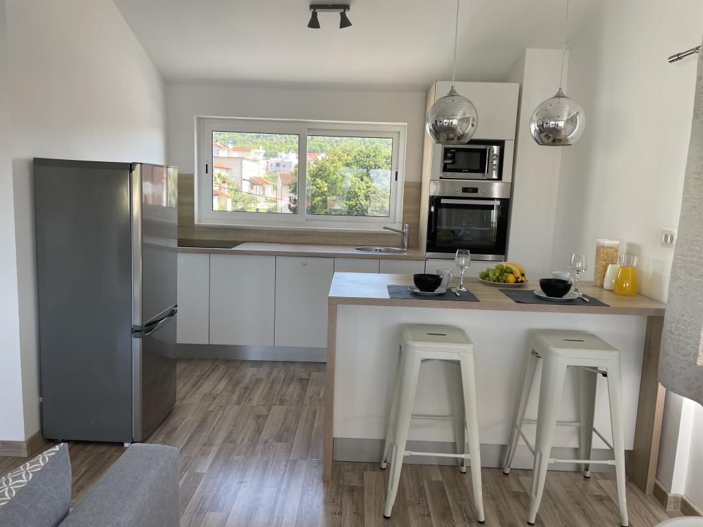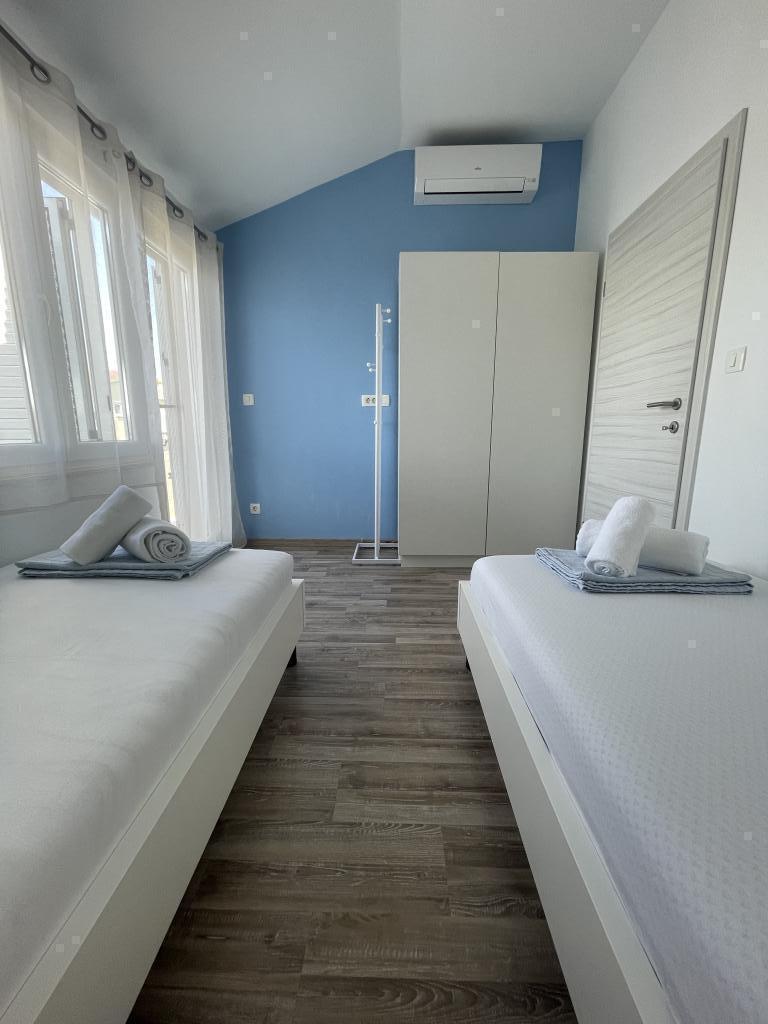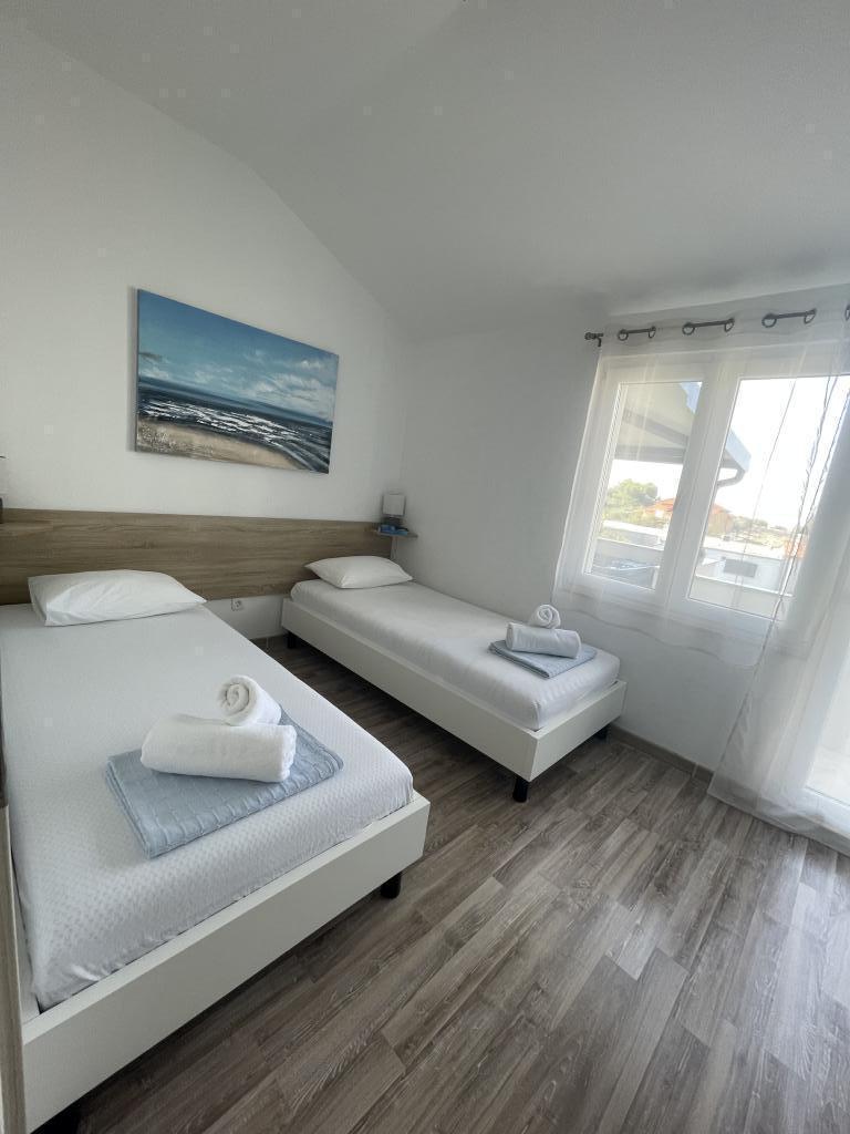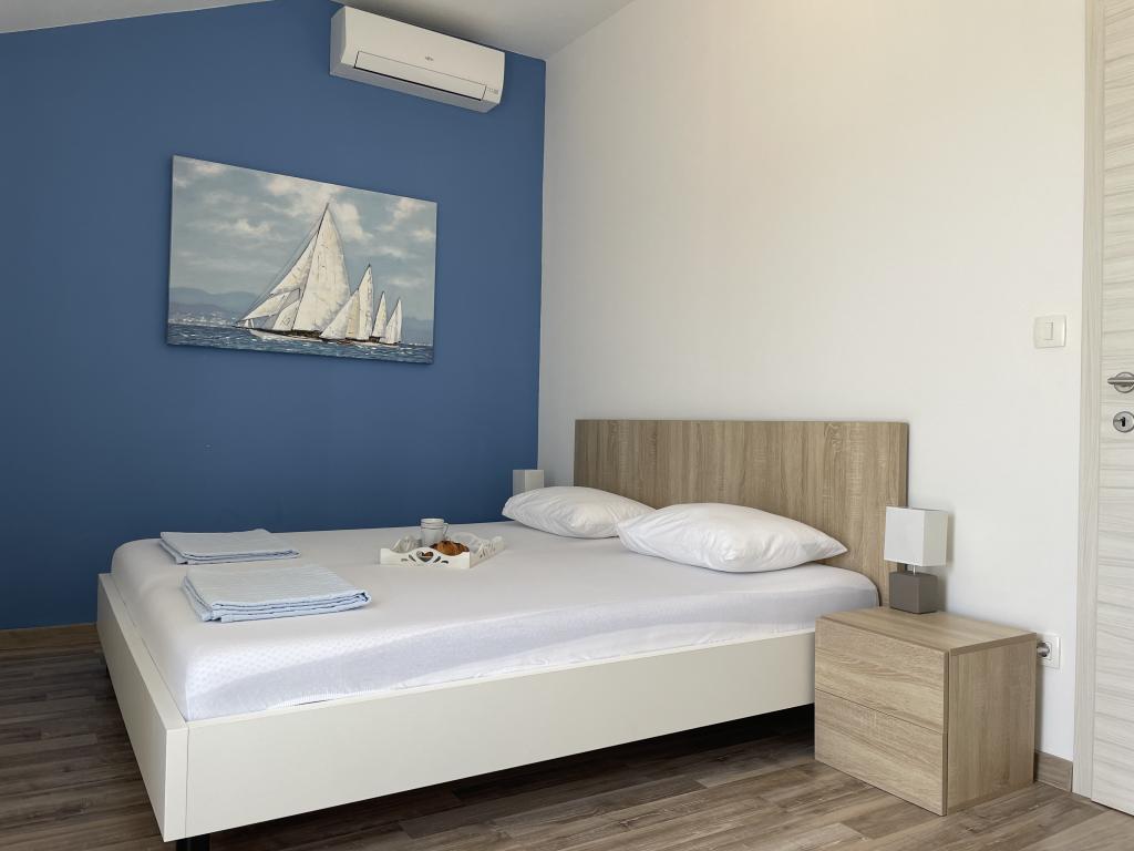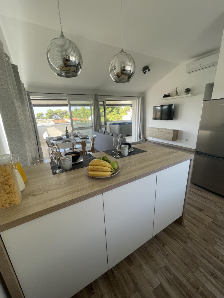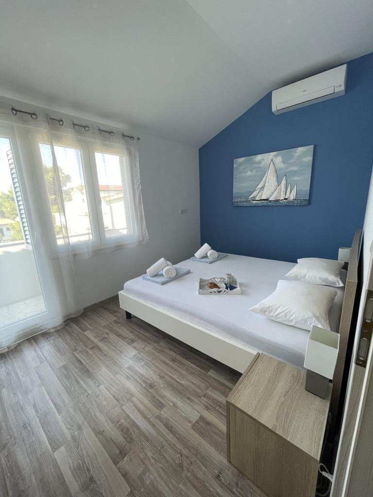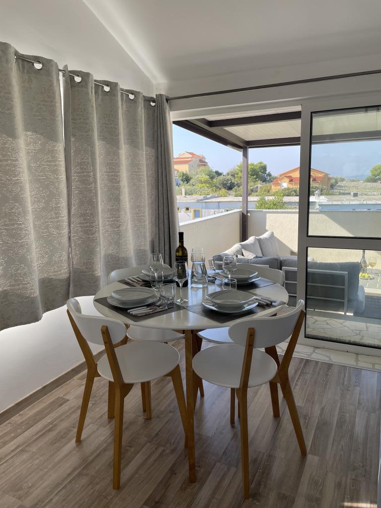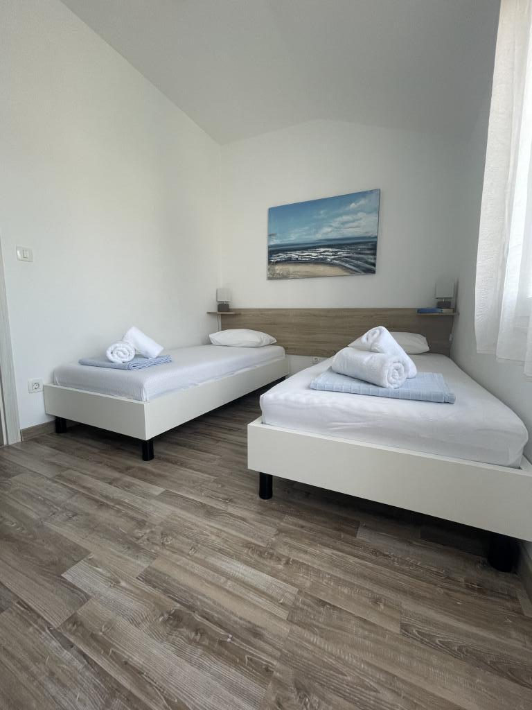 Plně a moderně vybavené apartmány v klidné oblasti, pouhých 300 m od pláže s mnoha vymoženostmi. Apartmány se nacházejí ve druhém patře rodinného domu, v oploceném dvoře si můžete užít krytou zónu pro posezení s letní kuchyní a grilem. Soukromé parkoviště se nachází před domem. 50 m od domu se nachází autobusová zastávka a 200 m od domu je první obchod. Centrum města je vzdálené 800 m, dostanete se tam po silnici nebo po promenádě, která se táhne podél moře. Milujeme zvířata, ale nejsme přátelští k domácím mazlíčkům.