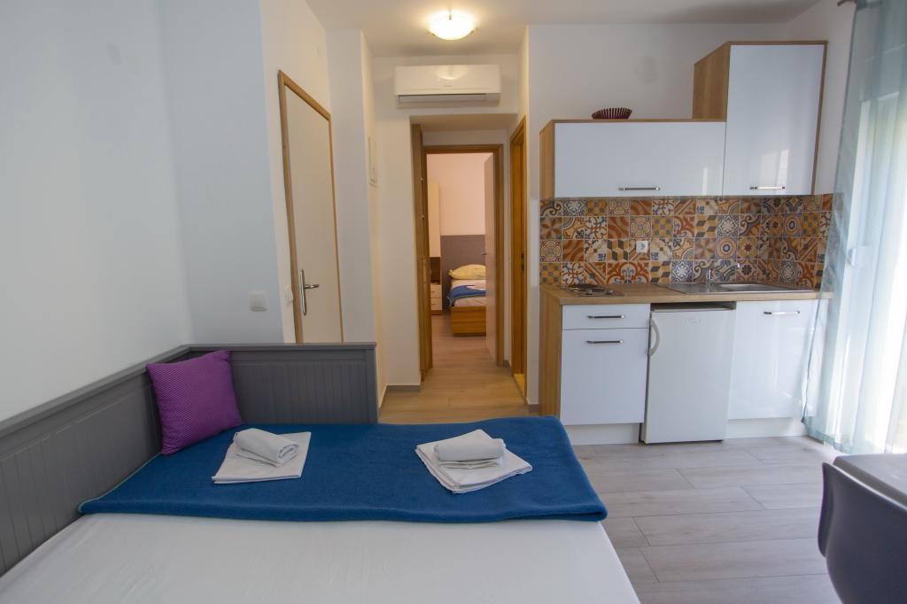 Plně vybavené apartmány. Dům se nachází u místní komunikace. Z budovy na pláž 3 minuty pěšky a 10 minut do centra. Restaurace a obchody v okolí 3-10 minut. Parkování je ve dvoře před domem 20 metrů.