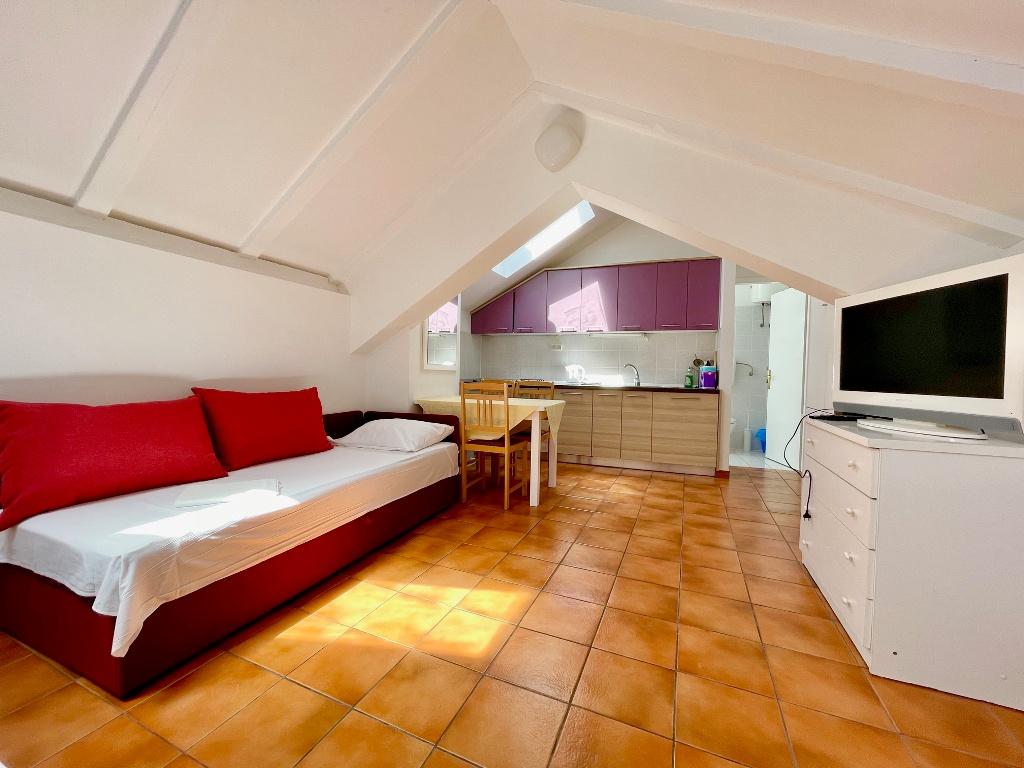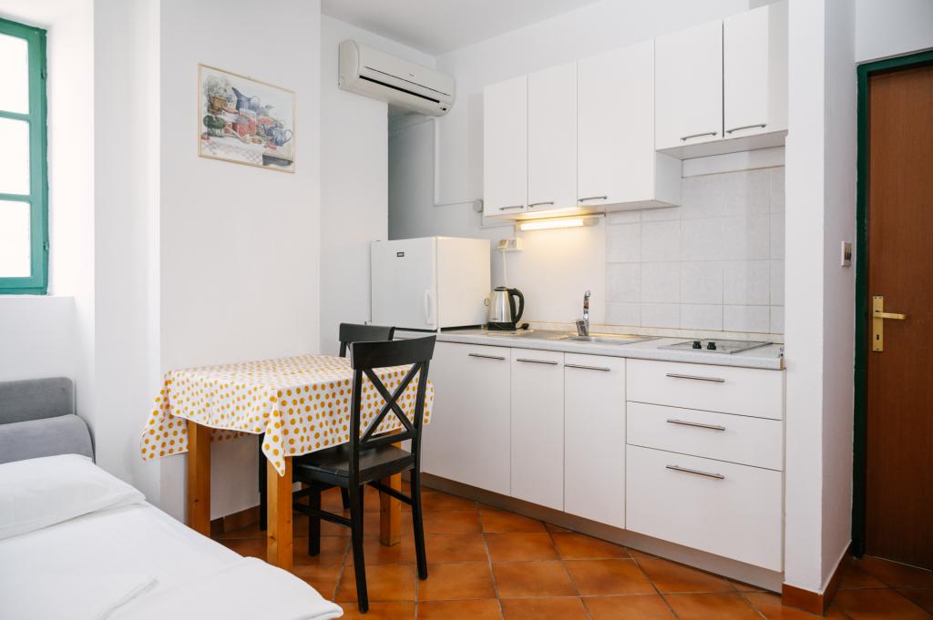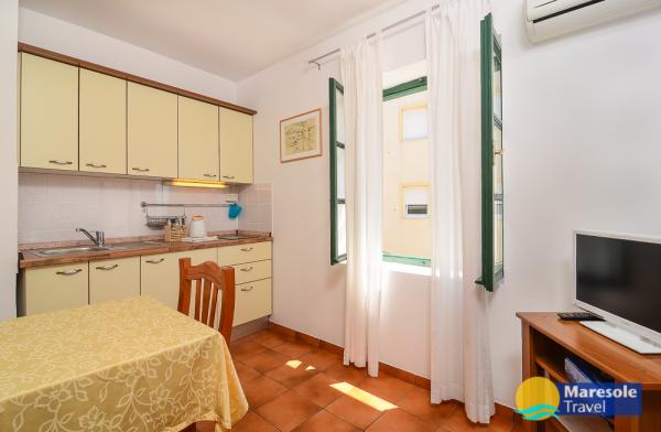 Moderní apartmány se nacházejí v prvním patře a druhém patře (horní patro) v domě v centru města, na prvním řádku na pláž, s výhledem na moře. Apartmány se skládají z obývacího pokoje s jídelnou a kuchyní v jednom prostoru, byt s balkonem s výhledem na moře, jedna ložnice s manželskou postelí, koupelna se sprchou / WC. Parkování ve veřejném prostoru v přední části domu. - Příplatek za domácí zvířata E5, 00 za den.