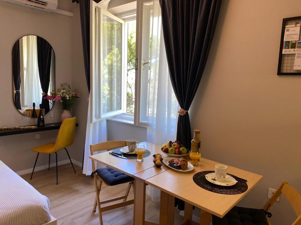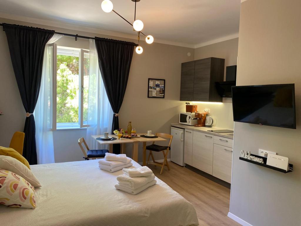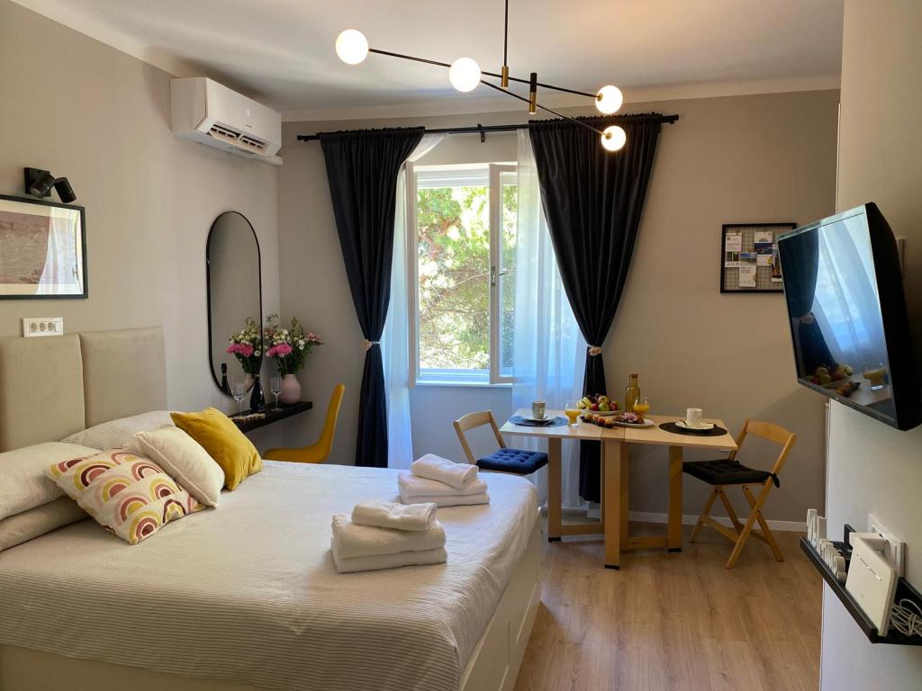 Studiový apartmán "Victor 27" je okouzlující ubytování na klidném místě v centru města v blízkosti všech zajímavých zařízení. Díky optimální poloze na začátku nábřeží se můžete vydat na dlouhé procházky, jezdit na kole nebo si užít jízdu panoramatickým vláčkem podél pobřeží Umagu. Z okna je vidět zelené borovice a v pozadí moře a starý městský přístav. Studio se nachází ve druhém patře bez výtahu. Není zde balkon. Parkování je zdarma v budově. Na předchozí žádost je možné přidat třetí lůžko pro děti a je zde také možnost použití jízdního kola (to se určuje při rezervaci).