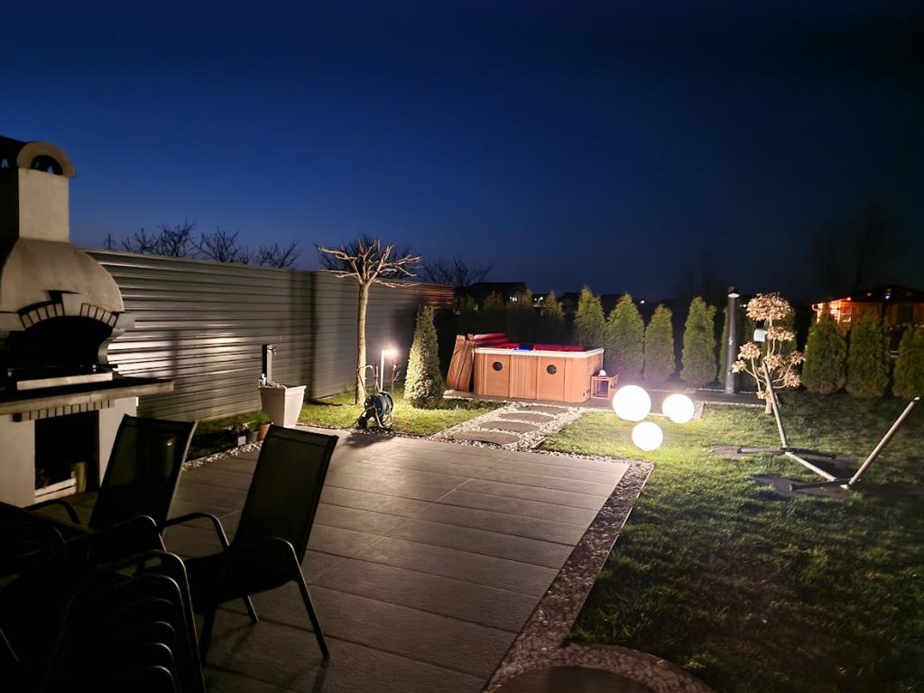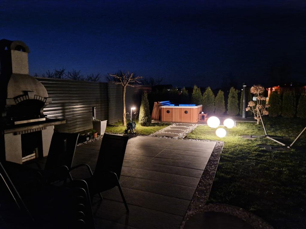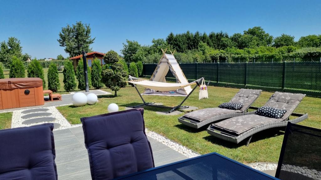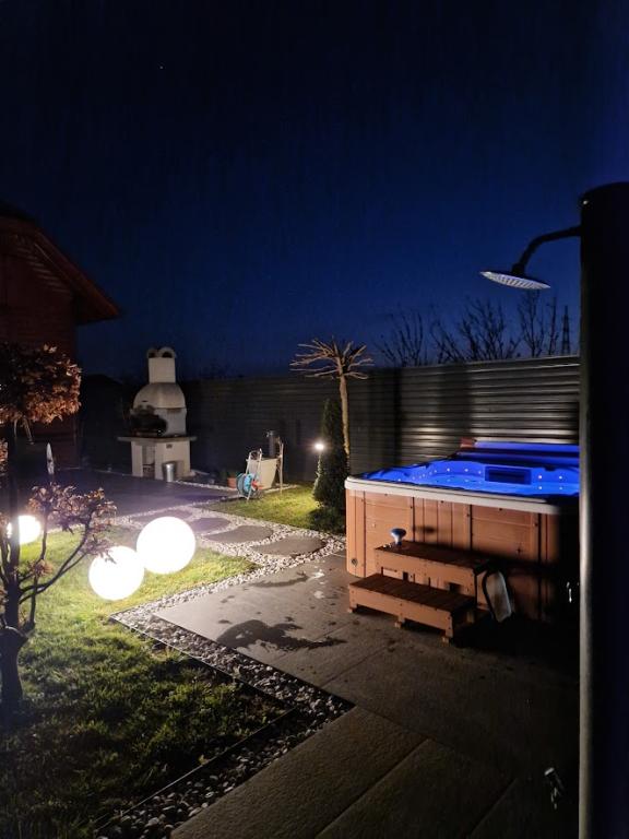 Použití jacuzzi je zahrnuto v ceně pobytu a není zpoplatněno. Vedle domu je velká terasa s grilem, lehátky, houpací sítí, solární sprchou a velkým, dobře udržovaným trávníkem. Dále je možné si zapůjčit kola (za příplatek), využít elektrické šipky, ohniště na dvorku a další sportovní potřeby, pískoviště pro malé děti, stan na hraní... Povolena jsou malá, slušně vychovaná domácí zvířata, s případným příplatkem za úklid. Dvůr je kompletně oplocený.
