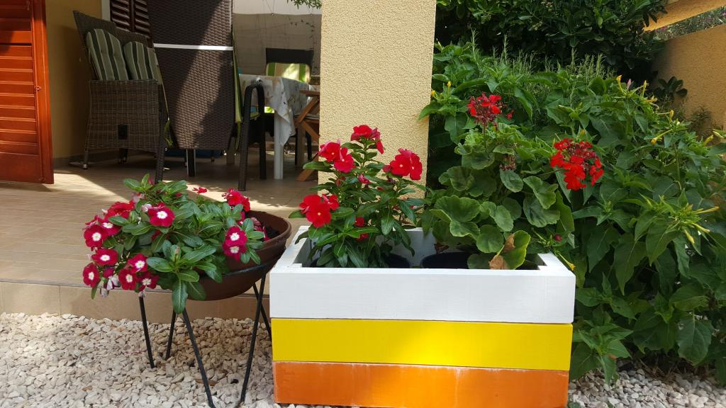 Vážení hosté, čekají na Vás dva krásně zařízené apartmány v klidné části Viru se spoustou zeleně, nedaleko centra města. Apartmány se nacházejí v prvním patře rodinného domu se samostatnými vchody. Každý apartmán má velkou terasu vybavenou stolem, židlemi a slunečníkem, kde si můžete popíjet ranní kávu a zároveň si užívat vůni středomořských bylin a zpěvu cvrčků. Parkování je zajištěno ve dvoře, stejně jako možnost využití grilu. Apartmány jsou 5 minut chůze od první pláže Lučica a deset minut od centra města, kde se konají bezplatné koncerty, a pláže Jadro. V blízkosti jsou dobře zásobené obchody, kavárny, restaurace, kluby a taverny, dětské hřiště, aquapark a četné pláže, od písečných po oblázkové a betonové, s doprovodným zařízením. Výhodou naší polohy je, že na pláž na severní a jižní straně a veškeré potřebné vybavení se dostanete pěšky. Dům se nachází na konci slepé ulice bez velkého provozu S dostatkem slunečního svitu a křišťálově čistým mořem budete mít nezapomenutelnou dovolenou.