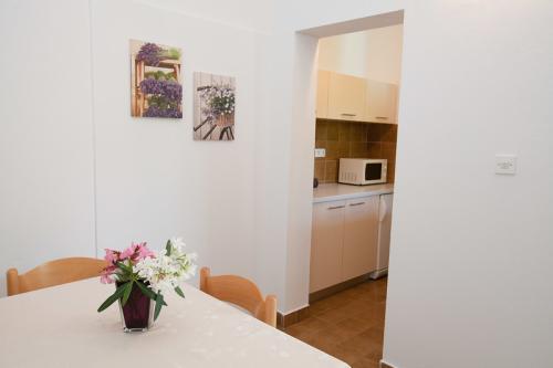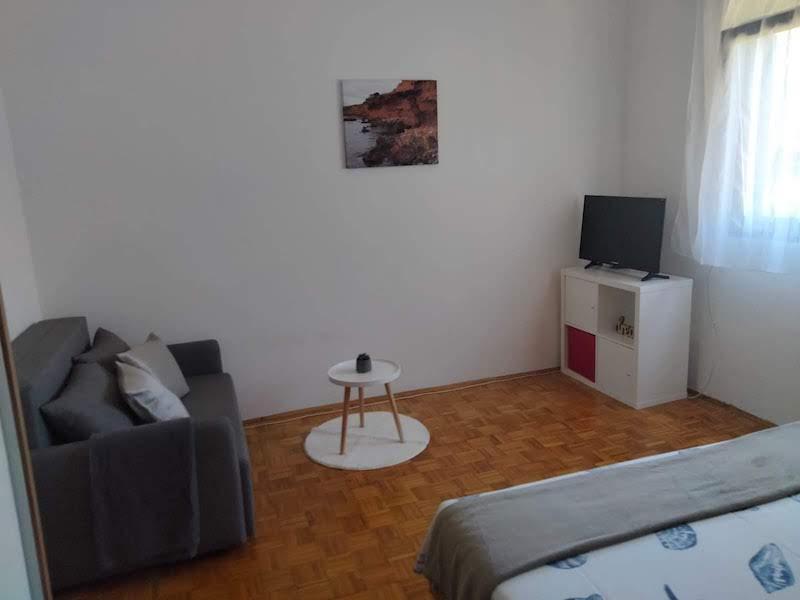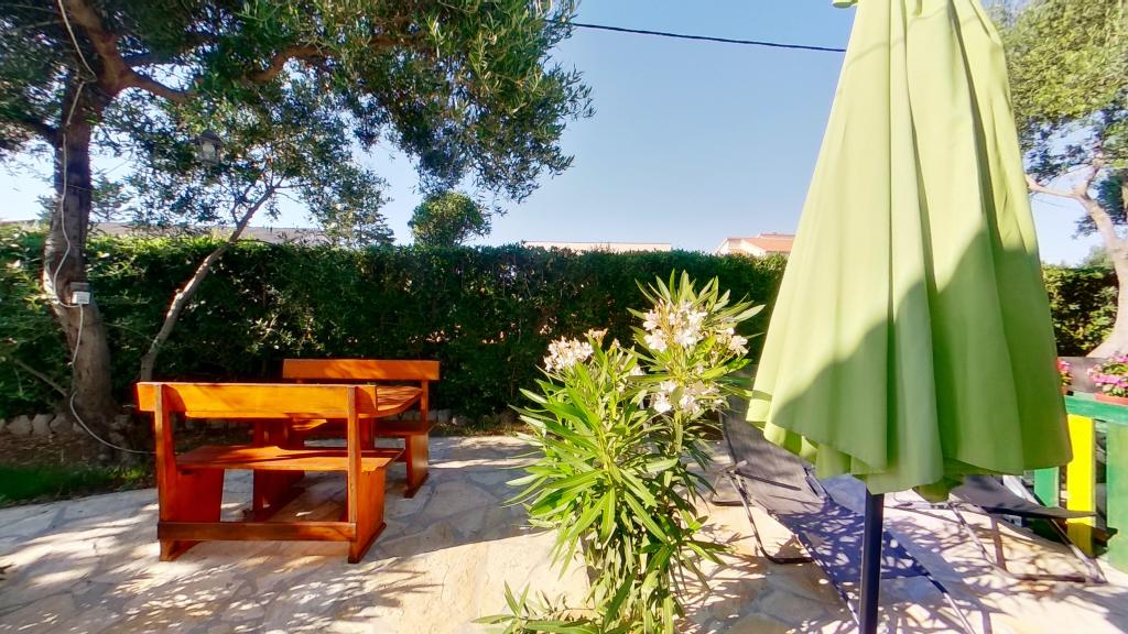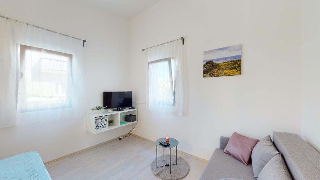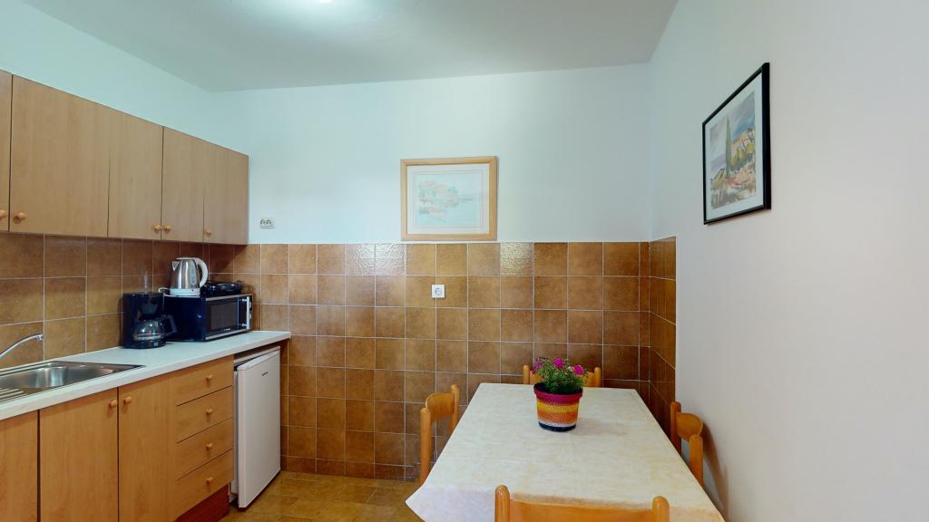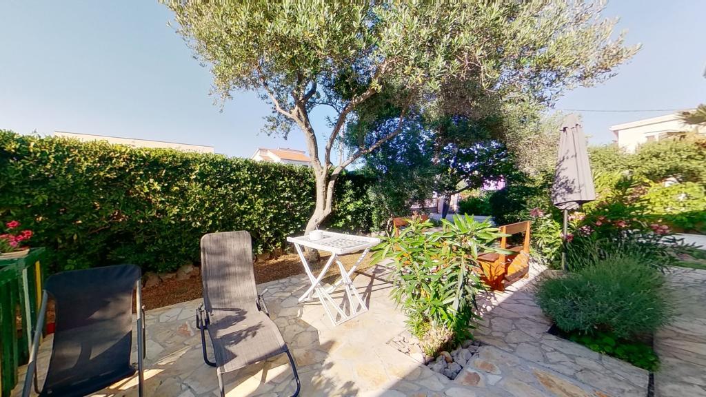 Plně zařízený apartmán v přízemí. Před apartmánem se nachází kamenná terasa o rozloze 40 m2 obklopená zelení. Parkování a gril ve dvoře budovy. Vše pro příjemný pobyt je k dispozici v okruhu 250 m: pláž, centrum, trh, restaurace.