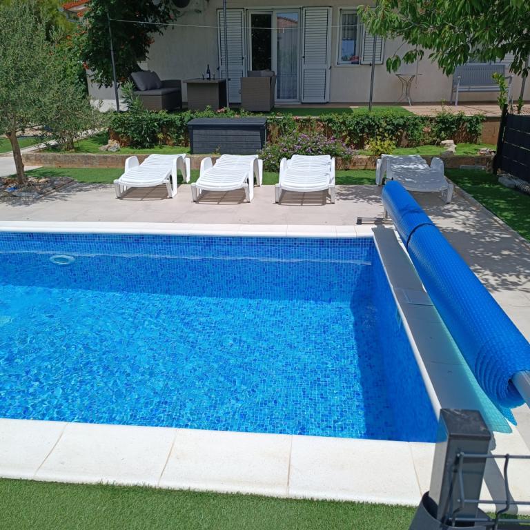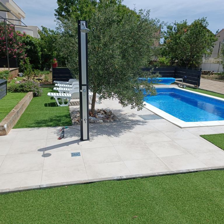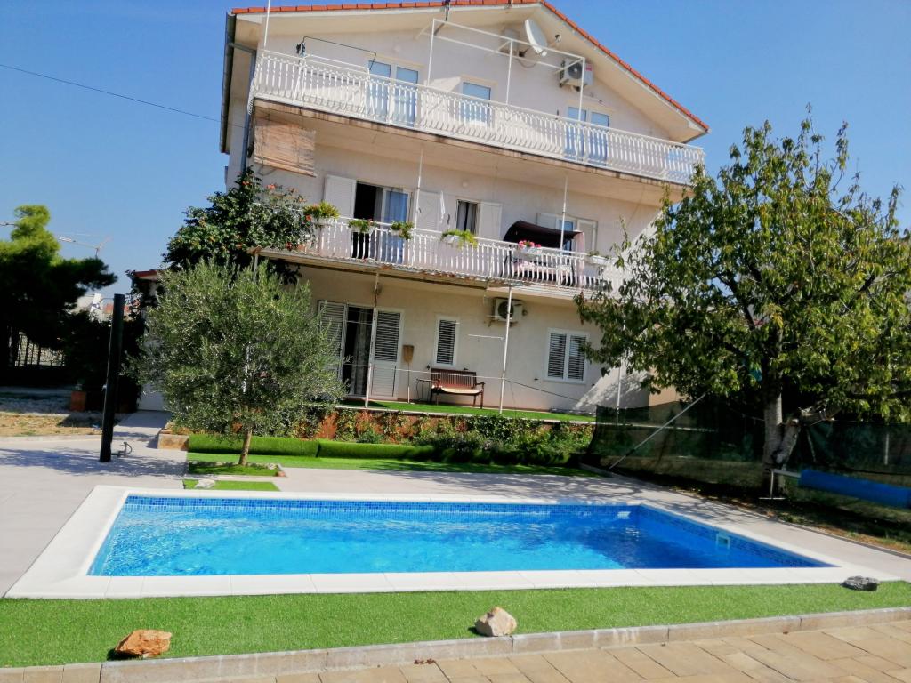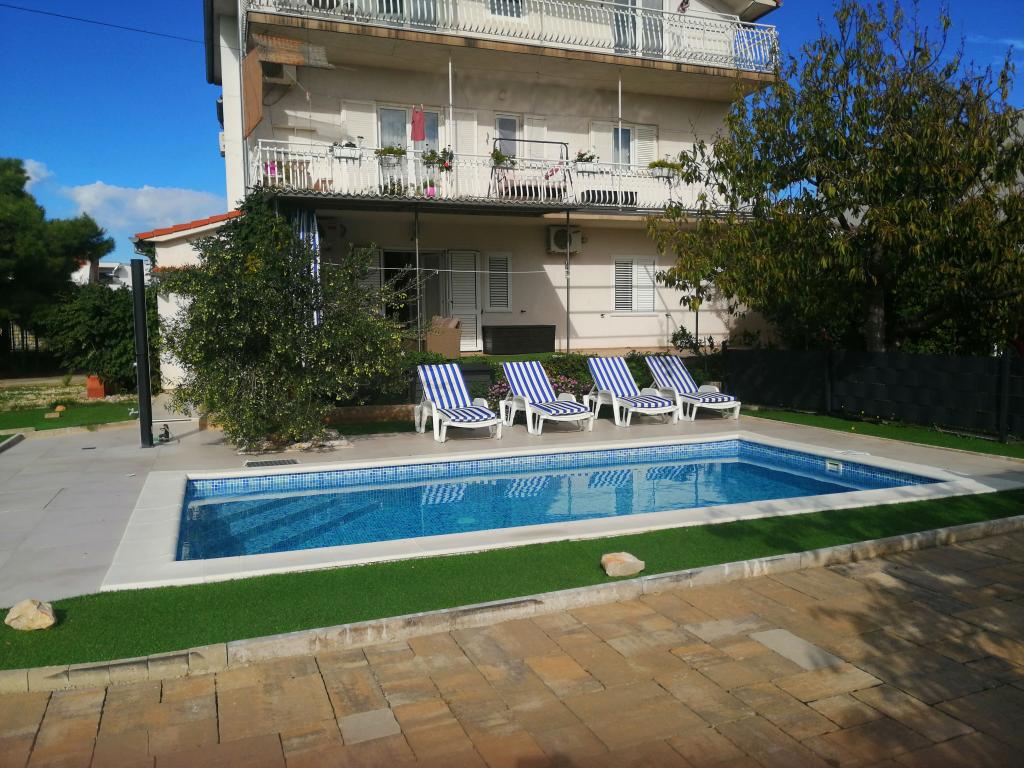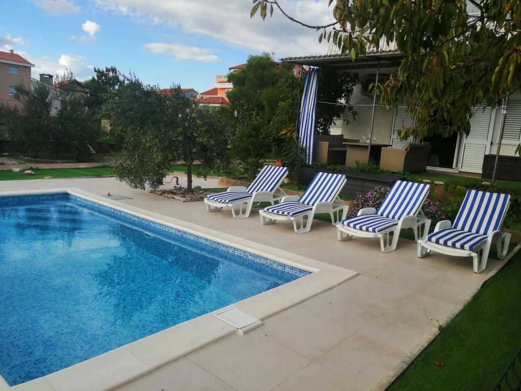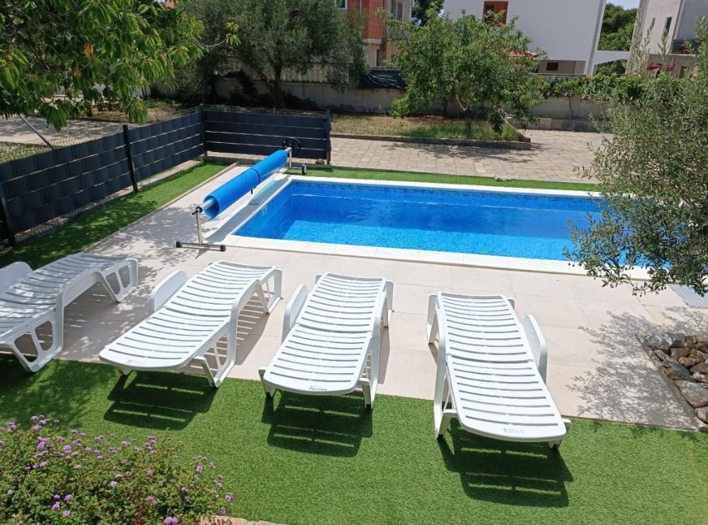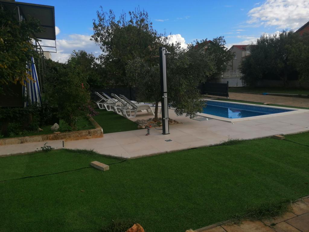 Nově zrekonstruované velké apartmány s venkovním BAZÉNEM JEN PRO VÁS!! JAKO V DOVOLENKOVÉM DOMĚ!! Kompletně NOVĚ ZREKONSTRUOVANÁ kuchyně s novými spotřebiči (lednice, mrazák, trouba, varná deska, mikrovlnná trouba, varná konvice, myčka nádobí, pračka, digestoř). Nádobí a kuchyňské náčiní. Obývací pokoj s rohovou pohovkou, kterou lze v případě potřeby rozložit na prostornou postel. Nová televize se satelitními programy. Ložnice s prostornými manželskými postelemi. Ložní prádlo. Všechny pokoje jsou klimatizované. Dvě koupelny s WC a sprchovými kouty, nově zrekonstruované. Pračka, žehlicí potřeby, fén. Vysavač a čisticí prostředky, toaletní papír, mýdlo, ručníky. K dispozici je také 30 m2 terasa se zahradním nábytkem, stejně jako gril, lehátka u bazénu. Obrovská zahrada o rozloze 1300 m2 s množstvím středomořských stromů. Parkování ve dvoře ZDARMA!!. Letiště Zadar a Split jsou vzdálena asi 60 km. V blízkosti národního parku Krka a Kornati.