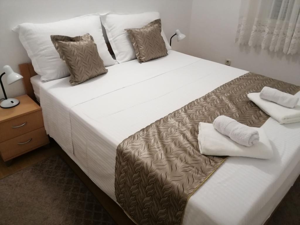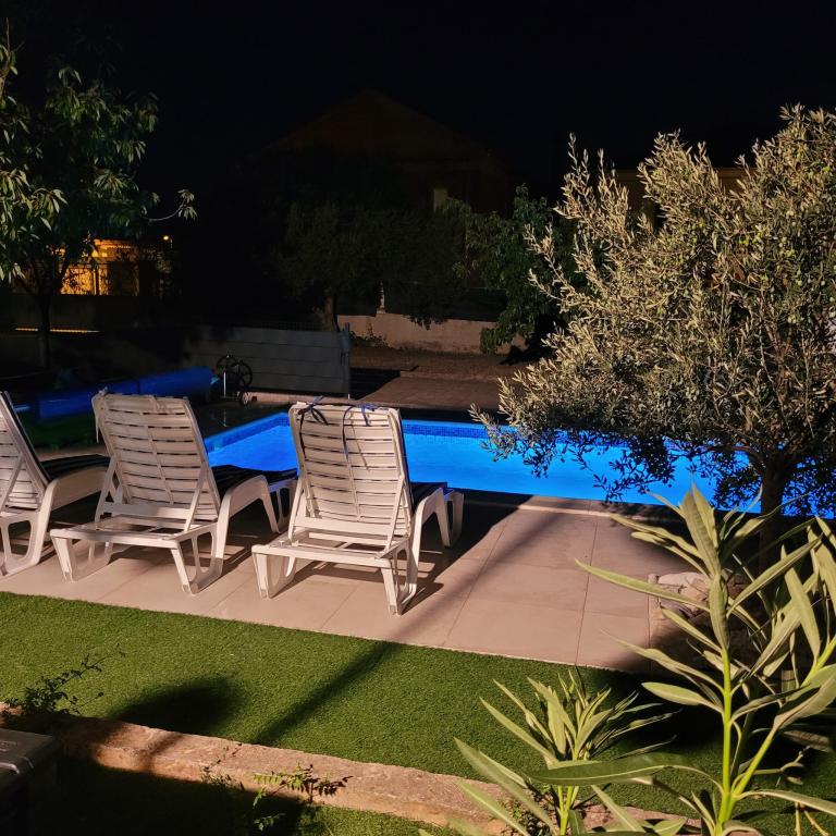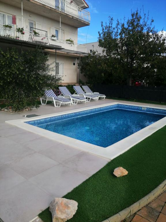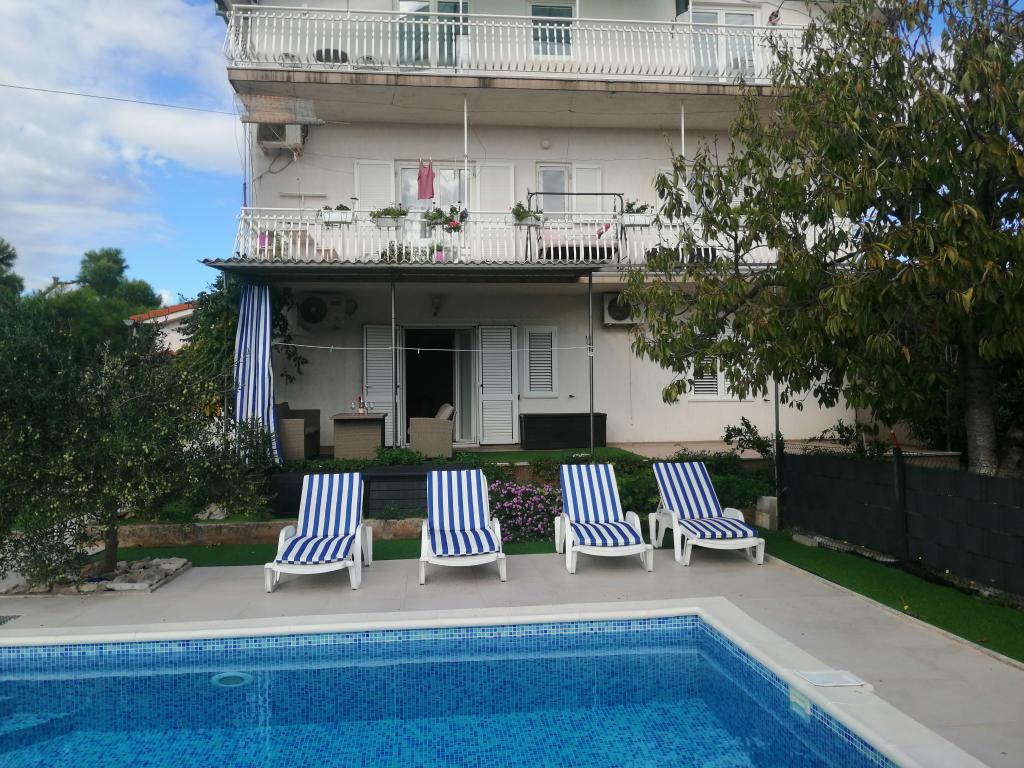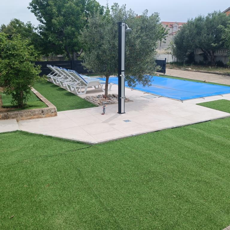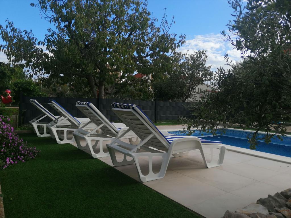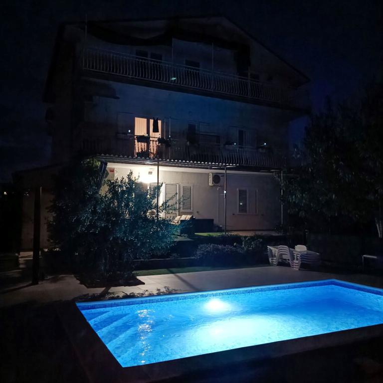 Nově zrekonstruované velké apartmány s venkovním BAZÉNEM JEN PRO VÁS!! JAKO V DOVOLENKOVÉM DOMĚ!! Kompletně NOVĚ ZREKONSTRUOVANÁ kuchyně s novými spotřebiči (lednice, mrazák, trouba, varná deska, mikrovlnná trouba, varná konvice, myčka nádobí, pračka, digestoř). Nádobí a kuchyňské náčiní. Obývací pokoj s rohovou pohovkou, kterou lze v případě potřeby rozložit na prostornou postel. Nová televize se satelitními programy. Ložnice s prostornými manželskými postelemi. Ložní prádlo. Všechny pokoje jsou klimatizované. Dvě koupelny s WC a sprchovými kouty, nově zrekonstruované. Pračka, žehlicí potřeby, fén. Vysavač a čisticí prostředky, toaletní papír, mýdlo, ručníky. K dispozici je také 30 m2 terasa se zahradním nábytkem, stejně jako gril, lehátka u bazénu. Obrovská zahrada o rozloze 1300 m2 s množstvím středomořských stromů. Parkování ve dvoře ZDARMA!!. Letiště Zadar a Split jsou vzdálena asi 60 km. V blízkosti národního parku Krka a Kornati.