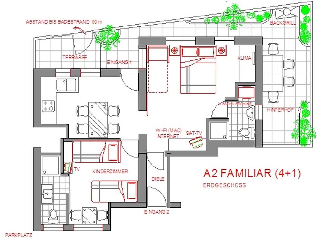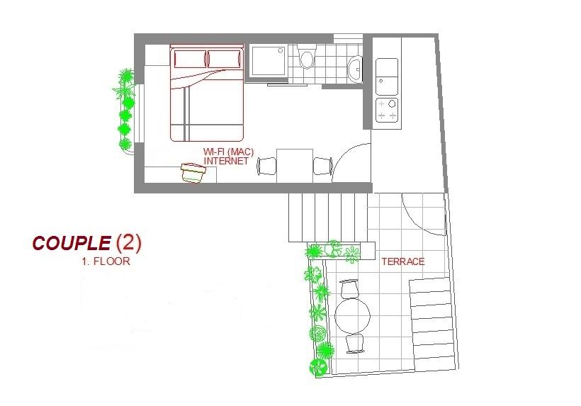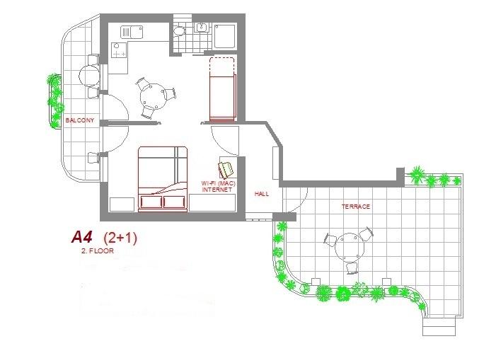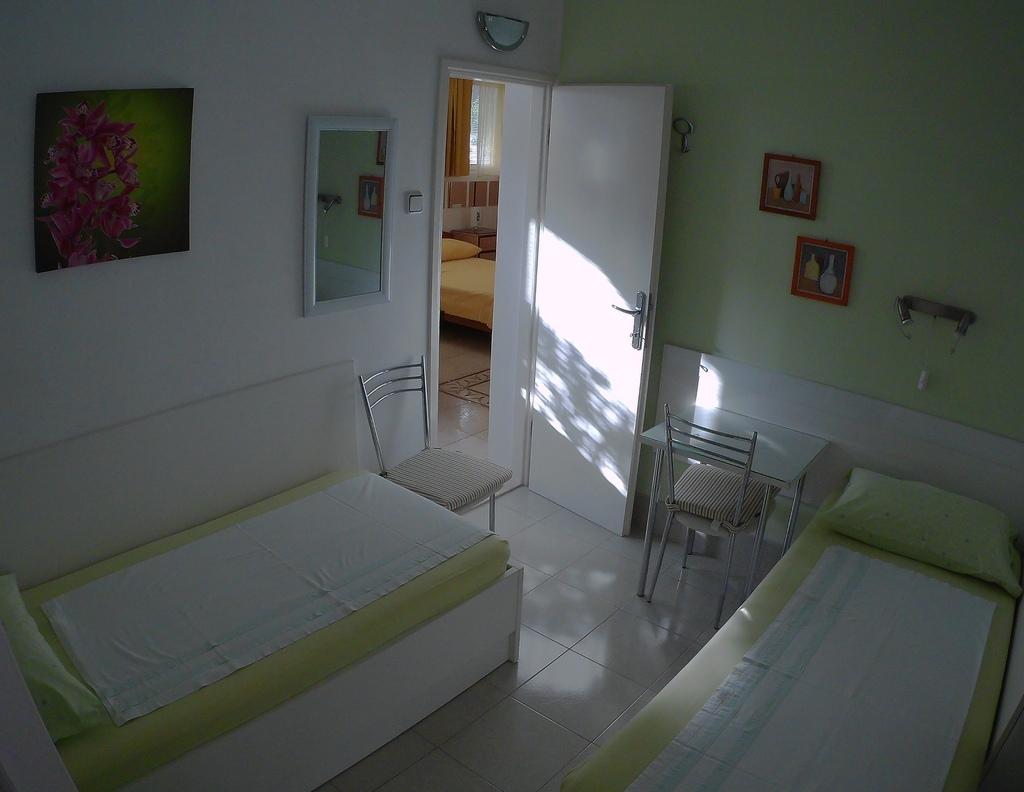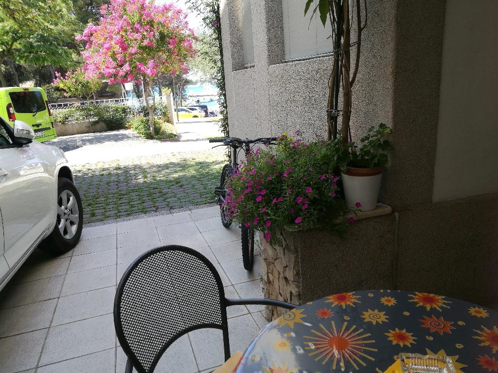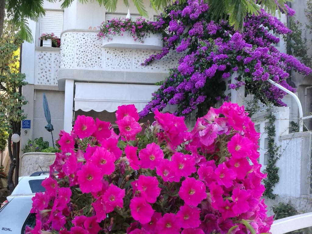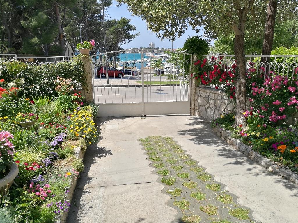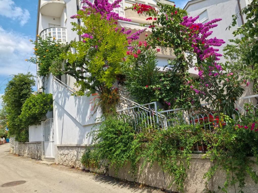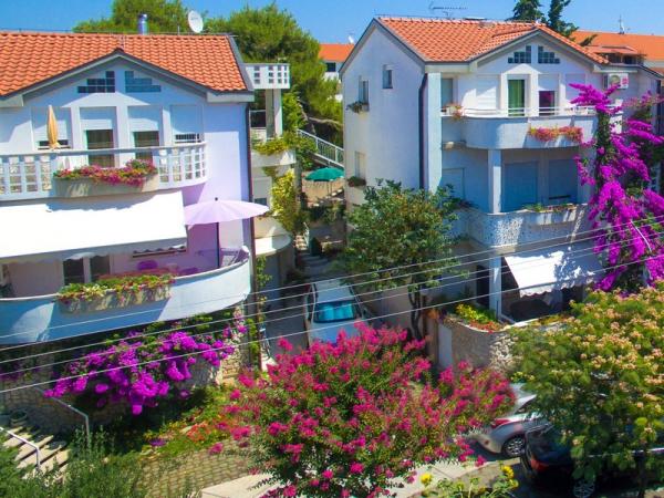 Jen čtyřicet metrů od pláže, v první řadě k moři, máte to pravé místo k odpočinku. Apartmány v květinách, s výhledem na moře, mají samostatné vchody, klimatizaci, wi-fi, televizi a hlídané parkování ve dvoře. Apartmán A2 v přízemí je tou pravou volbou pro dovolenou rodin se 4-5 osobami. Byt má 2 koupelny s okny, 2 TV, myčku, pračku a samostatný dvůr za domem pro venkovní bydlení. Na dvoře je gril, stůl se židlemi a deštníkem a linka na sušení prádla. Apartmán A3 v přízemí je dobrou volbou pro dovolenou pro 2 až 3 osoby. Má přístupnou květinovou lodžii se stolem pro venkovní bydlení s výhledem na moře. Apartmán A4, ve druhém patře, pro 2-3 osoby, má velkou terasu a balkon s výhledem na moře a město. Terasa je krytá a vybavená venkovním nábytkem. Apartmán Couple v 1. patře je ideální pro páry. Krytá terasa má stálé proudění vzduchu a pěkný výhled.