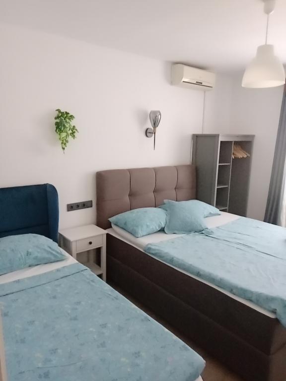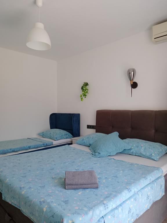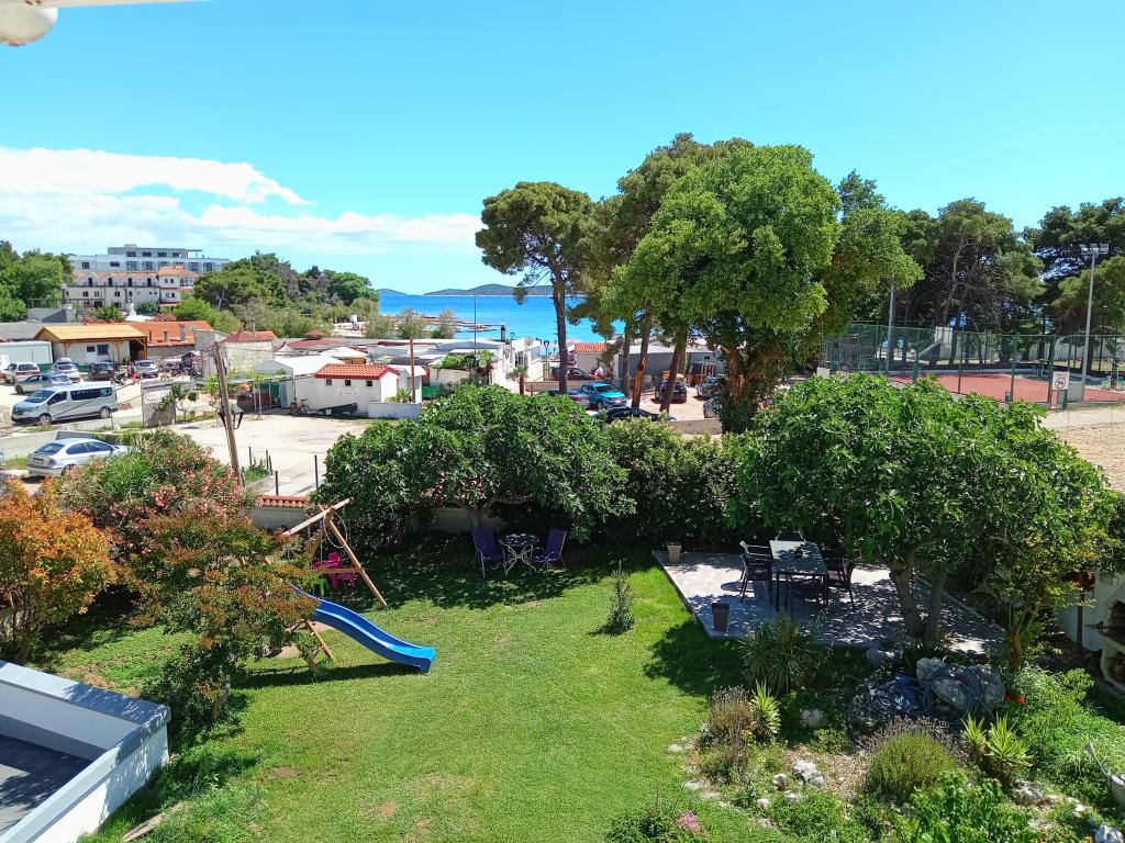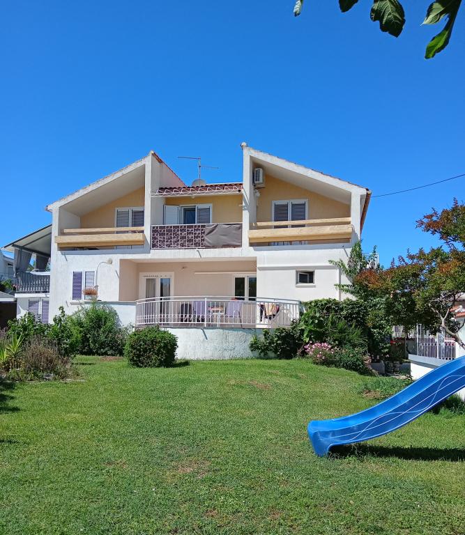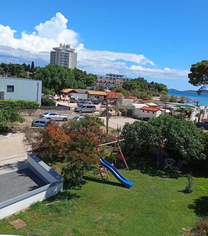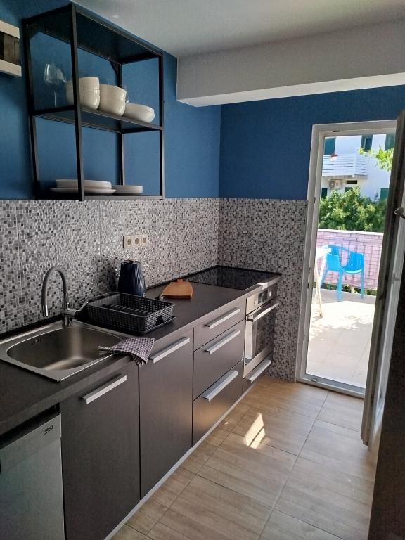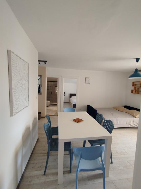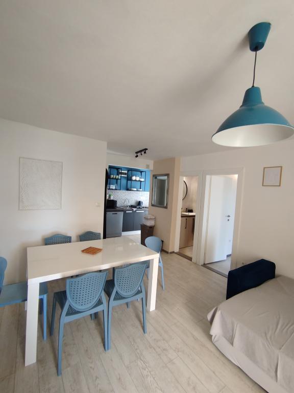 Apartments Blue Beach, který se nachází v klidné části města, na pláži, nábřeží. Do centra a další zařízení se nachází pouhých 5 minut pěšky. Všechny apartmány mají výhled na moře, borovými lesy a krásnou zahradou. Apartmány jsou vkusně zařízené s veškerým potřebným vybavením. Možnost využití, zahrada, gril a dětské hřiště. Parkování ve dvoře.