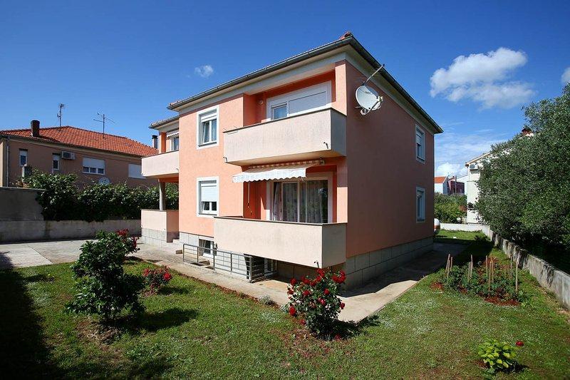 Dům se nachází v turistické části Zadaru, Borik, kde se nacházejí hotely FALKENSTAINER skupiny, které mají písčitou pláž a vodní park a je k dispozici s platbou. V ulicích jsou všechny základní vybavení od supermarkety, restaurace a zábavní park pro děti. Dům a zahrada má spoustu místa pro děti na hraní, grilování je v provozu s velkým dřevěným stolem a lavicemi pro relaxaci a speciality z grilu až do pozdních nočních hodin. V bytě je velký a pohodlný jsme blízko k pláži (3) 200 m. Byt se skládá ze tří ložnice se dvěma lůžky, velký obývací pokoj s kuchyní, koupelna, WC, malý a velký balkon pro ranní kávu a my DIJECIJE lůžko pro páry s malými dětmi Můžeme ubytovat 6-8 osob
