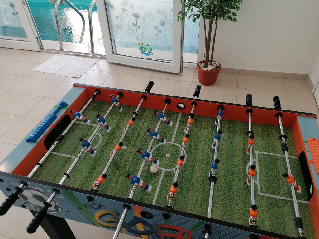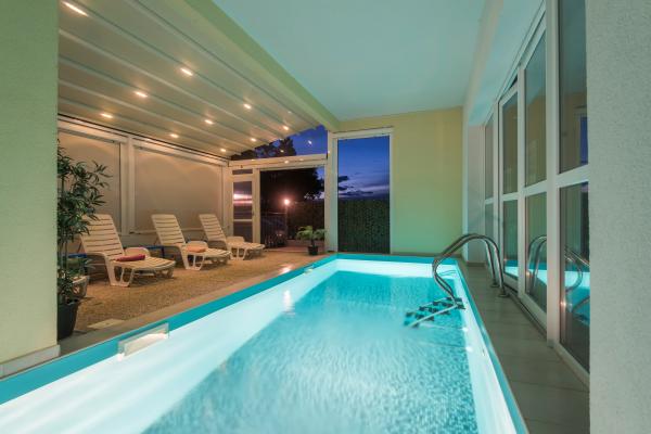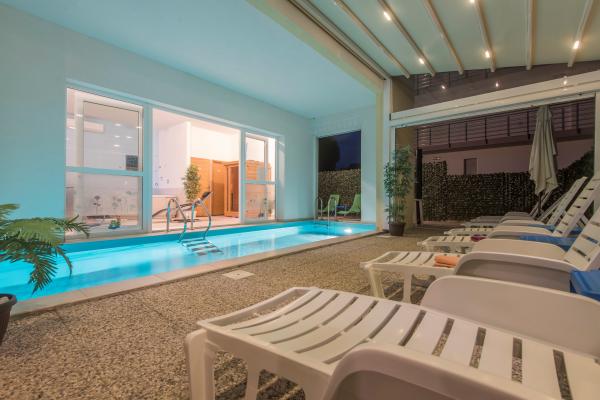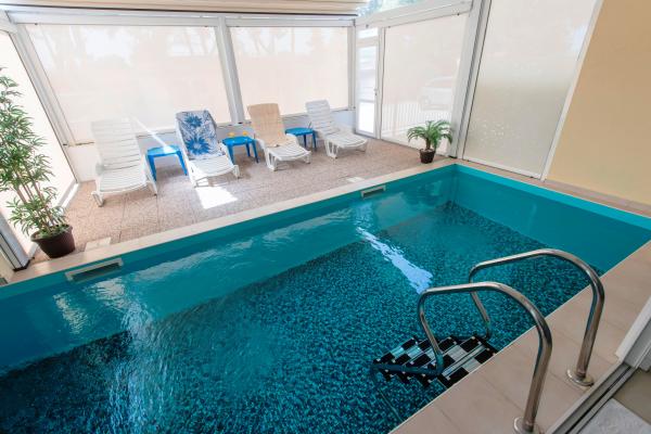 Vyhřívaný bazén lze snadno přestavět na krytý bazén, což je v chladnějším počasí velmi příjemné. Bazén a wellness (vířivka, sauna, posilovna, stolní fotbal) využívají 3 apartmány, každý apartmán má svou vlastní soukromou dobu užívání dle rozvrhu, který se střídá každý den, 210 minut denně na apartmán, což zajišťuje naprosté soukromí pro hosty a hygienu prostoru. Pohovka v obývacím pokoji se dá rozložit na postel pro dvě osoby. K dispozici je dětská postýlka. Vybavení: pračka, myčka nádobí, mikrovlnná trouba, trouba, indukční varná deska, lednice s mrazákem, varná konvice, kávovar na filtrovanou kávu, kávovar DolceGusto, toustovač, žehlička a malé žehlicí prkno. Ložní prádlo, ručníky a spotřební materiál (tablety do myčky a pračky, toaletní papír, tekuté mýdlo, sprchový gel) jsou v ceně.