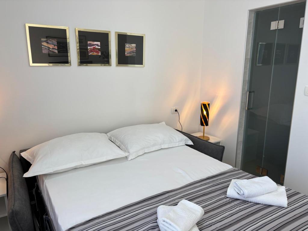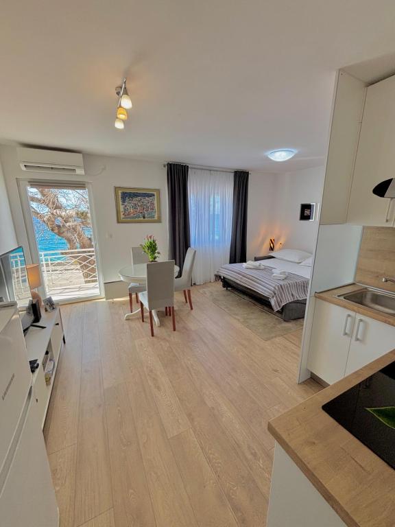 Studiový apartmán je plně a moderně vybavený v prvním patře rodinného domu, který je 30 m od moře a krásné oblázkové pláže s pozvolným vstupem do moře. Před domem je parkování pro auto a na dvoře je altán s grilem a stoly pro posezení ve stínu. V blízkosti se nacházejí obchody, restaurace, cukrárna a u vjezdu do města se nachází nákupní centrum Plodine.
