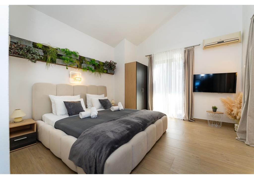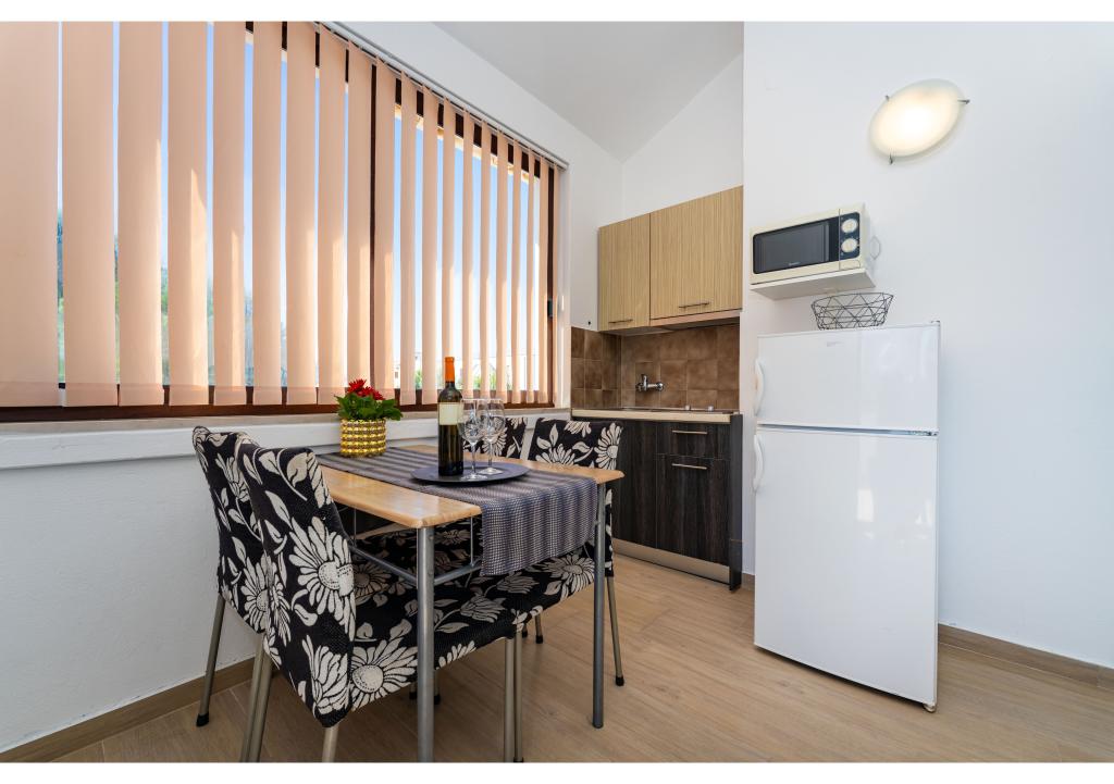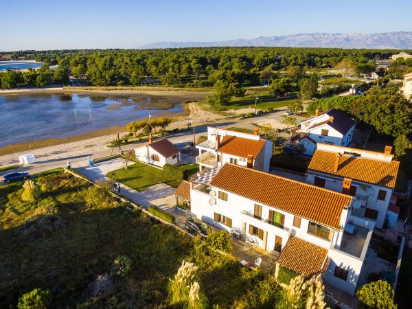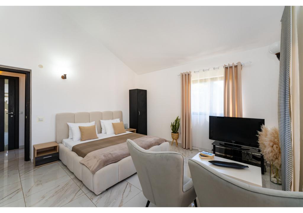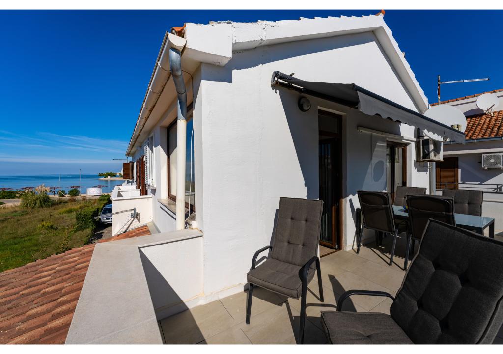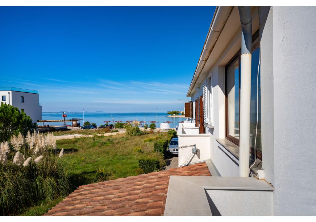 Apartmány první řada k moři. Terasa s výhledem na moře. Zátoka je písčitá a mělká. Apartmány se nacházejí v blízkosti turistického centra Zaton a jsou vybaveny klimatizací, internetem, satelitní TV, parkovištěm, grilem atd.