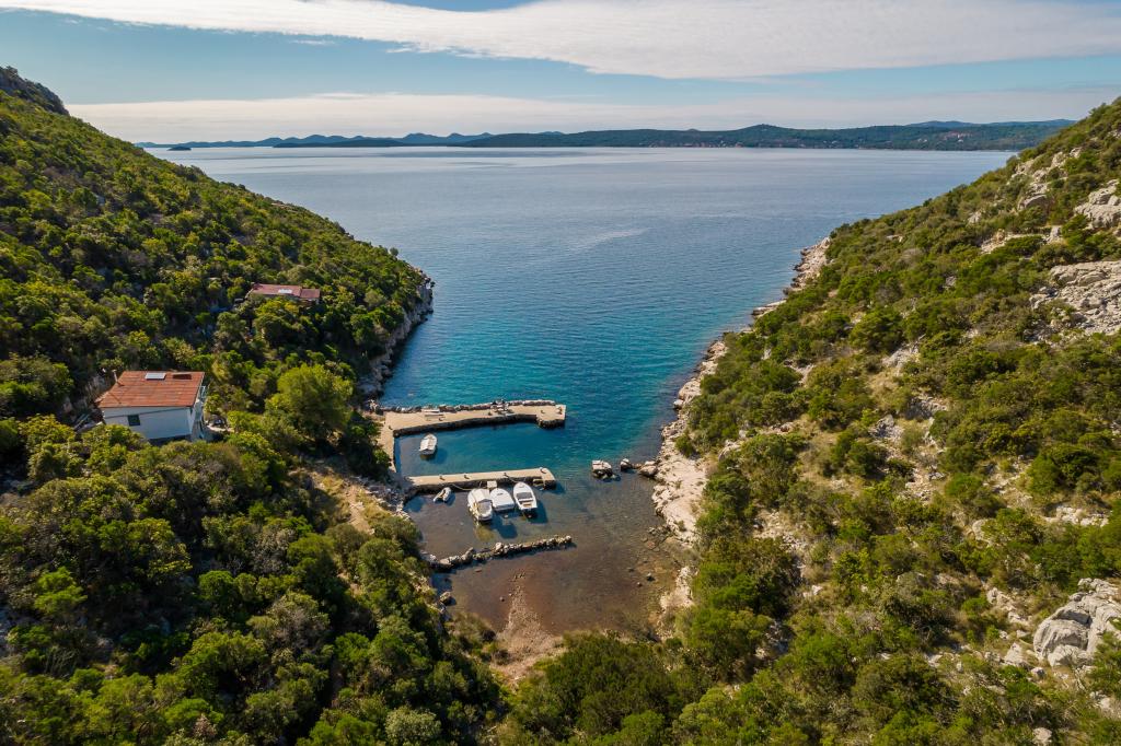 Dům se nachází na ostrově Ugljan v malé chráněné zátoce. Má terasu s výhledem na jihozápad a ostrov Iž. K domu vede cesta a na konci bílé cesty zaparkujete auto a pak máte dalších 10 minut chůze po stezce. V domě je voda a alternativní zdroj energie, t.j. má solární elektřinu na 12 V. Možnost nabíjení malých spotřebičů jako jsou mobilní telefony apod. Dům je ideální pro ubytování 2 osob. Poloha domu je taková, že se v přírodě cítíte zcela svobodně a užíváte si klidnou dovolenou. Pokud máte loď nebo motorový člun, máte také kotviště a pobyt si můžete zorganizovat dle libosti.