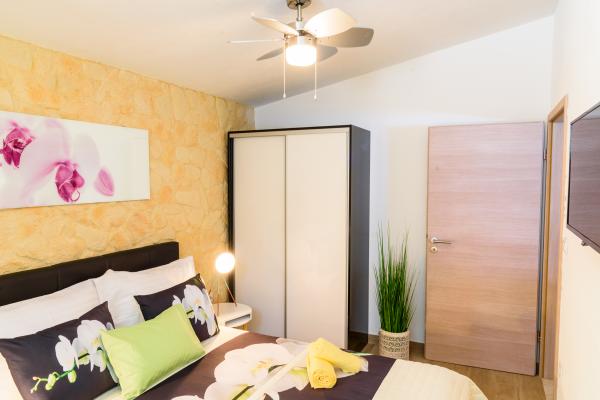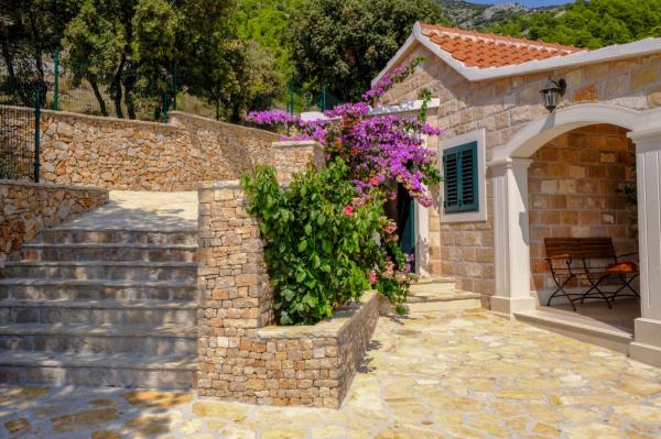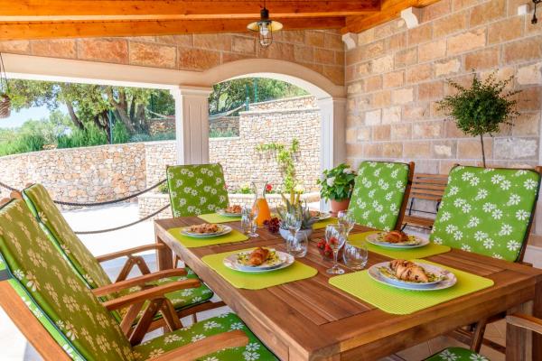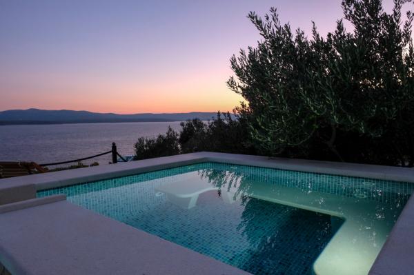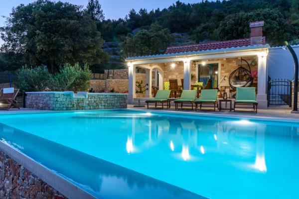 Pobytová taxa je v ceně.Vila je nově postavený dům (2017) plný veškerého vybavení, které potřebujete pro příjemnou a příjemnou dovolenou. Vila má pračku, žehličku, žehlicí prkno, vysoušeč vlasů, myčku nádobí, trezor, alarm, mikrovlnnou troubu, sporák, troubu, klimatizaci, tři plazmové televize, pohodlný venkovní prostor s krásným grilem, sluneční terasu pro relaxaci vyhřívaný bazén a masáž jacuzzi. Přijďte si k nám užít letní prázdniny! Tato část Bolu, jak uvidíte, je velmi nádherný výhled z vily je neuvěřitelný. Jsou obklopeny našimi vinicemi a olivovníky s výhledem na Bračský kanál (moře) s krásnými západy slunce a slunečními paprsky, je to velmi soukromé a odlehlé, auto není nutné, ale bylo by hezké ho mít. Přijďte se přesvědčit o této KRÁSCE!