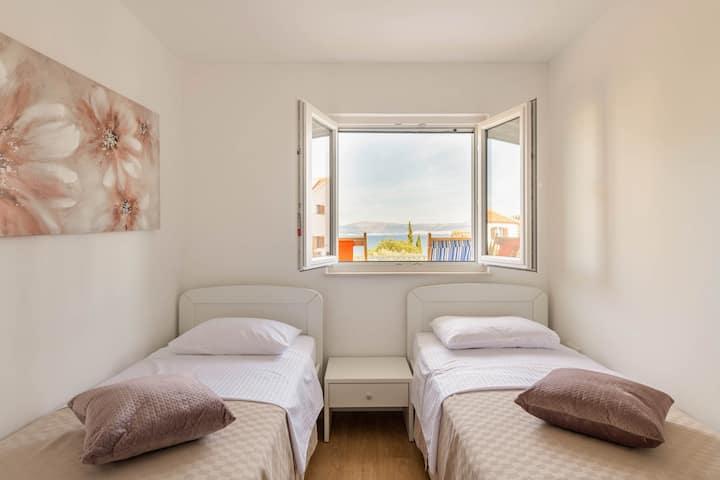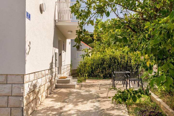 Nově zrekonstruovaný rekreační dům v centru Sutivanu, pár minut od pláže s krásným výhledem na moře. Zahradní dům Sutivan se nachází na pozemku 800m2 s prostornou středomořskou zahradou a pojme 8+1 hostů ve 4 ložnicích. Přízemí dominuje velký otevřený obývací pokoj/jídelna s krbem pro chladnější noci a plně vybavená kuchyň s troubou a myčkou. Z obývacího pokoje je vstup na venkovní jídelní terasu s výhledem na moře a lehátka. Na stejném patře je ložnice se dvěma samostatnými lůžky a koupelna se sprchovým koutem. Schody vedou do horního patra se třemi ložnicemi (dvě s manželskou postelí a balkonem, jedna se dvěma samostatnými lůžky) a dvěma koupelnami. V suterénu je stolní fotbal a konzolový hráč s další koupelnou s pračkou. Parkování pro dvě auta přímo u vchodu do domu, venku je tradiční gril s přídavným stolem a židlemi. V zahradě jsou olivovníky a velký fíkovník, přístup na pláž přes zahradu.